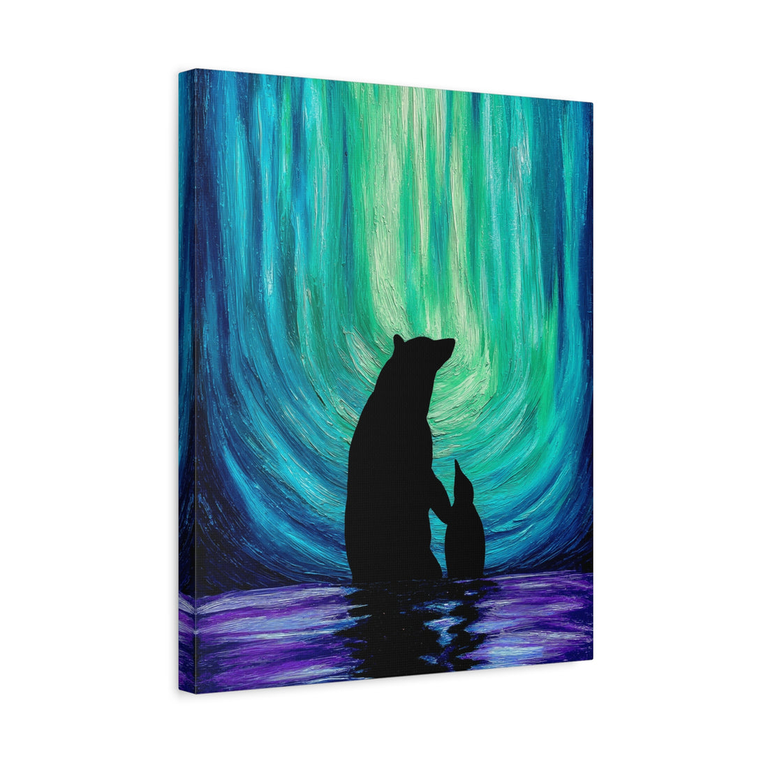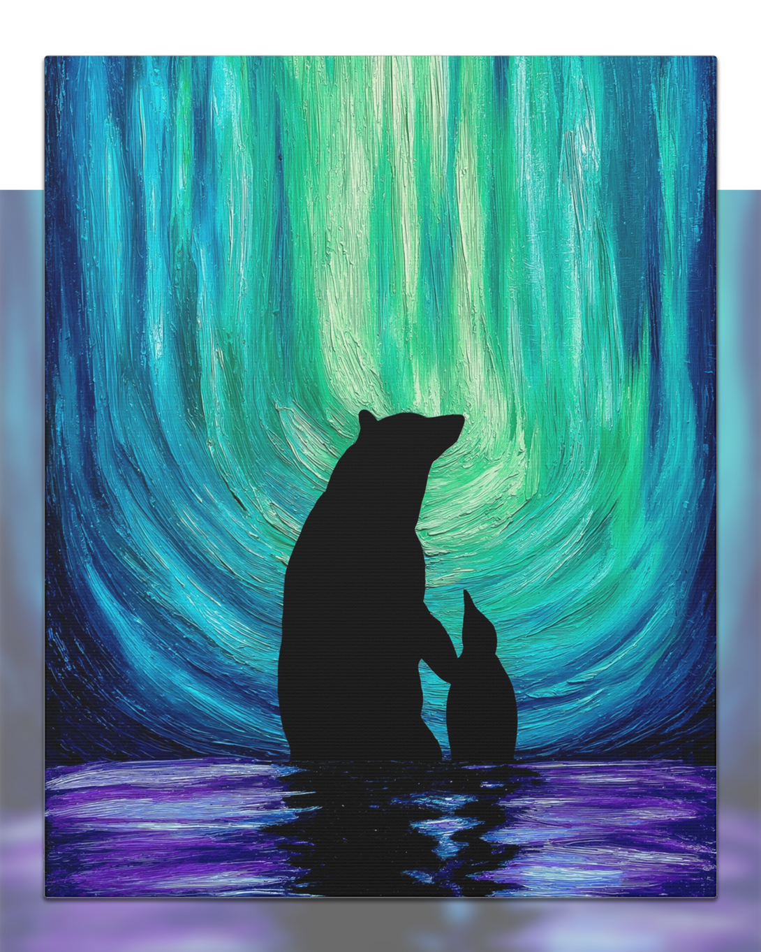 A frozen night at the top of the world. Curtains of northern lights ripple over still water while a bear and a penguin (yes, besties) sit shoulder-quiet and just… enjoy it. Cold air, warm company, zero small talk, dreamy and calm for rooms that like silence with a view.