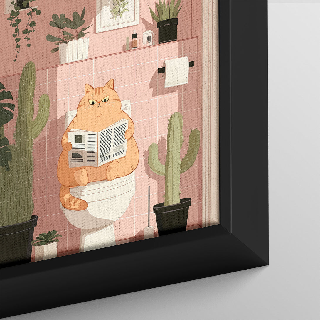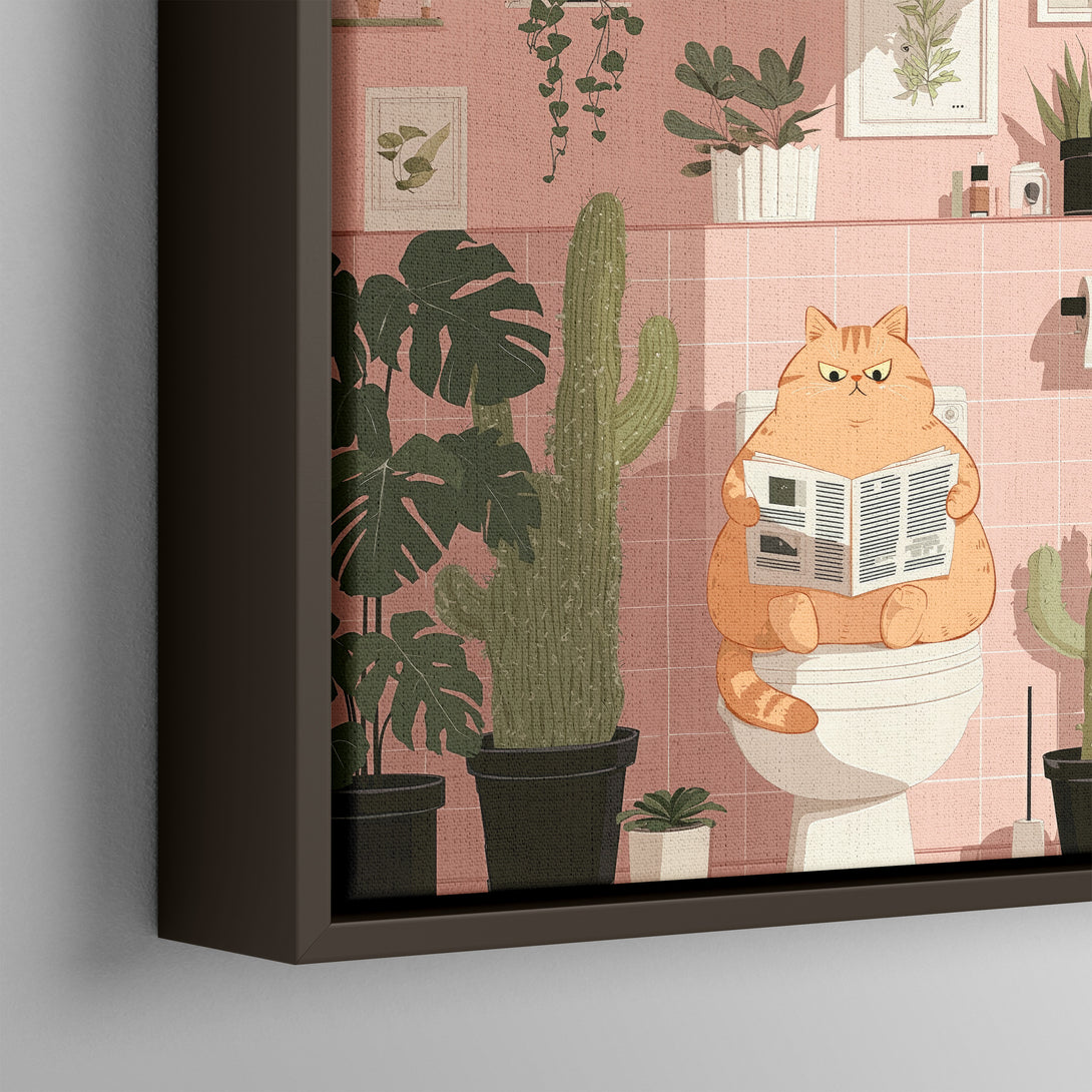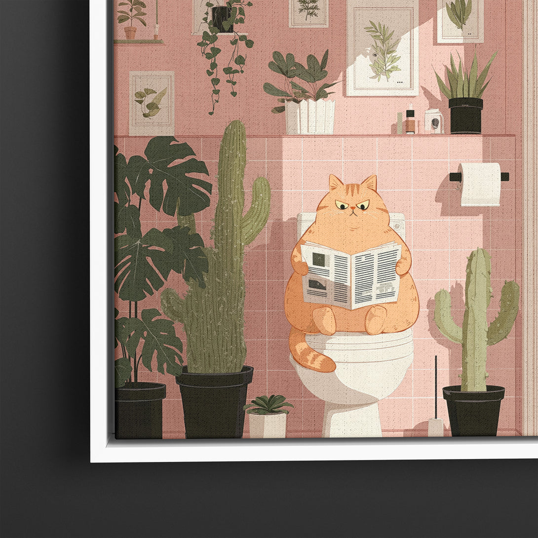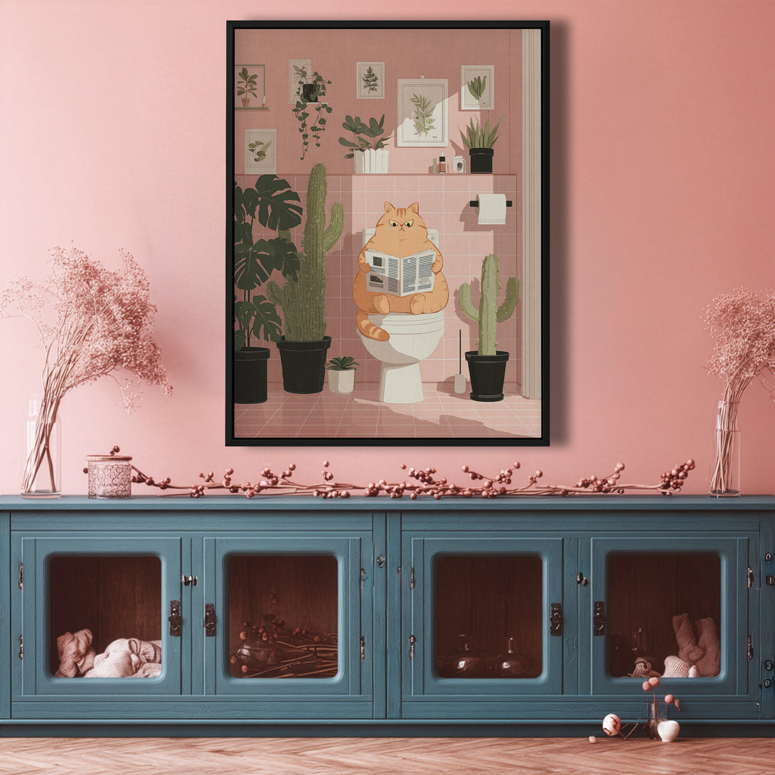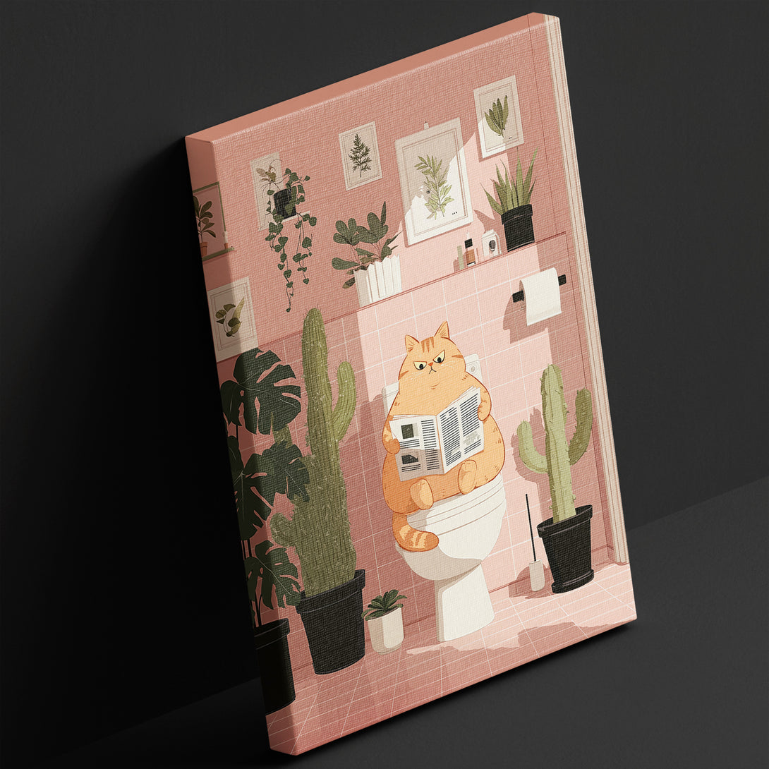 Soft pastels, plants, and one unimpressed ginger, perfect bathroom humor that still feels calm and tidy. A lighthearted focal piece for guest baths and powder rooms. Limited Release.