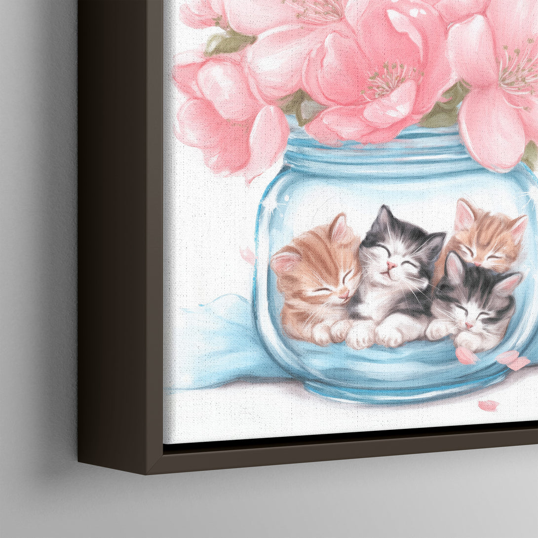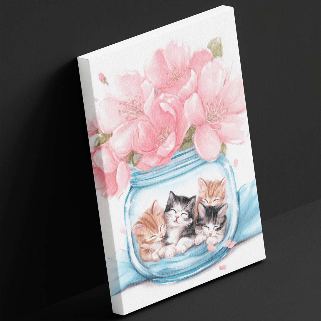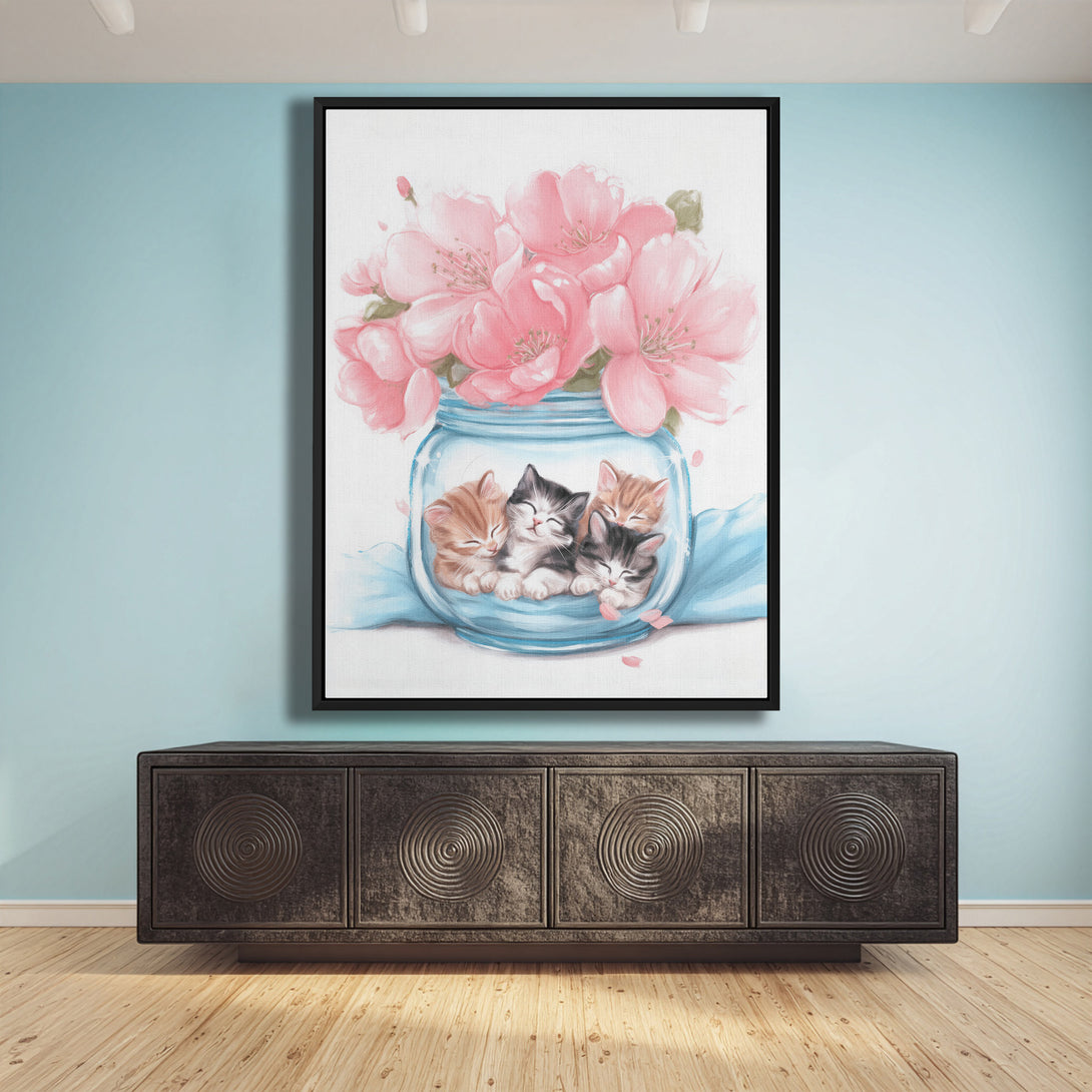 Soft pink blossoms and four tiny sleepers in a blue glass jar, pastel calm for spaces that need a smile. Limited Release.