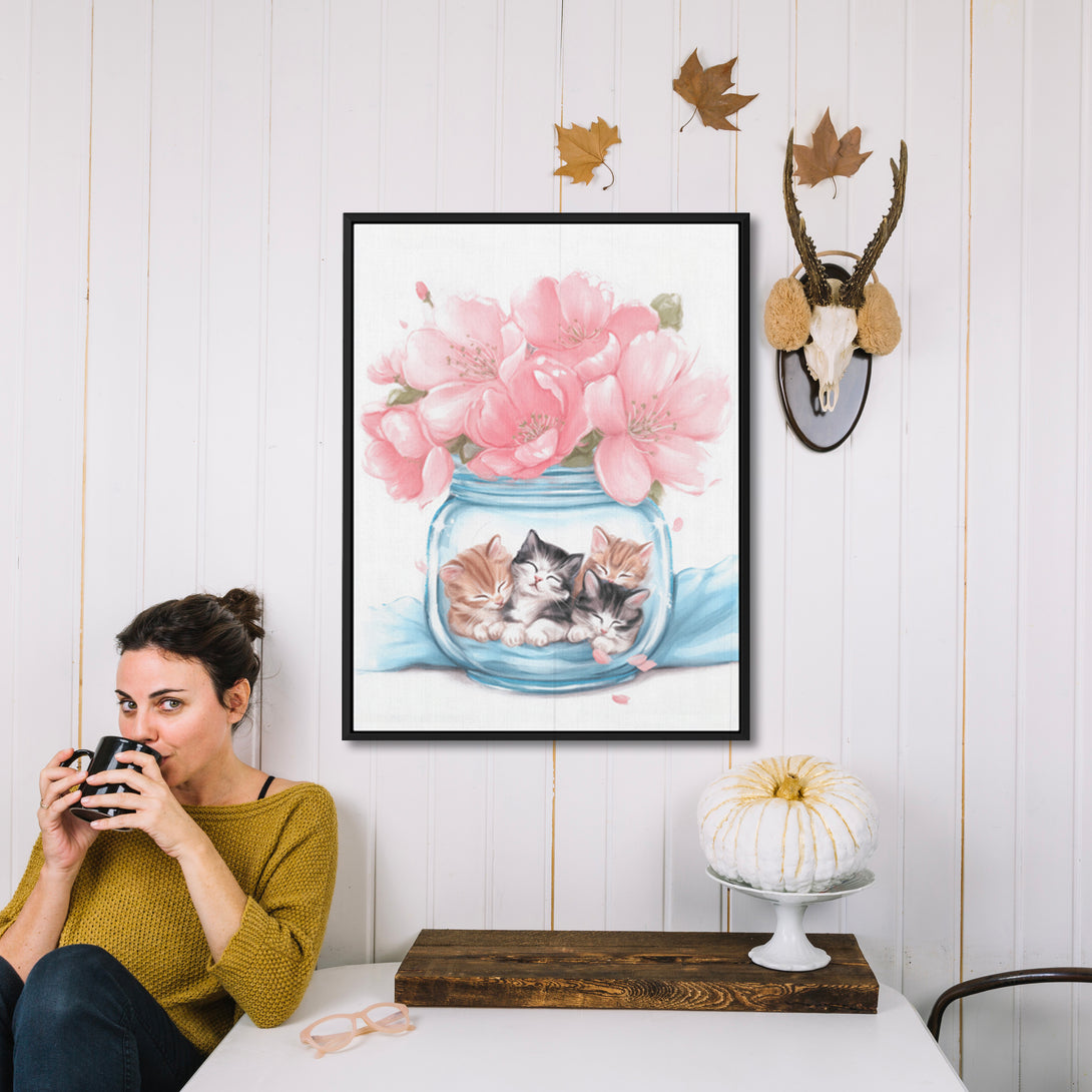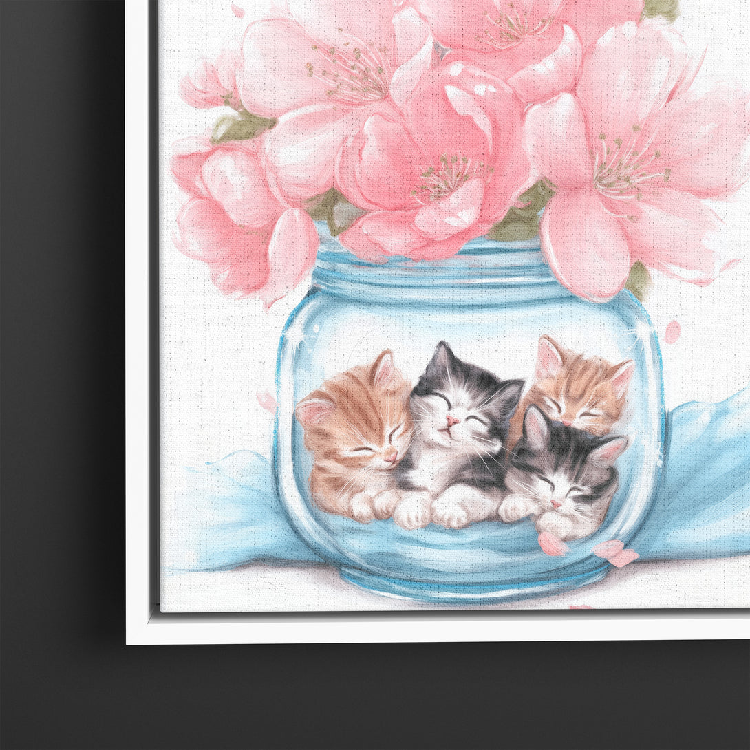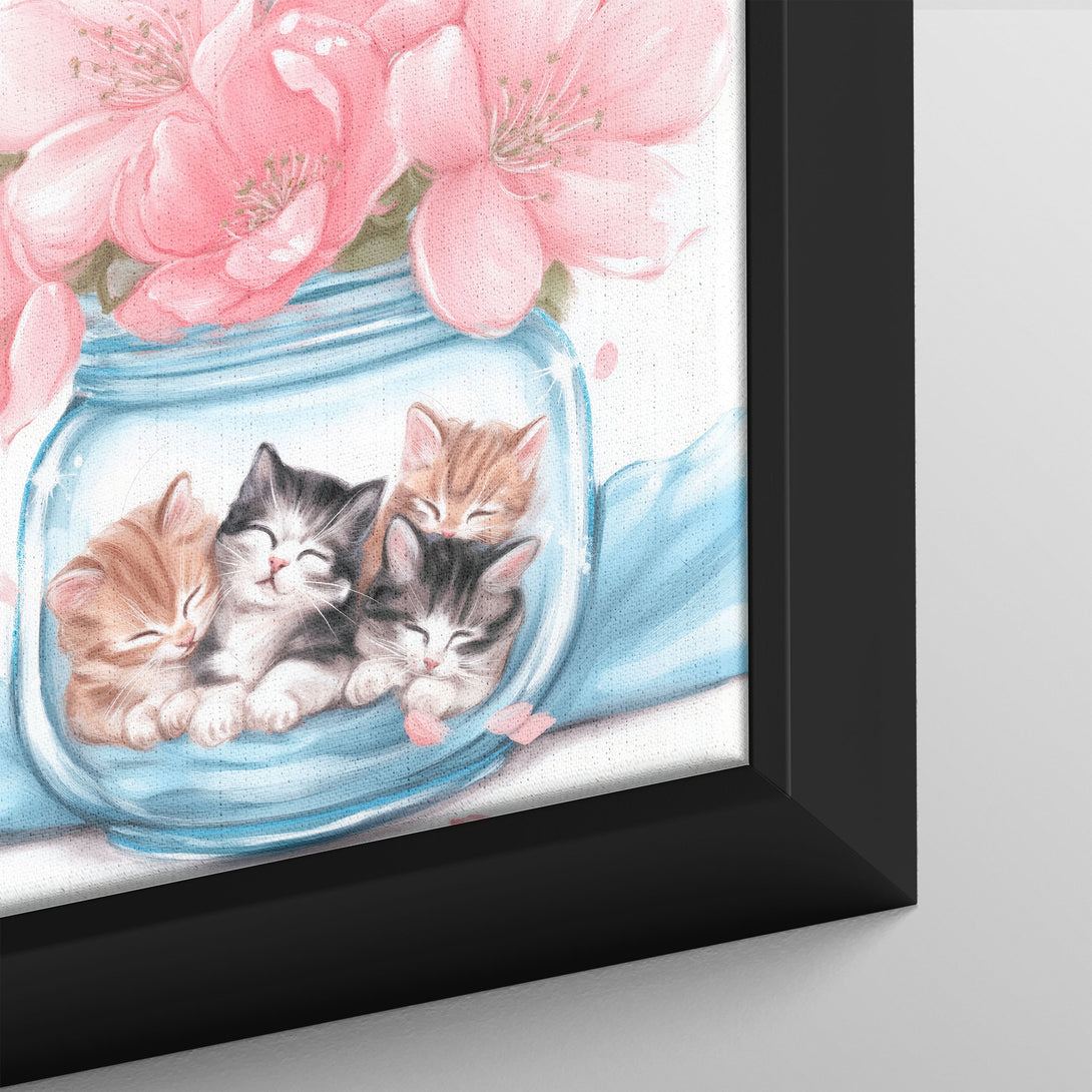 Soft pink blossoms and four tiny sleepers in a blue glass jar, pastel calm for spaces that need a smile. Limited Release.