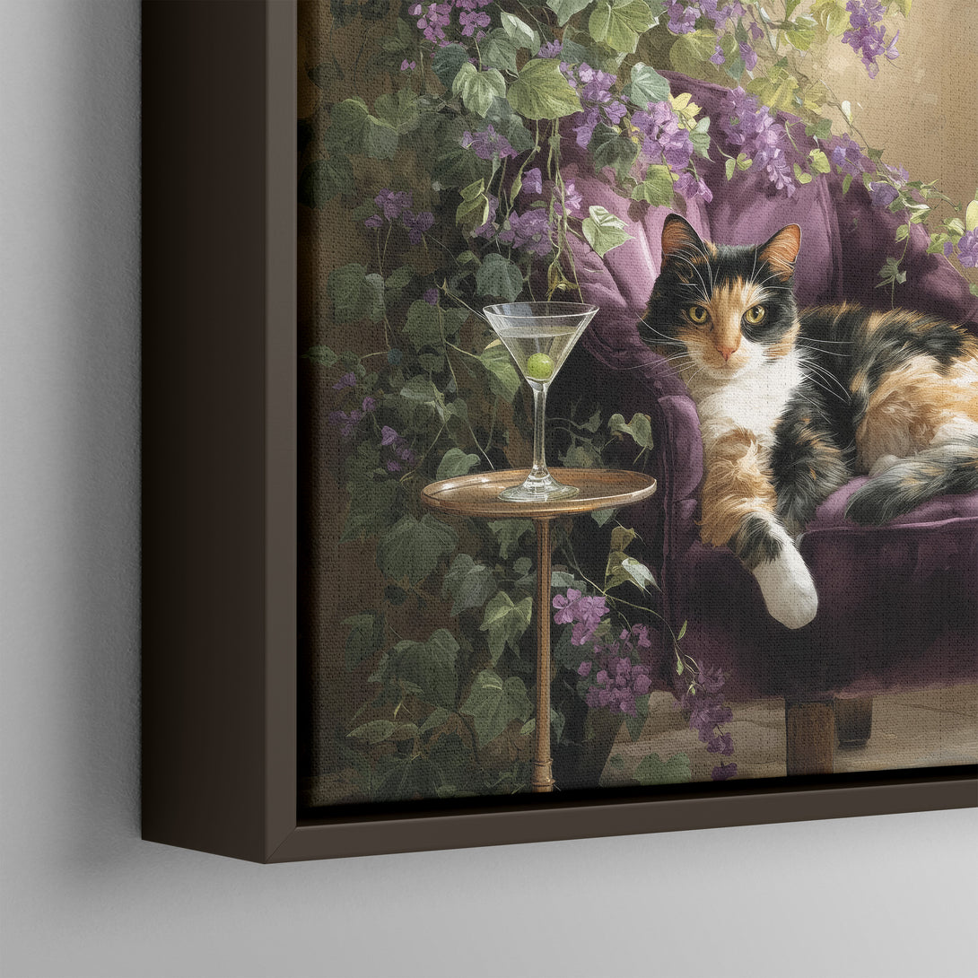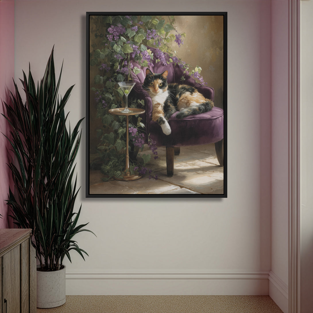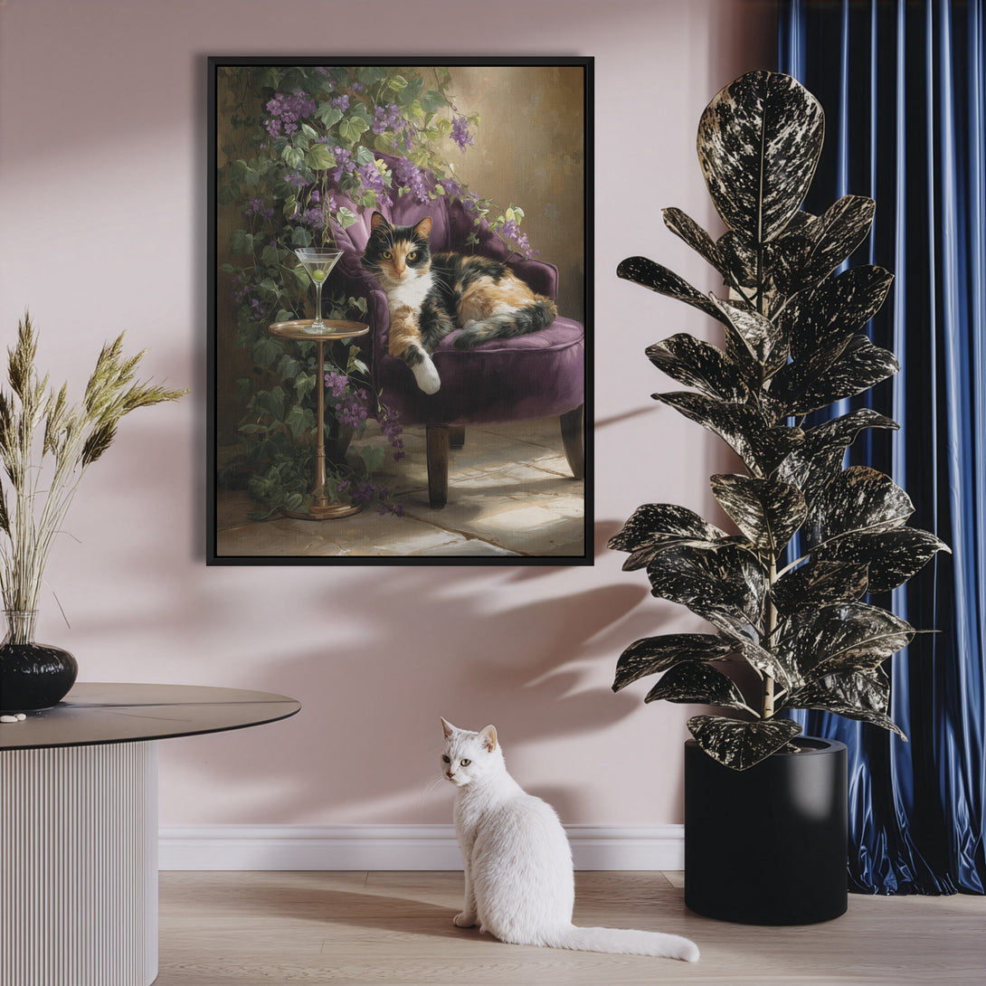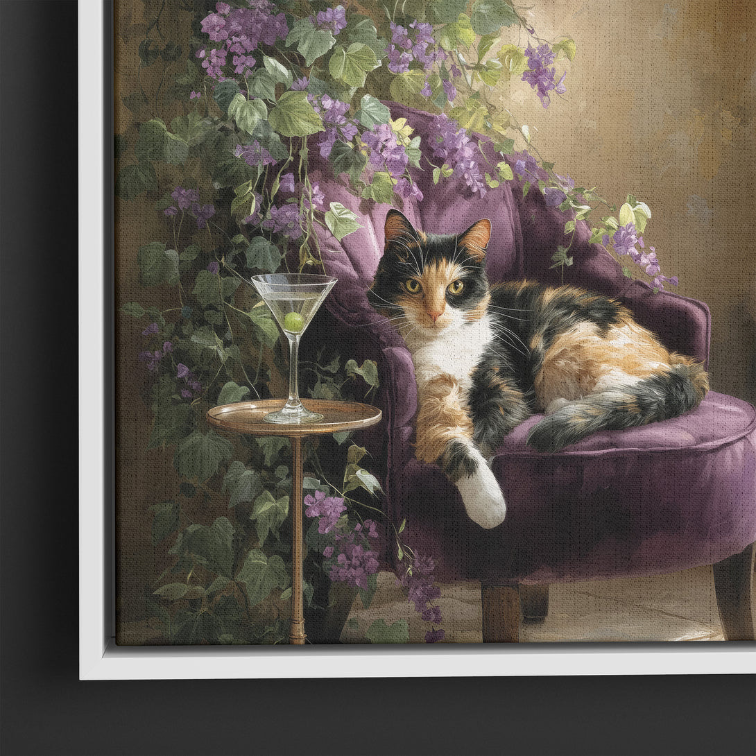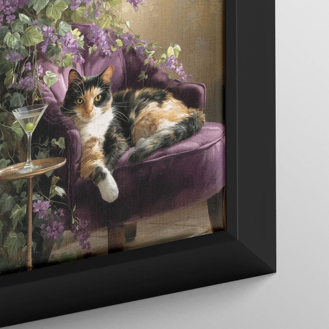 Vintage-lounge calm, a calico reclines on a violet chair beside a quiet martini, florals softening the edges. Adds warm, storybook ease to the room. Limited Release.