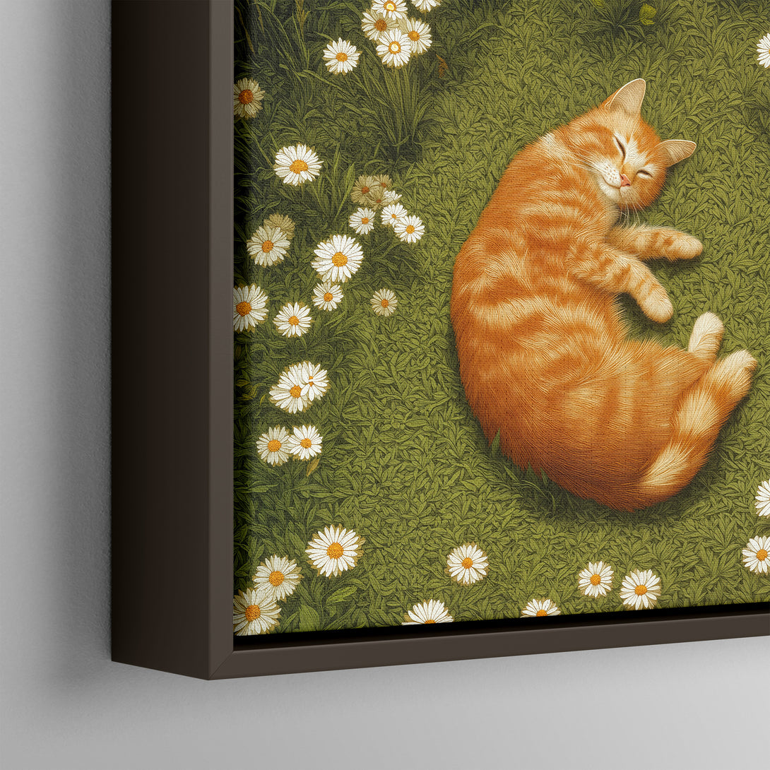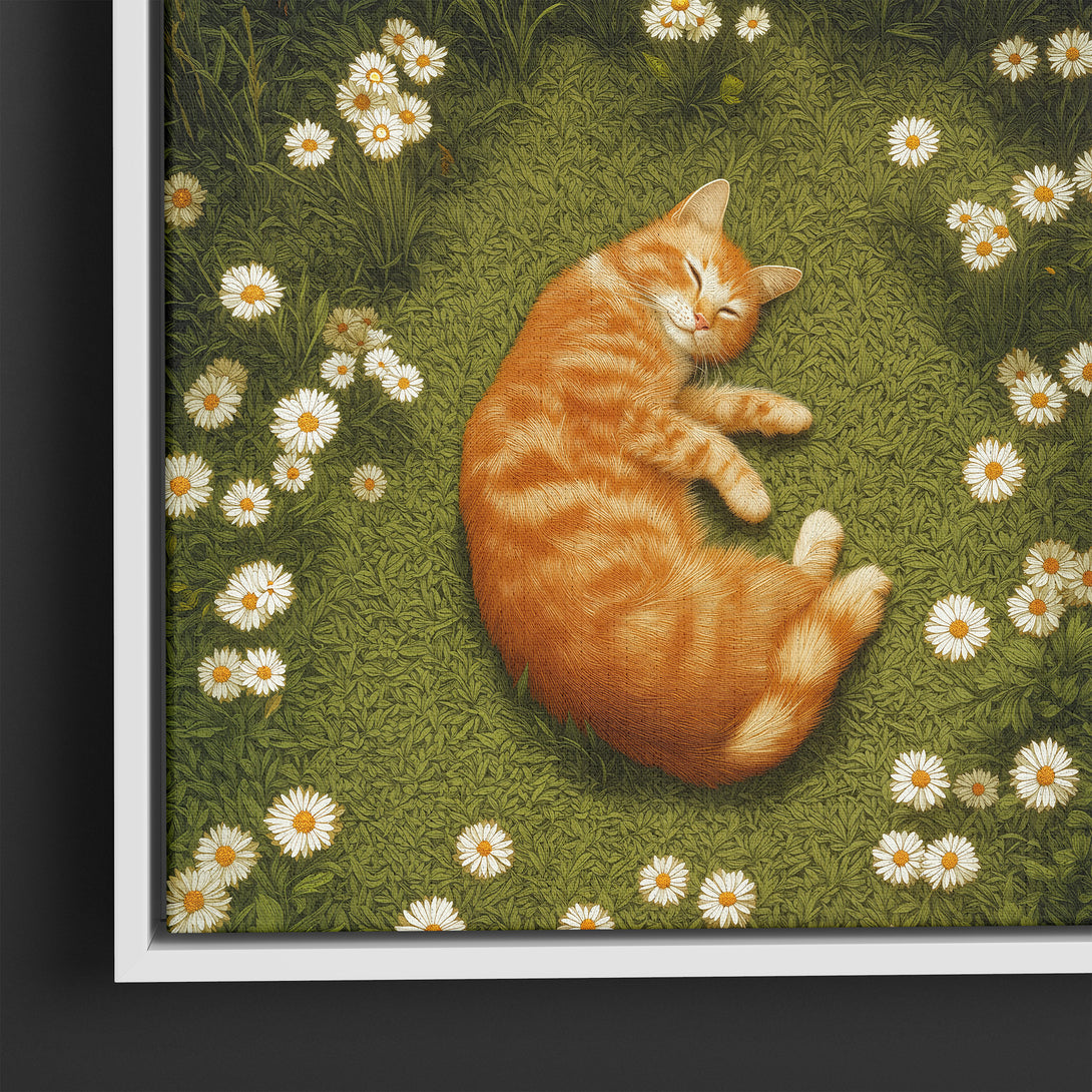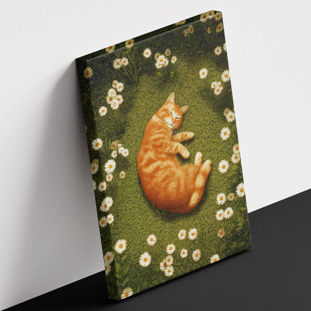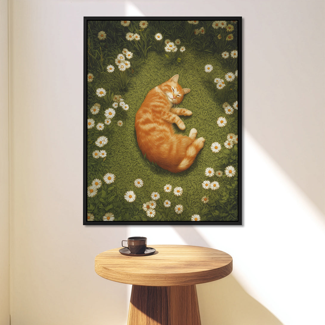 Soft garden hush, a ginger cat asleep in a ring of daisies, green quiet wrapping the scene. Brings gentle, lived-in calm to the room. Limited Release.