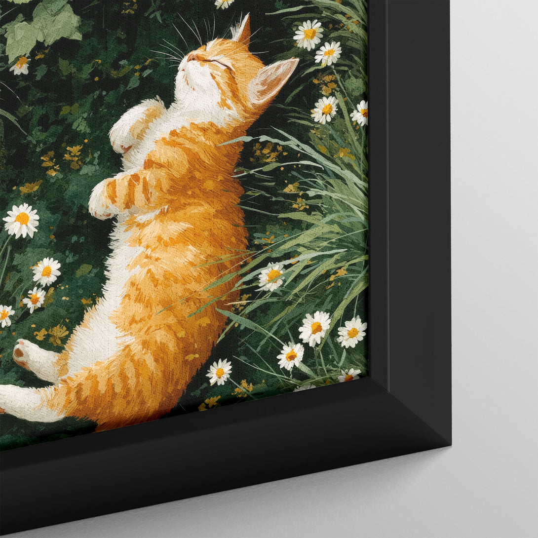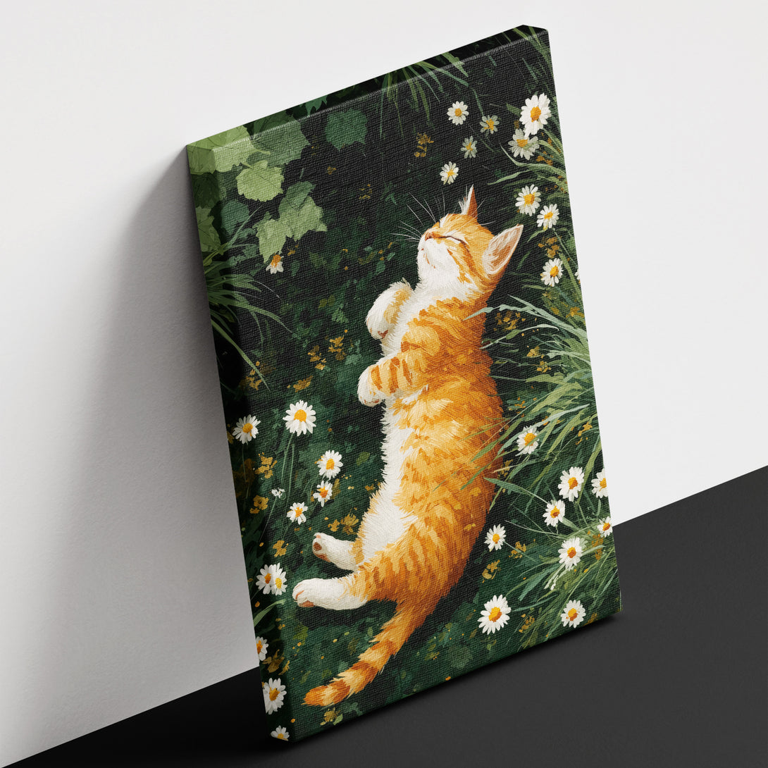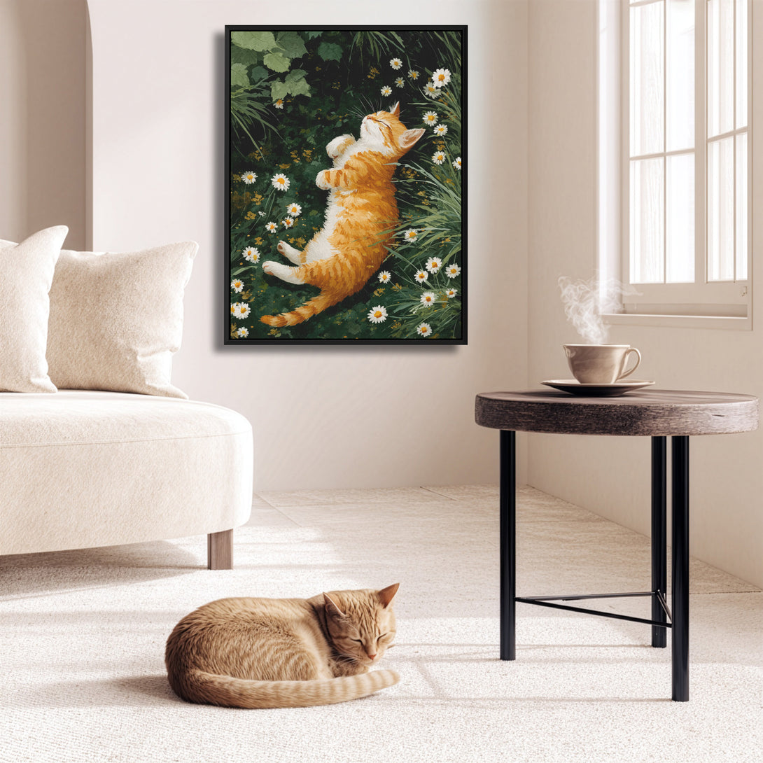 A storybook calm, ginger tabby dozing in a circle of daisies, grass whispering around the edges. Soft, lived-in warmth for restful rooms. Limited Release.