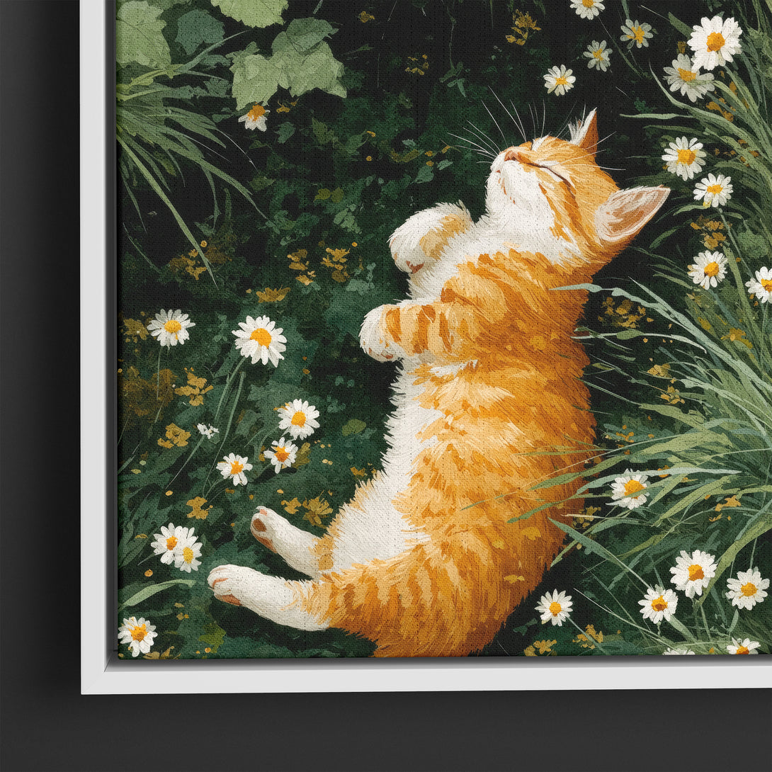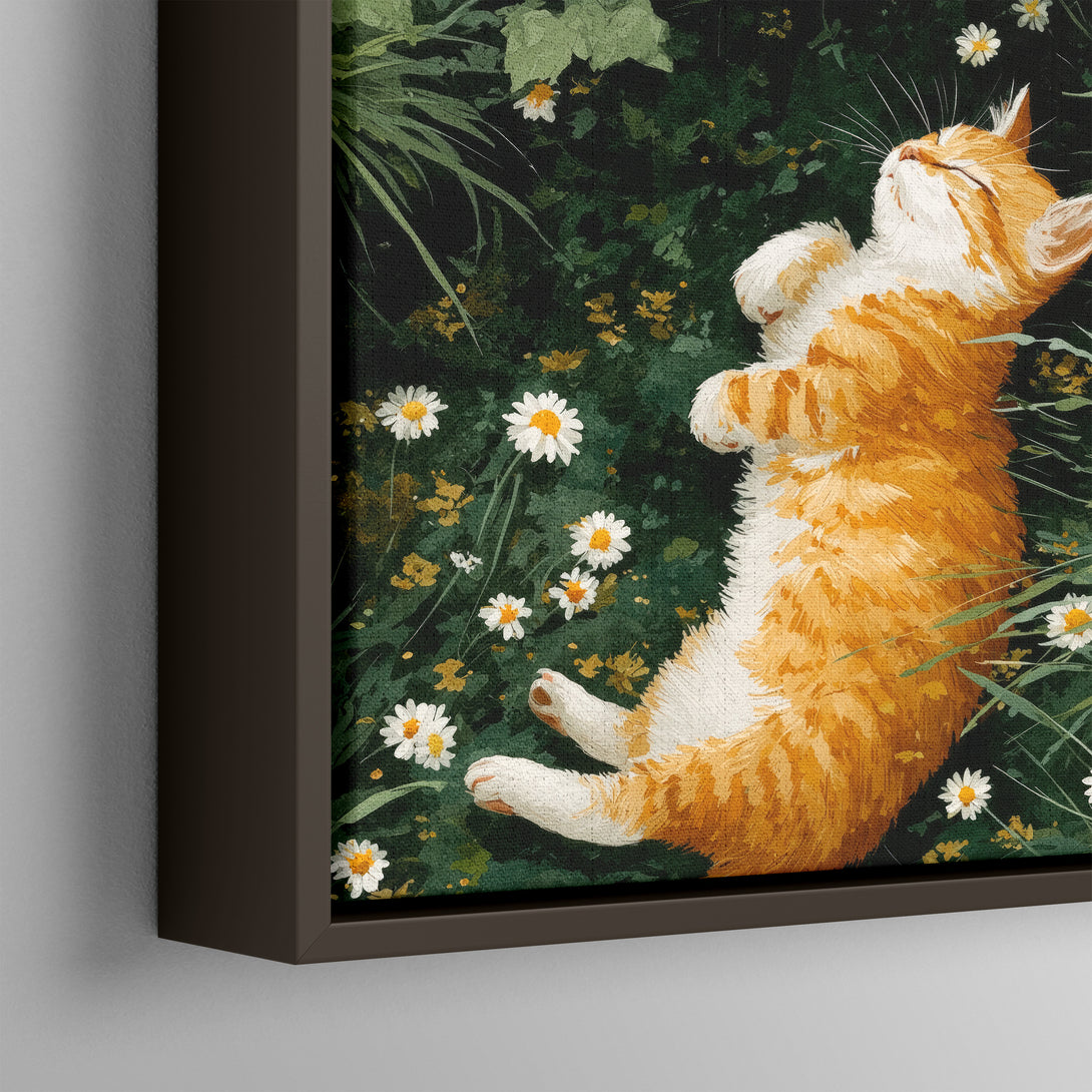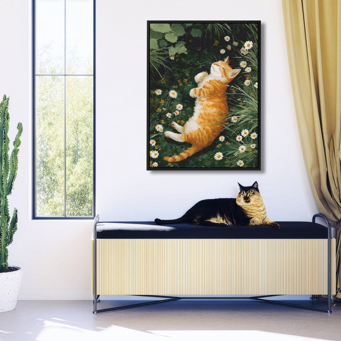 A storybook calm, ginger tabby dozing in a circle of daisies, grass whispering around the edges. Soft, lived-in warmth for restful rooms. Limited Release.