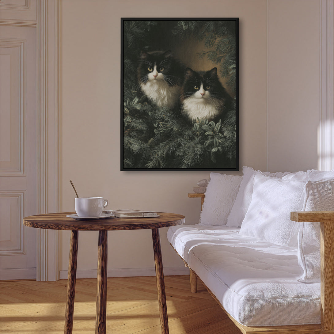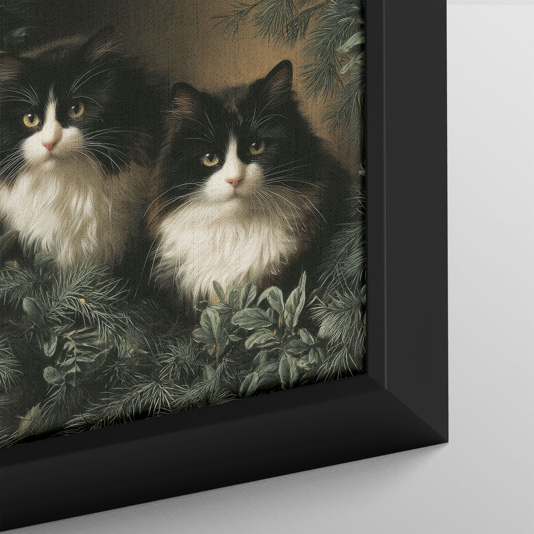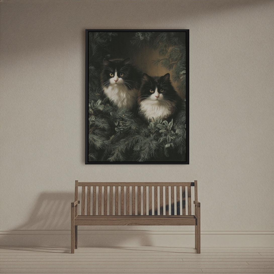 Evergreen hush with two tuxedo cats in quiet light, made to settle a room with gentle calm. Limited Release.
