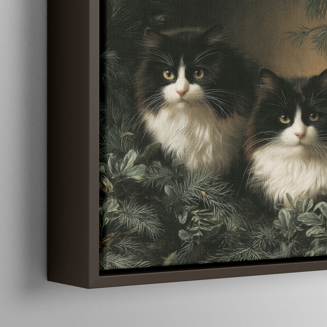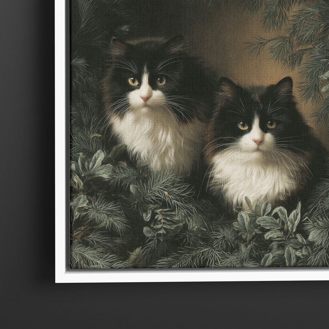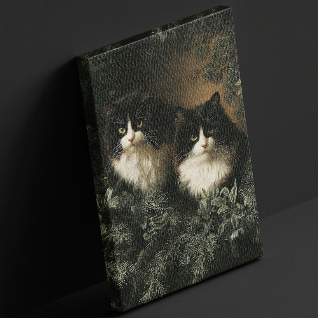 Evergreen hush with two tuxedo cats in quiet light, made to settle a room with gentle calm. Limited Release.