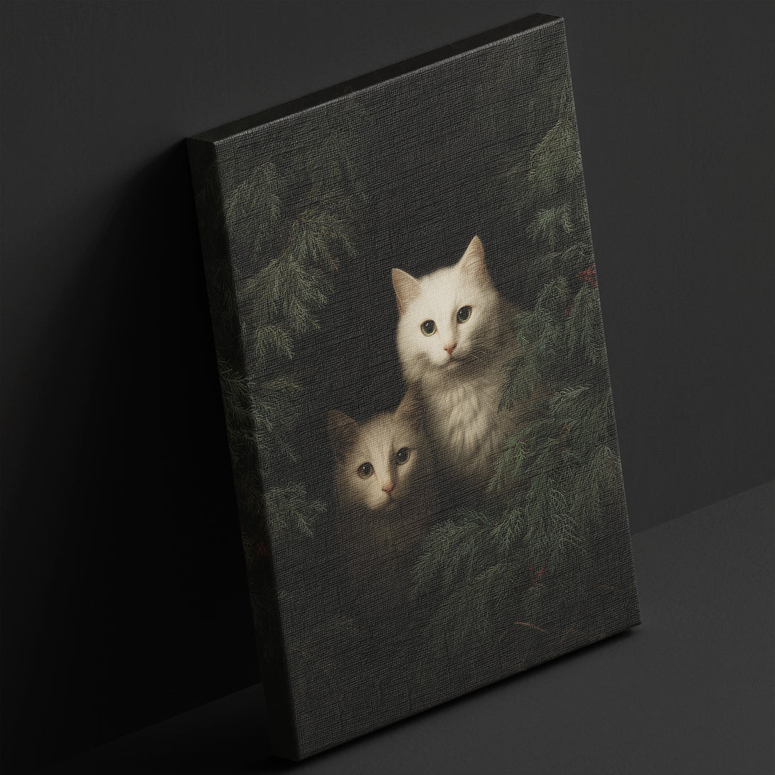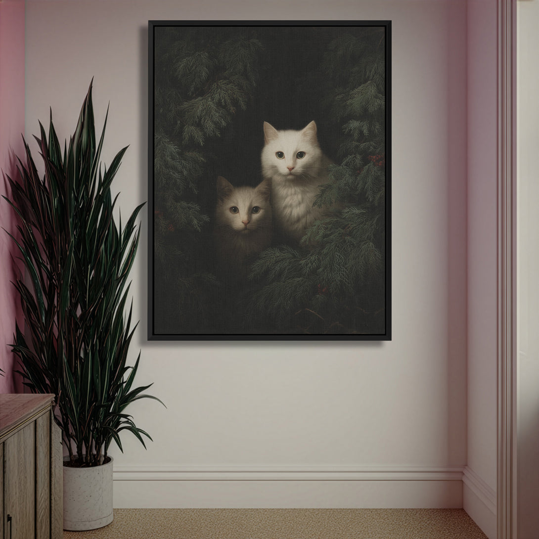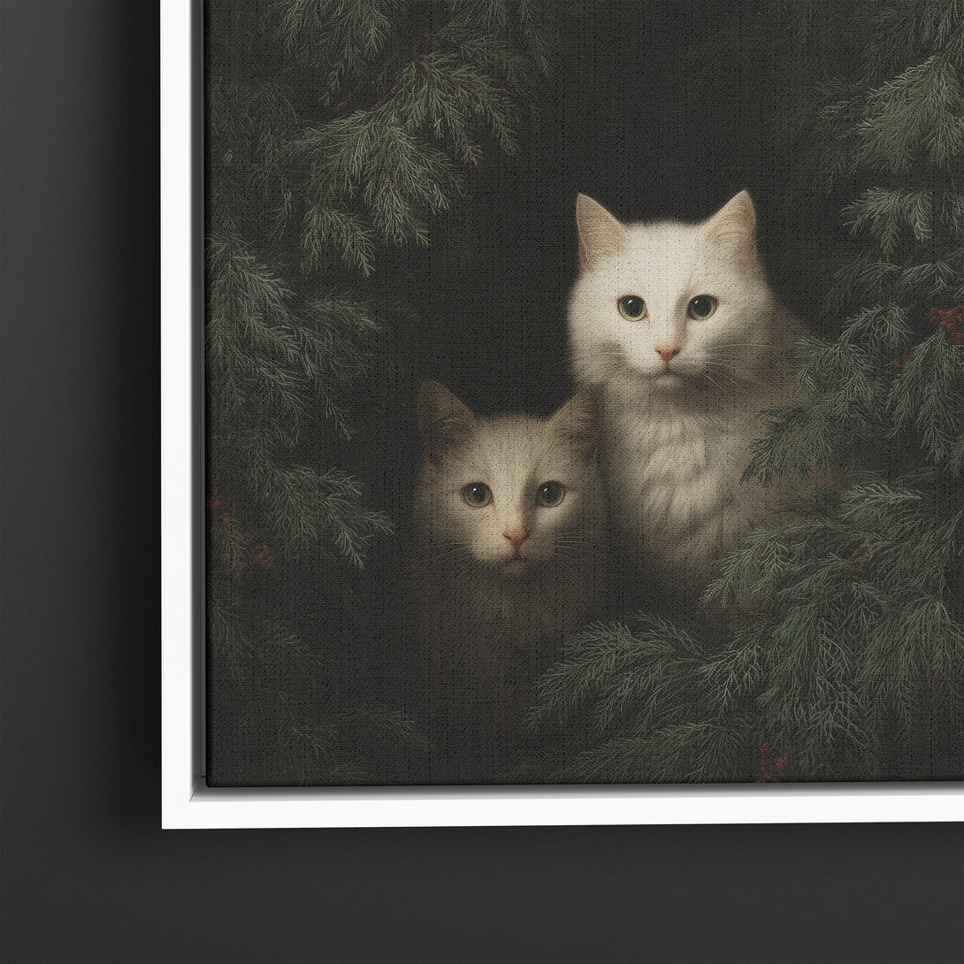 Deep-green hush and soft, watchful eyes, two white cats held by evergreen shade to calm a room at first glance. Limited Release.