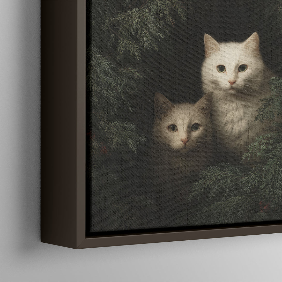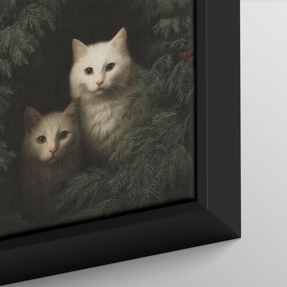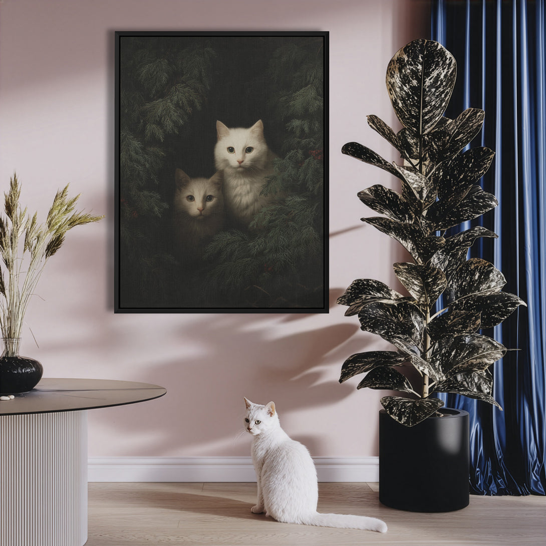 Deep-green hush and soft, watchful eyes, two white cats held by evergreen shade to calm a room at first glance. Limited Release.