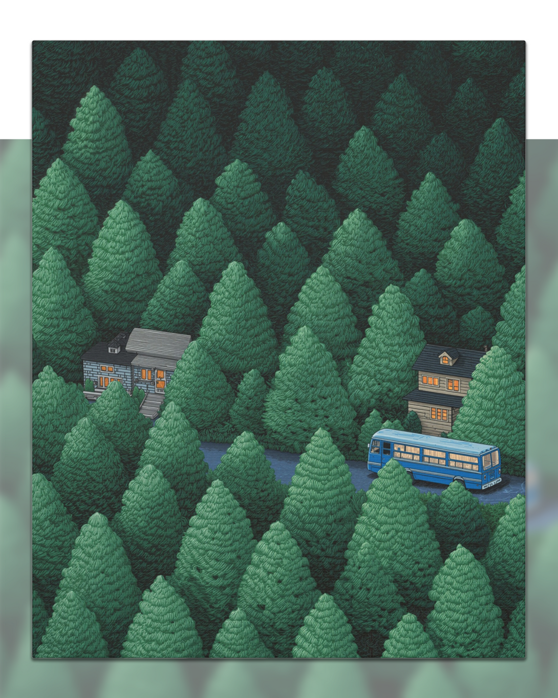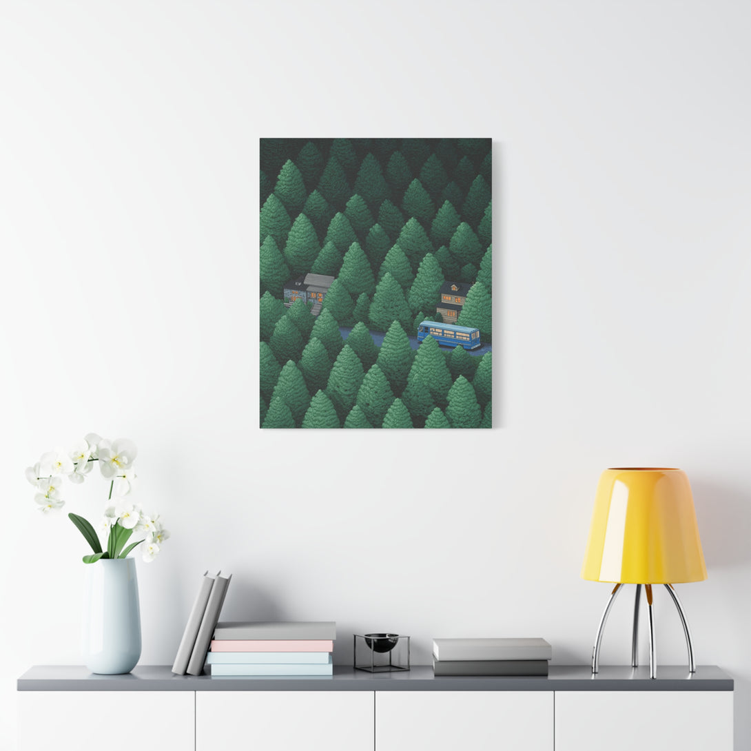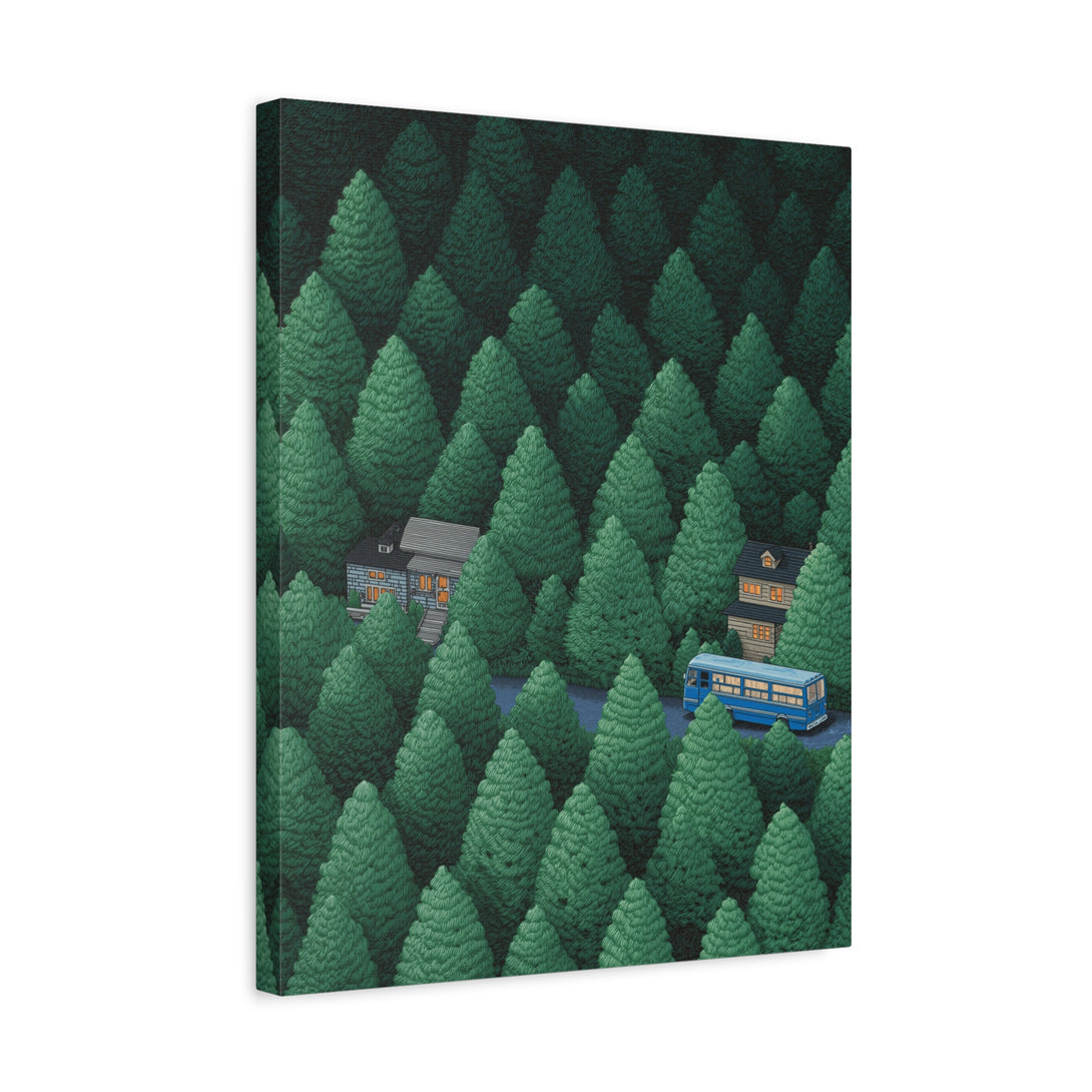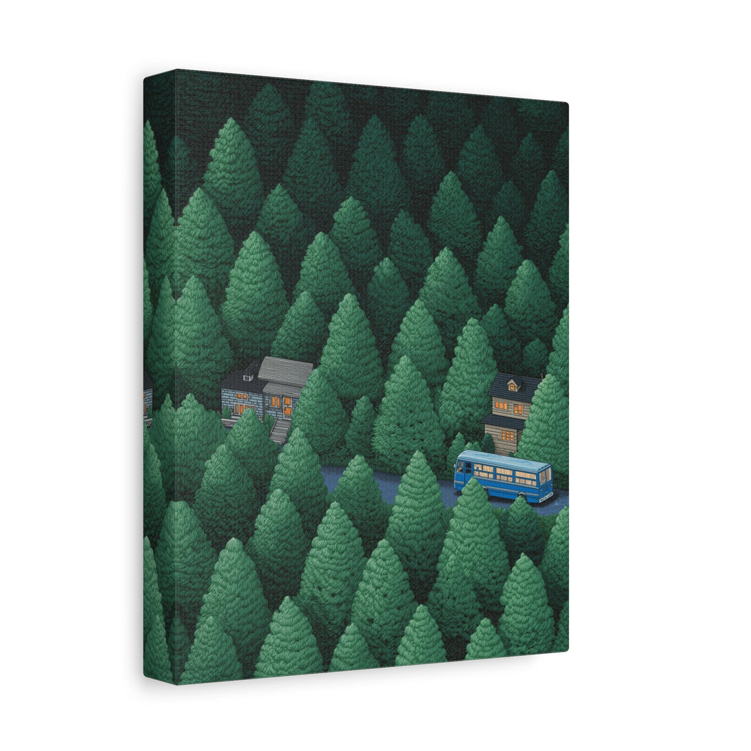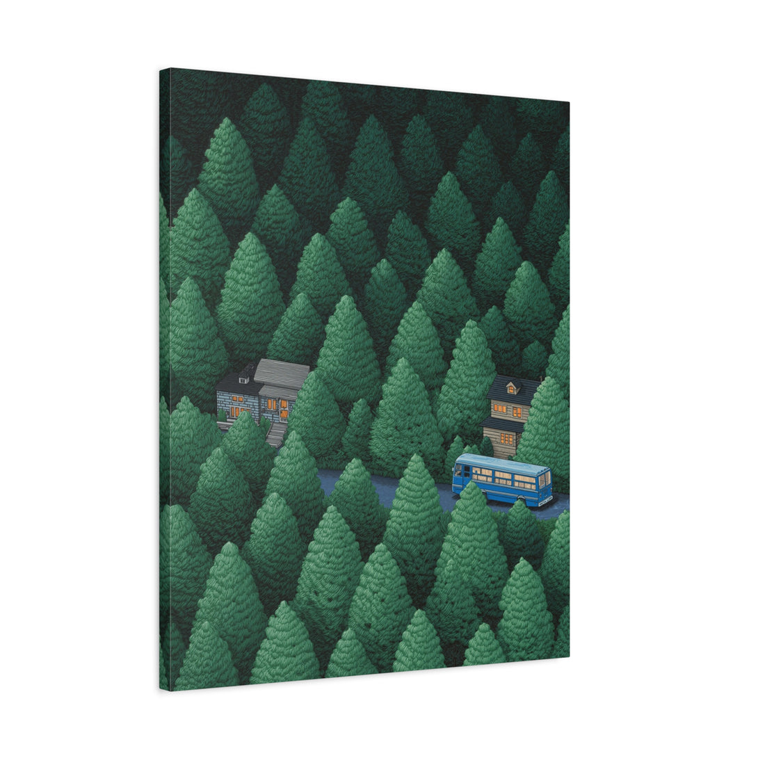 A blue bus sneaks through pine after pine, windows warm like tiny living-room lamps. Two cabins glow nearby, the vibe is “sorry I can’t make it, my heart has a cabin.” Quiet, cozy, a little whimsical for introverts who commute emotionally to the woods.