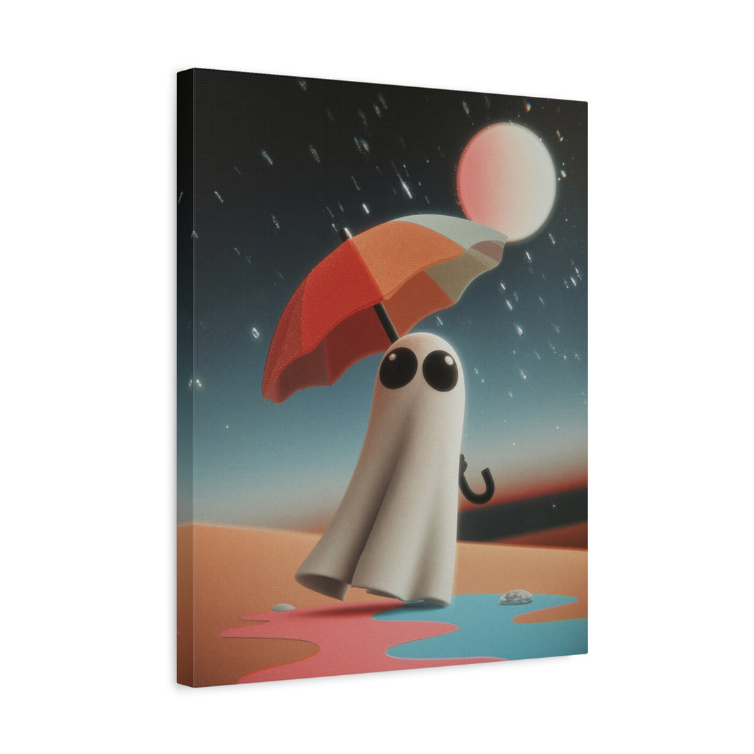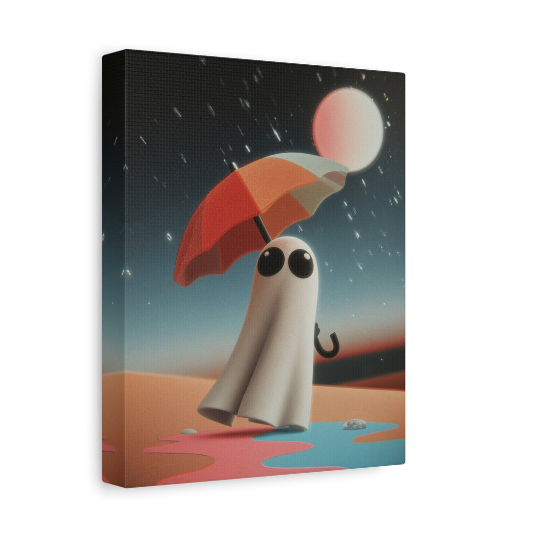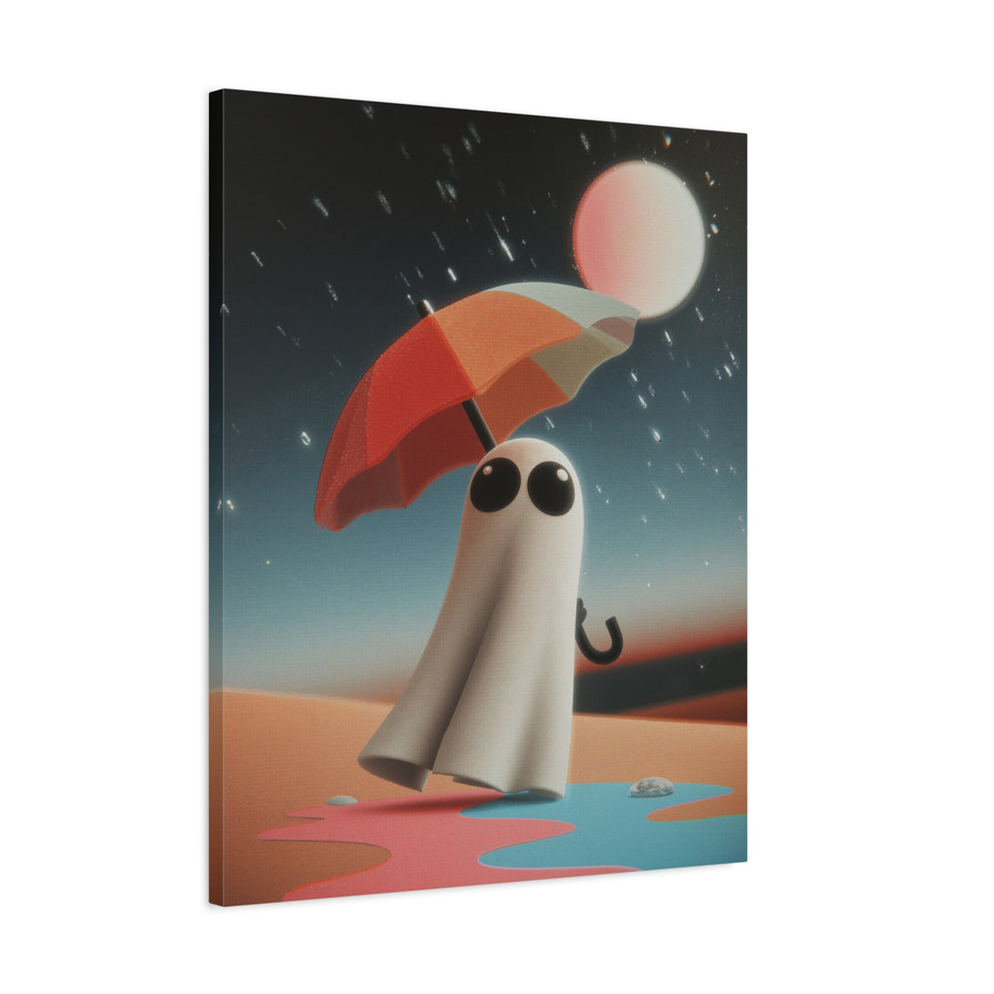 Rain? Meteors? Feelings? This spooky-cute ghost brought an umbrella. Big glossy eyes, pastel night gradient, soft grain, and a candy-puddle under the moon—quietly chaotic in the nicest way. Perfect for introverts who RSVP “maybe” to weather and people.