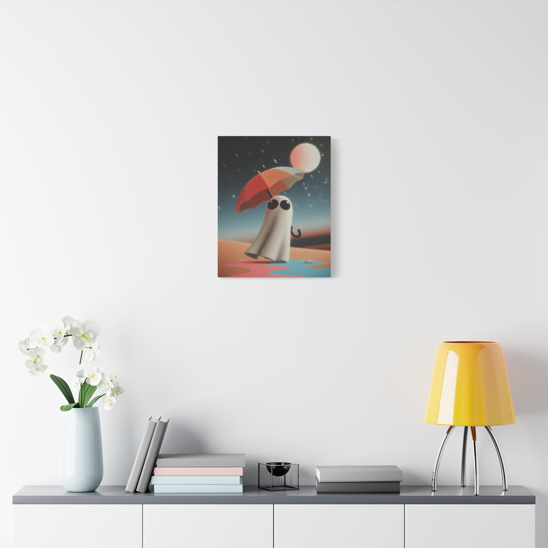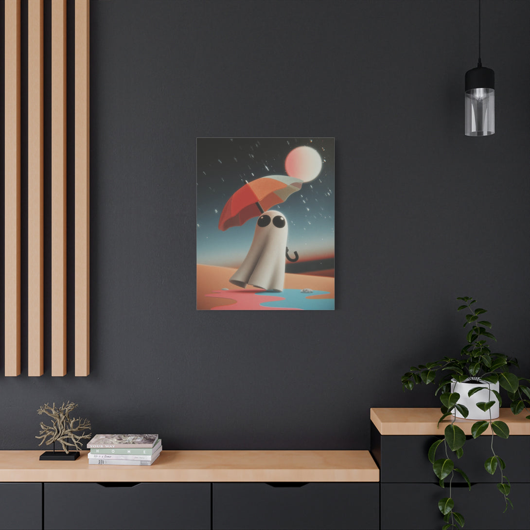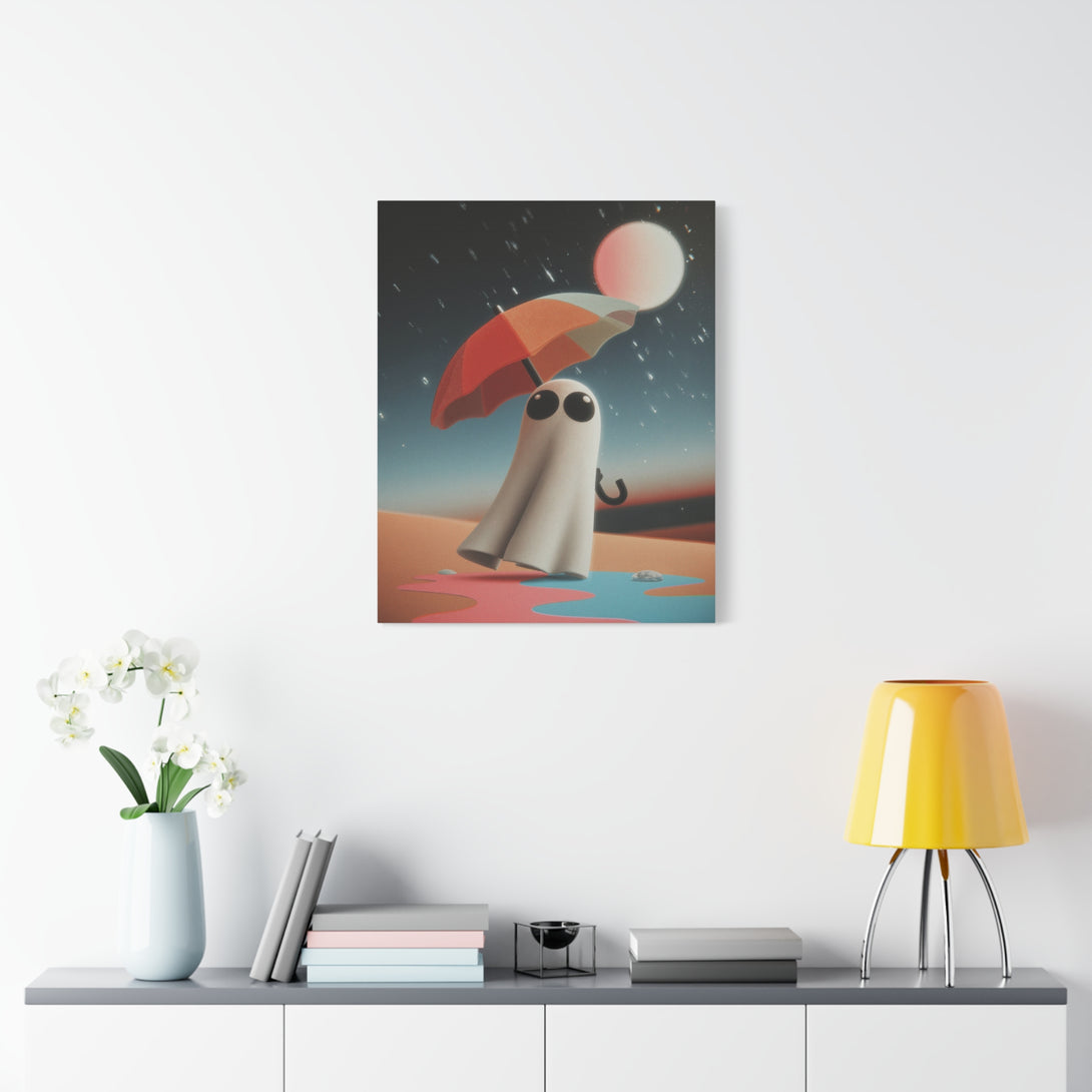 Rain? Meteors? Feelings? This spooky-cute ghost brought an umbrella. Big glossy eyes, pastel night gradient, soft grain, and a candy-puddle under the moon—quietly chaotic in the nicest way. Perfect for introverts who RSVP “maybe” to weather and people.