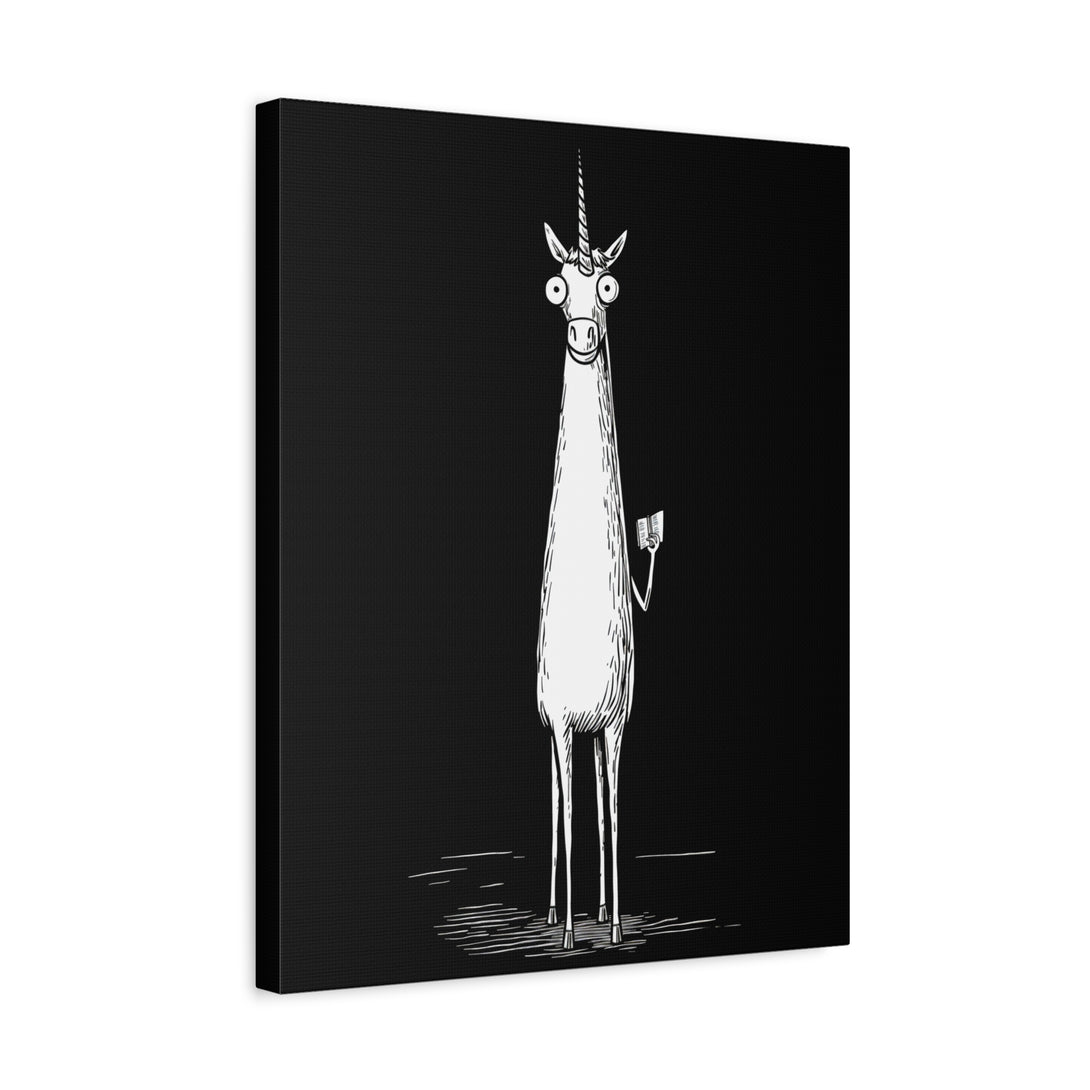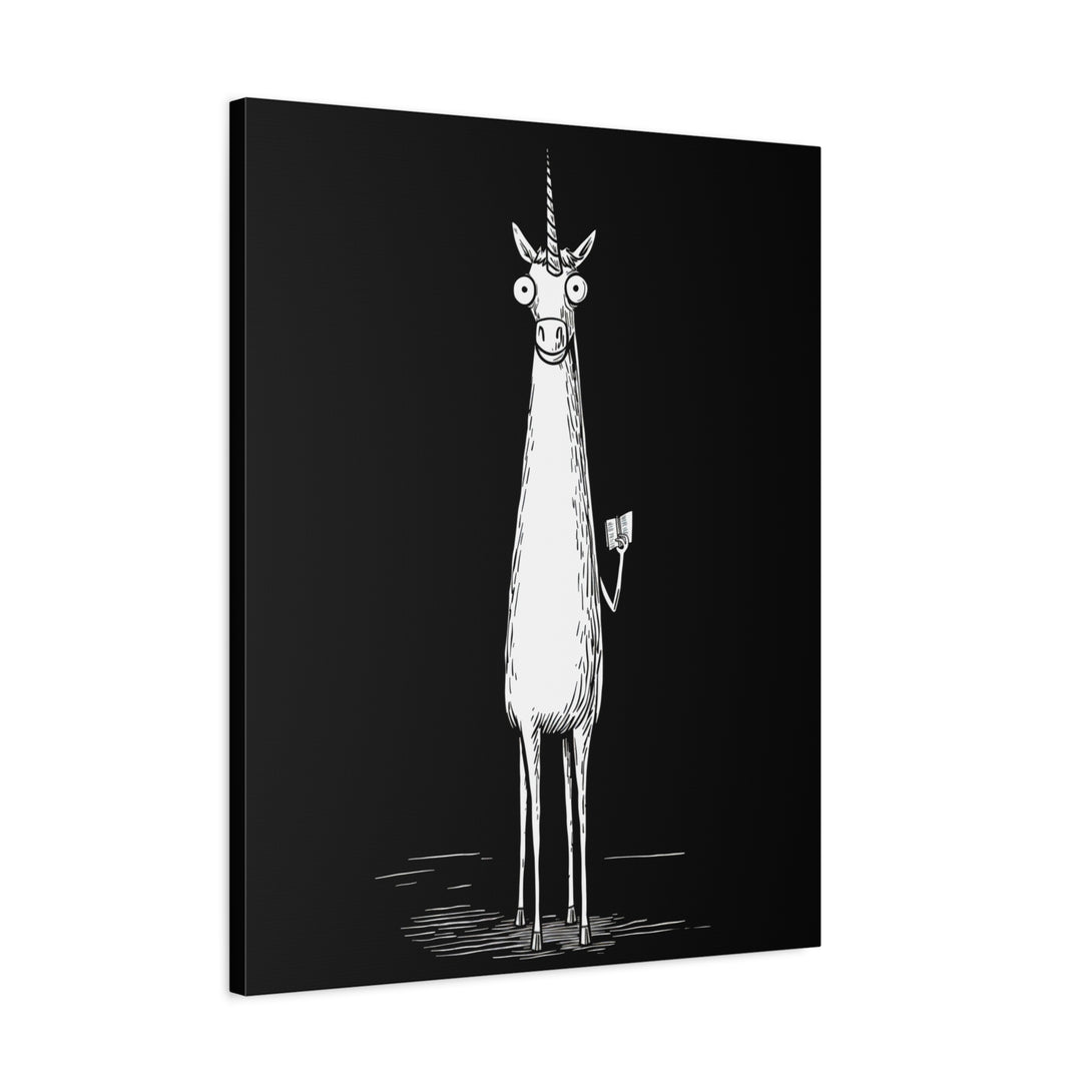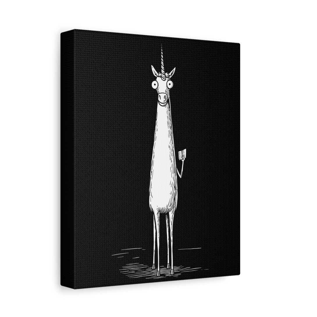 Deadpan and a little clueless, in the best way. A skinny line-art unicorn with big eyes holds a tiny “how to adult” guidebook on a black stage. Minimal, silly, and introvert-friendly (studying before socializing).