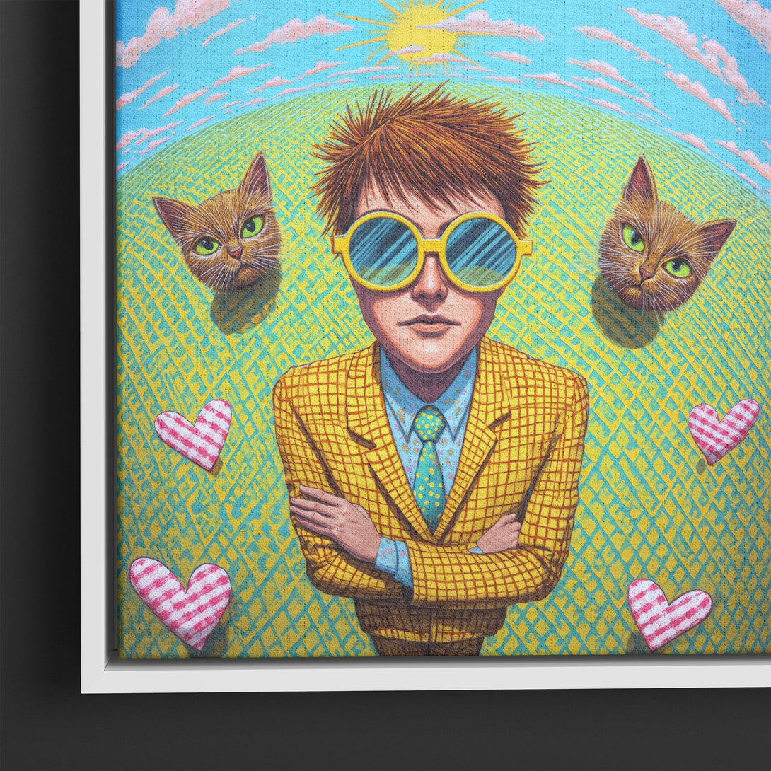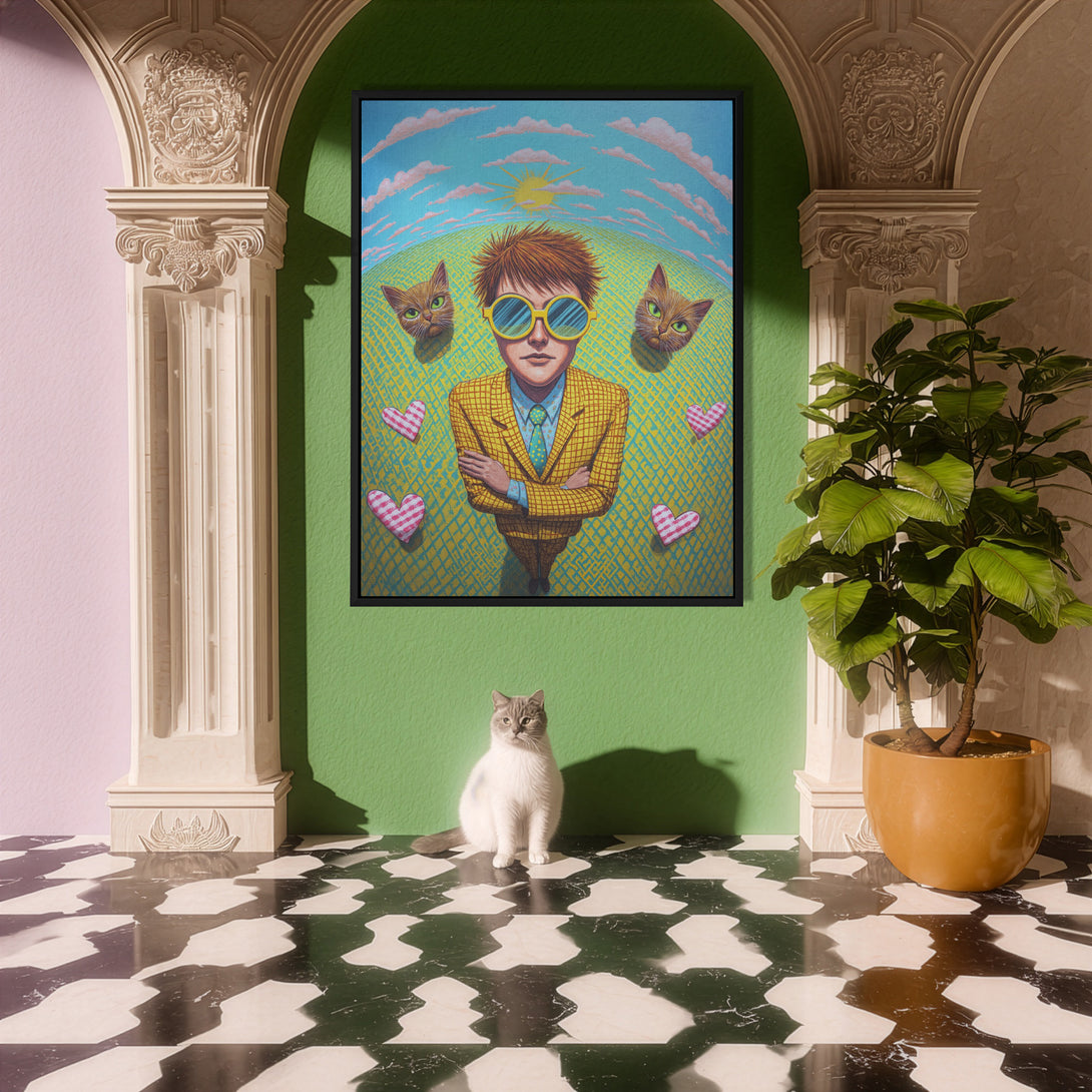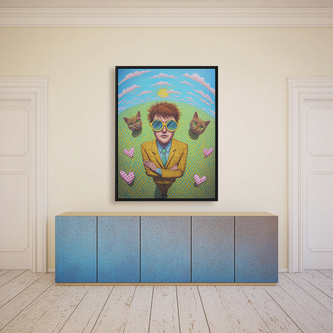 Playful calm with a wink, bright field, sunny sky, two curious cats orbiting a cool kid in big shades. Brings bold order without noise. Limited Release.