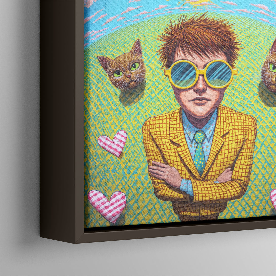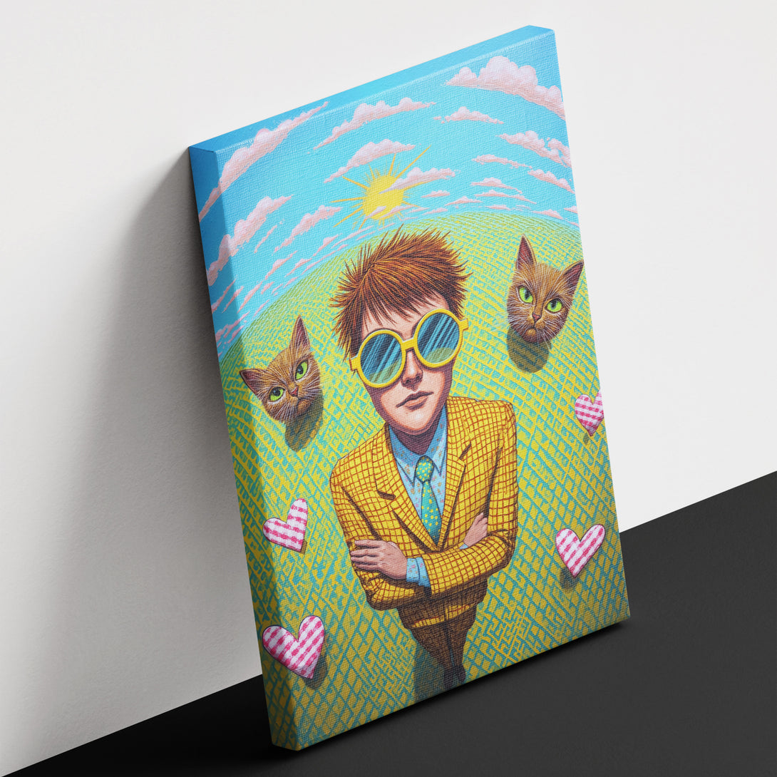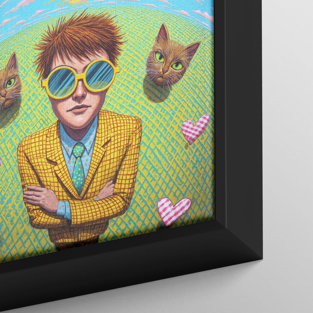 Playful calm with a wink, bright field, sunny sky, two curious cats orbiting a cool kid in big shades. Brings bold order without noise. Limited Release.