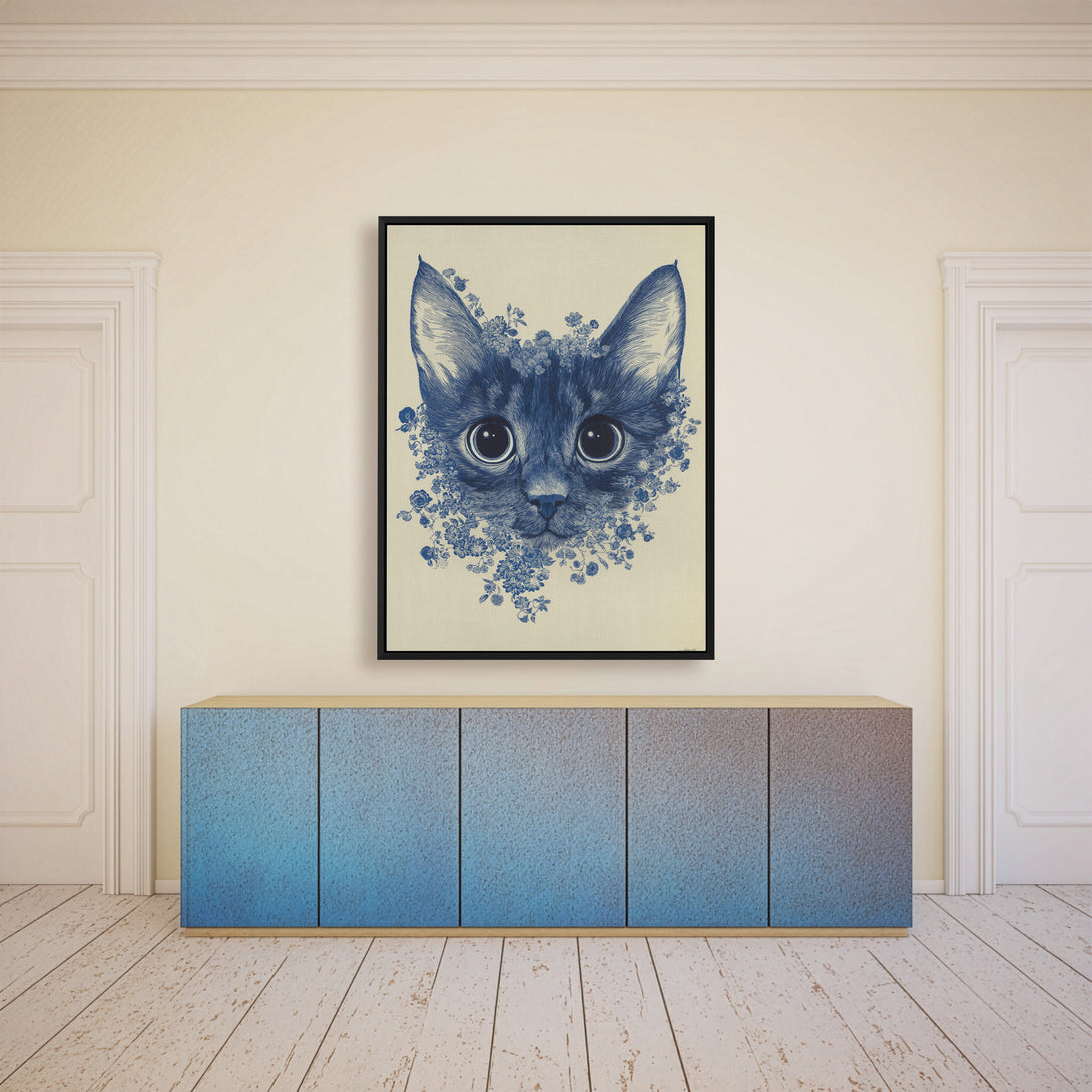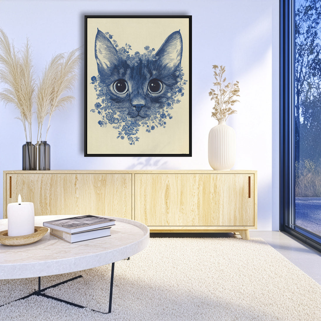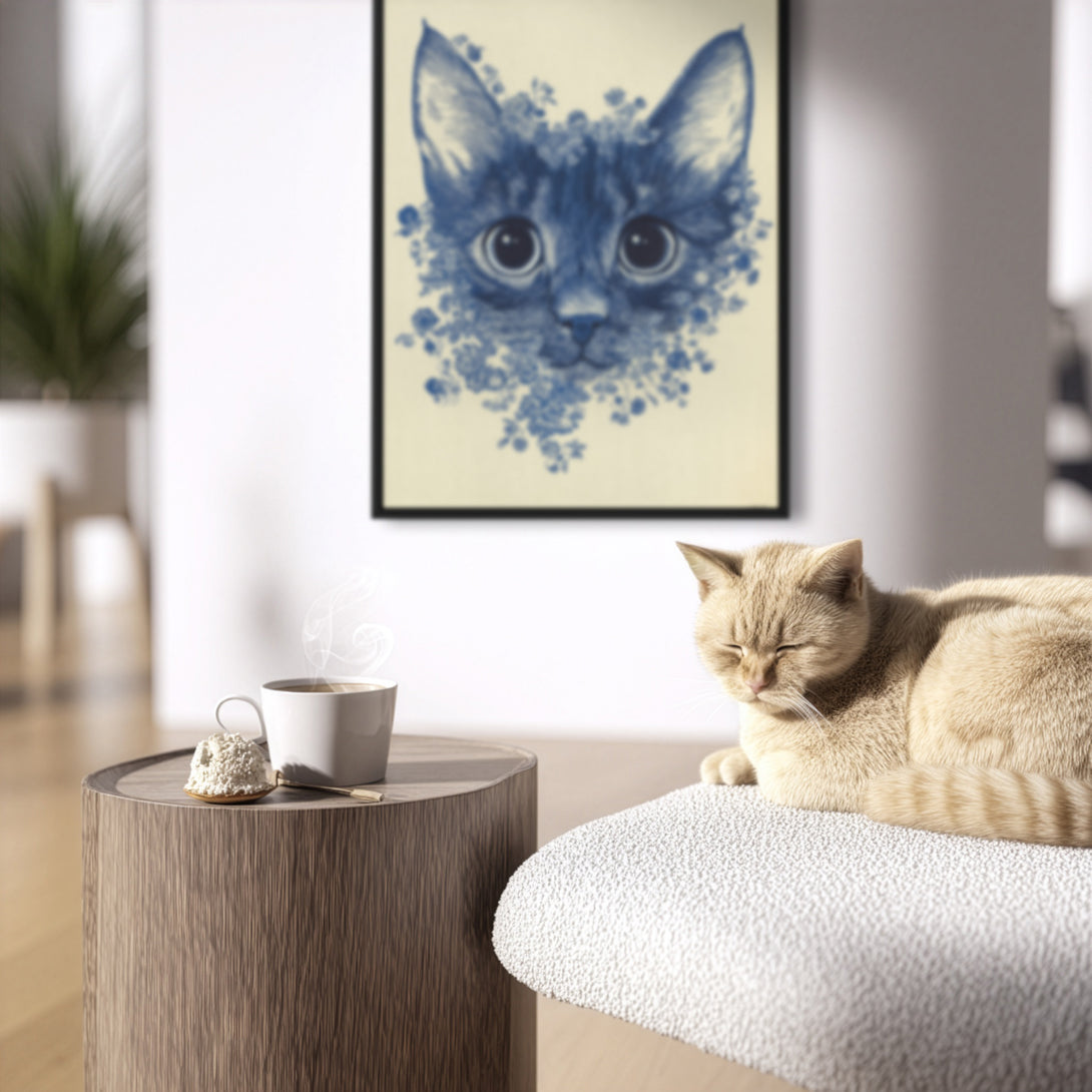 Ink-blue calm with quiet focus, a wide-eyed cat framed by delicate blossoms on soft cream, poised and serene for night-calm rooms. Limited Release.