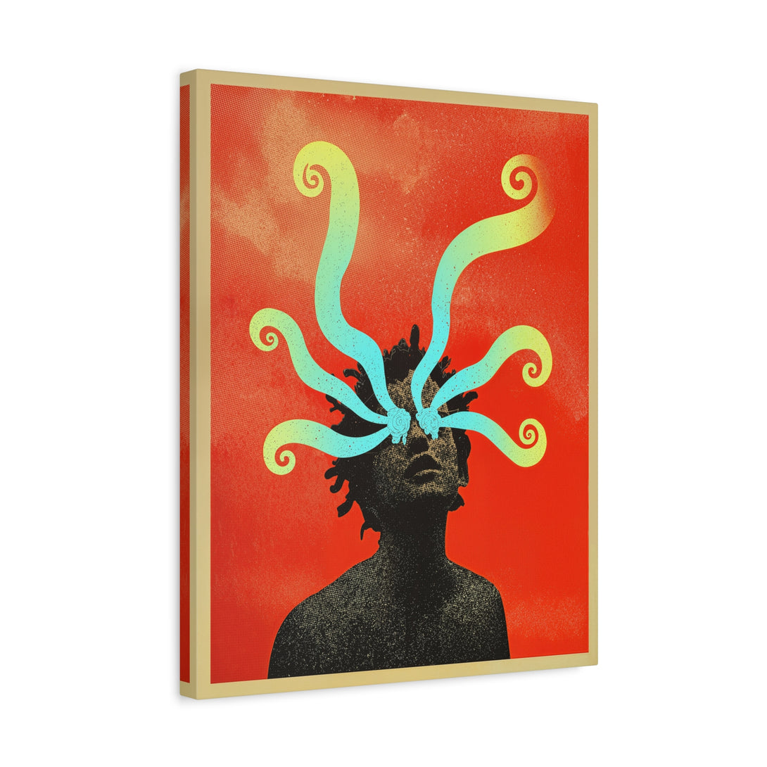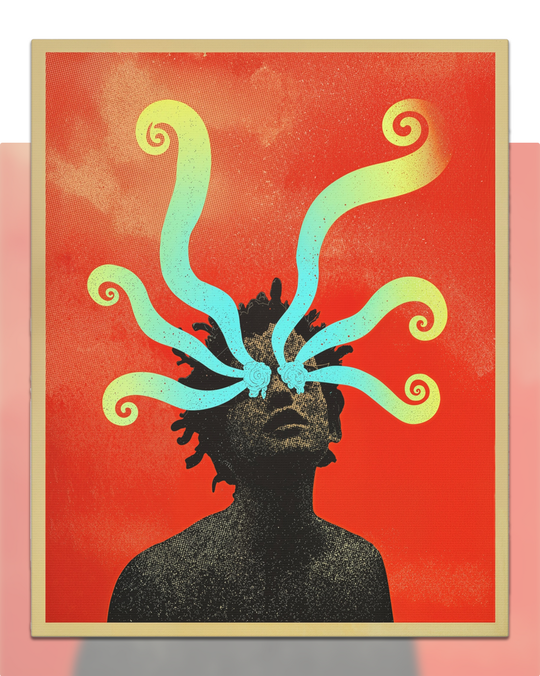 For the days your brain is a group chat without mods. A halftone silhouette on a spicy-orange sky, minty swirls leaking out like “I’m fine” energy-quiet, weird, oddly soothing.