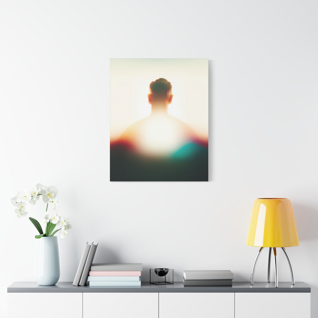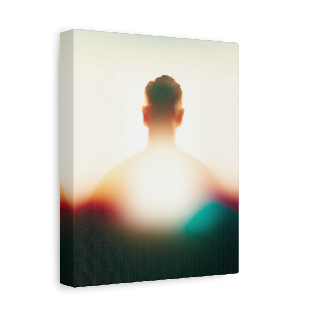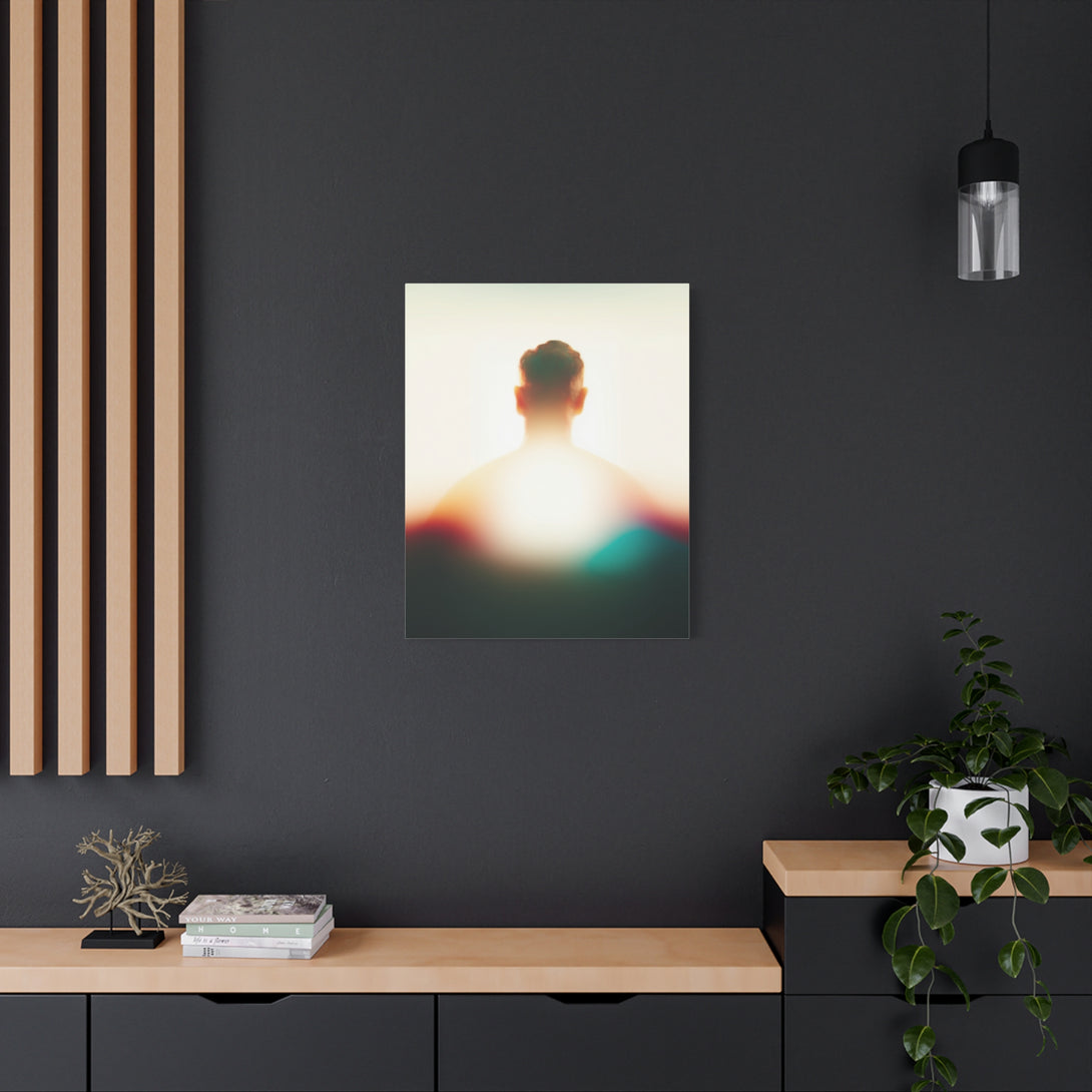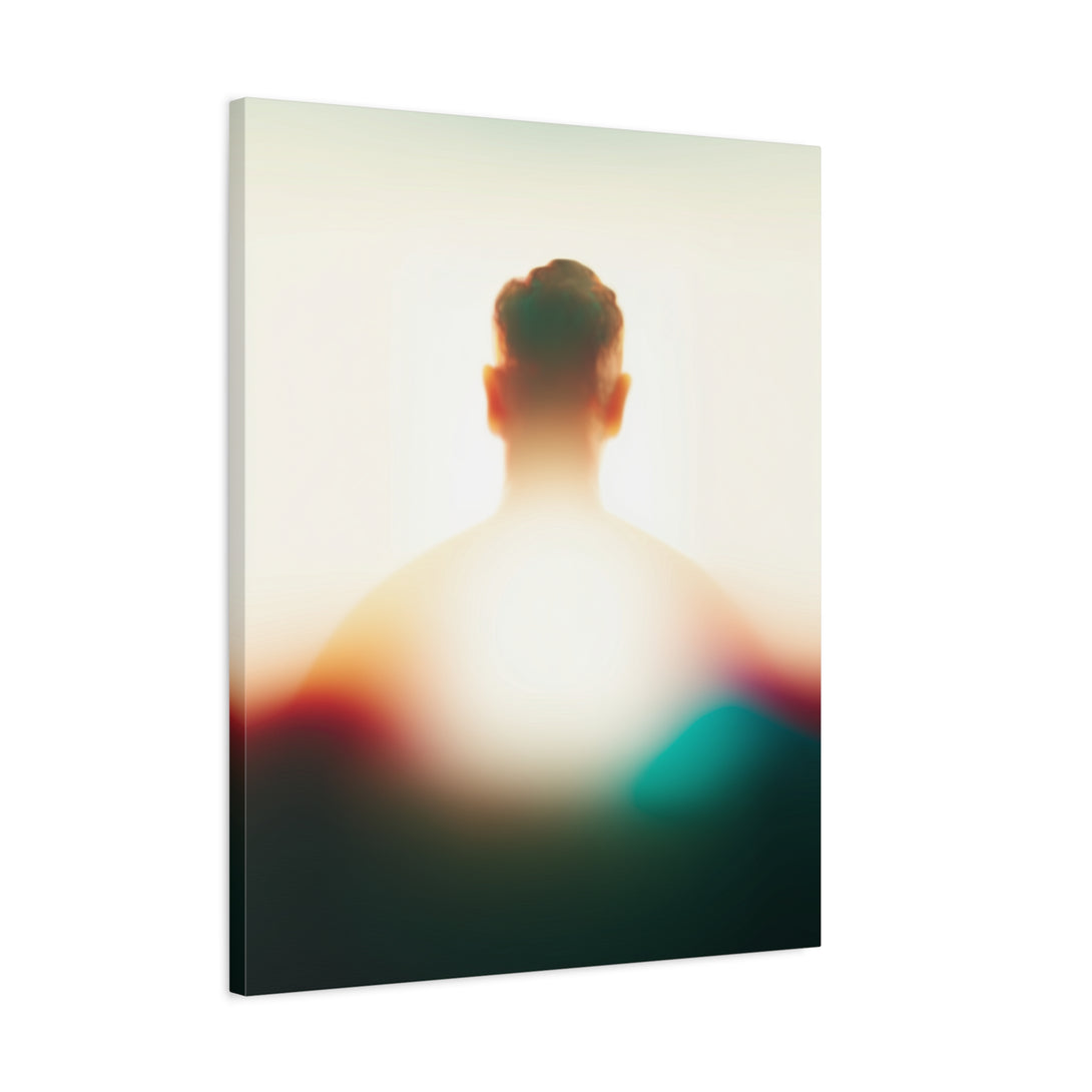 Back to the world, light to myself. A blurred silhouette faces a warm halo while teal and ember gradients fade to quiet, an aura check, not a conversation starter. Soft, dreamy, and perfectly low-volume for walls that prefer calm over small talk.