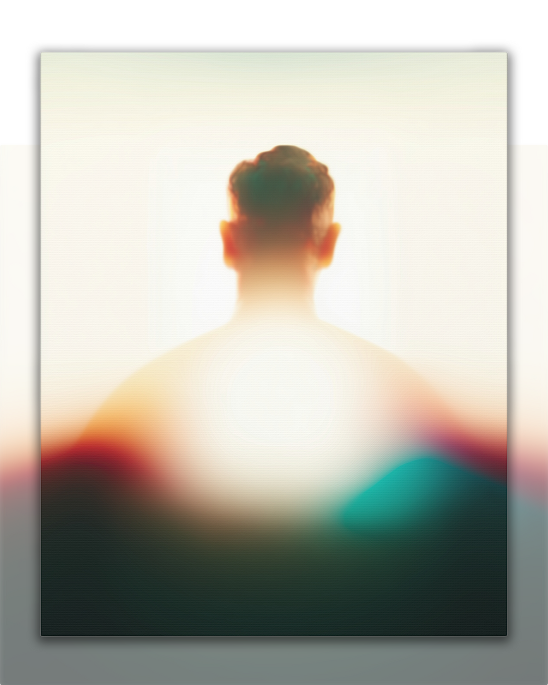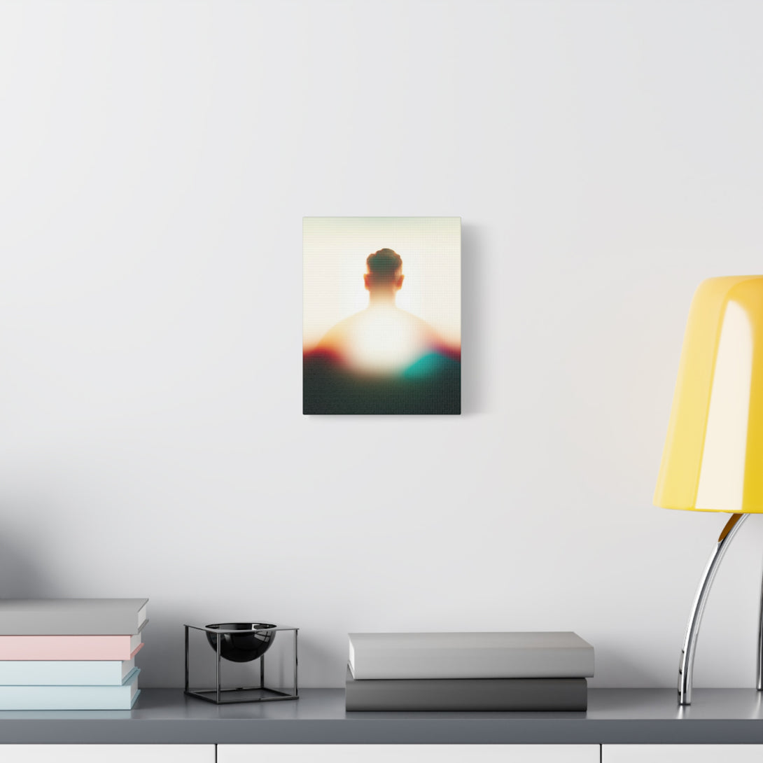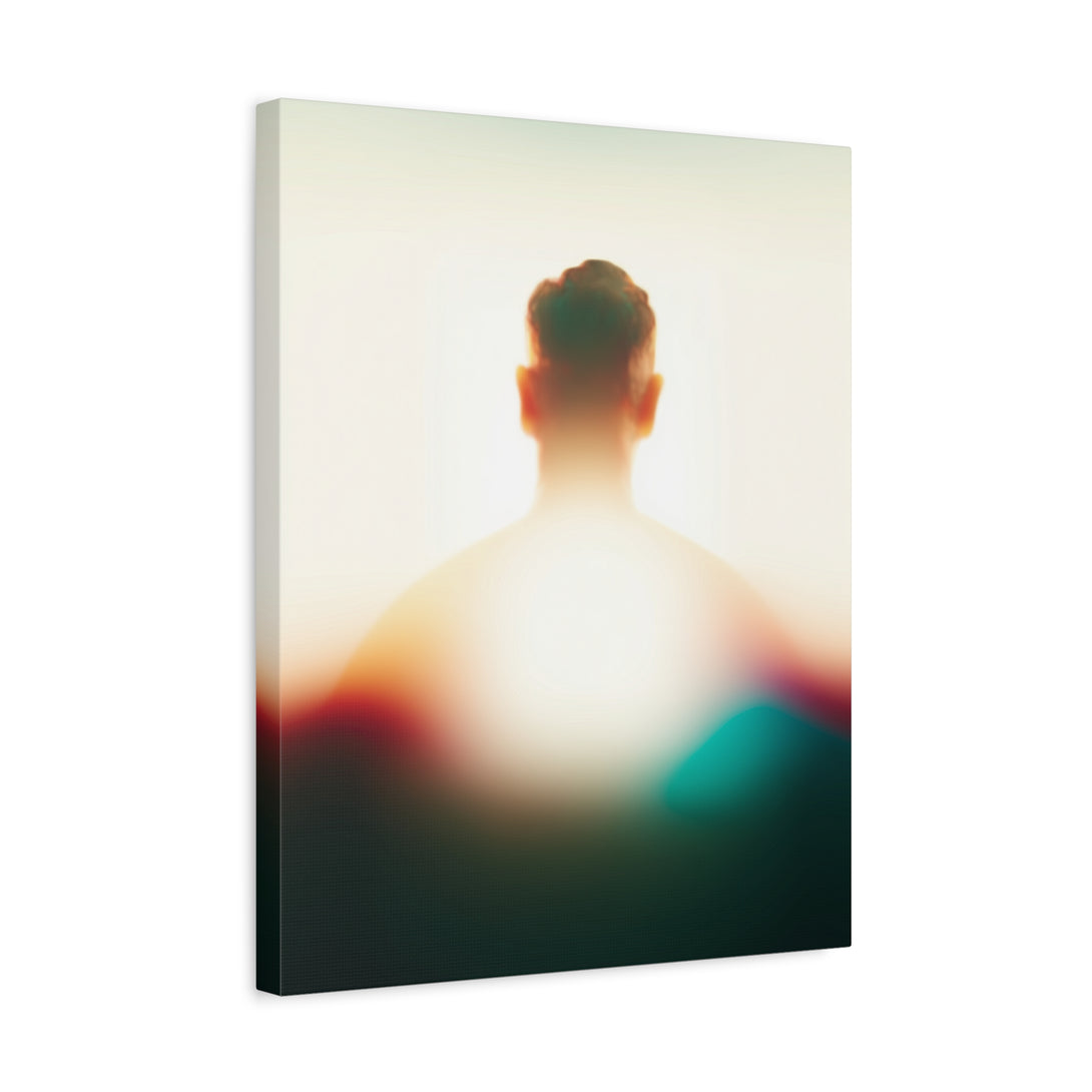 Back to the world, light to myself. A blurred silhouette faces a warm halo while teal and ember gradients fade to quiet, an aura check, not a conversation starter. Soft, dreamy, and perfectly low-volume for walls that prefer calm over small talk.