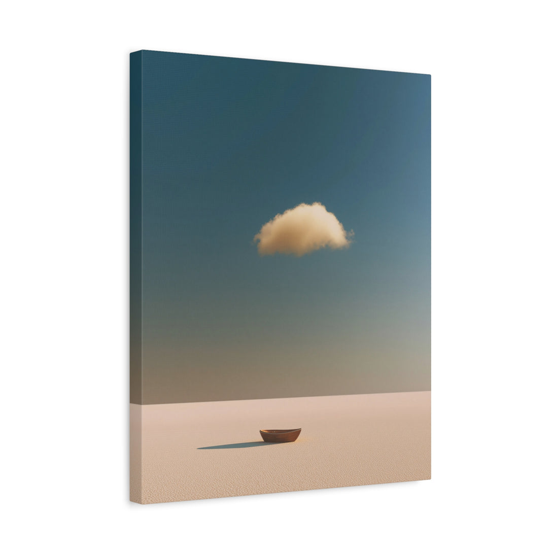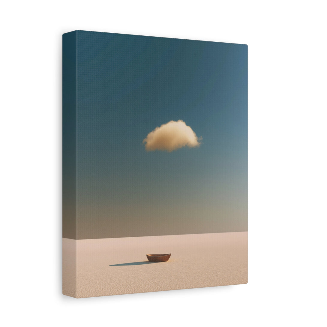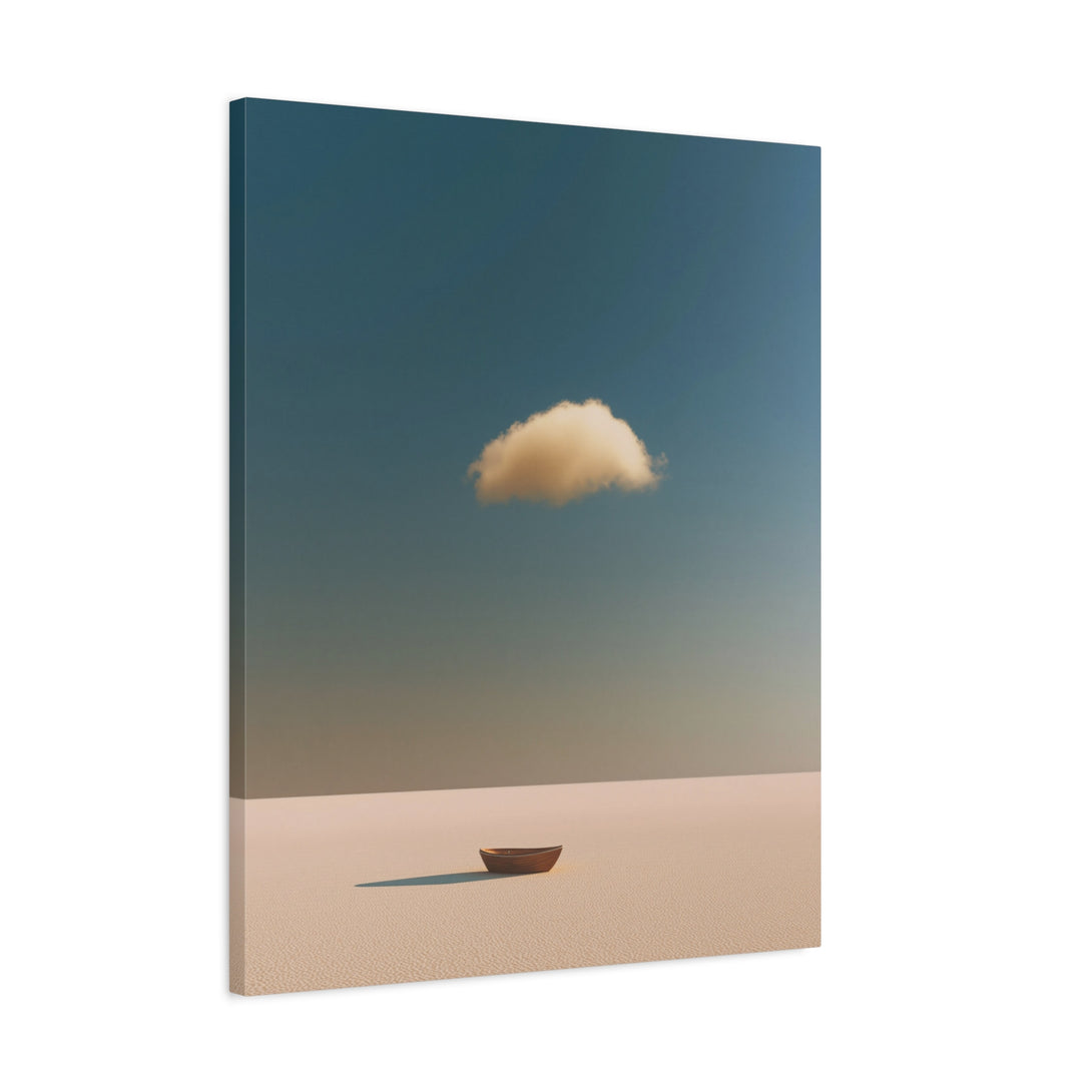 A small wooden boat gets lost in a quiet desert, but it isn’t alone. One friendly cloud floats above like a travel buddy, keeping the scene soft and hopeful. Minimal, surreal, introvert-safe calm.