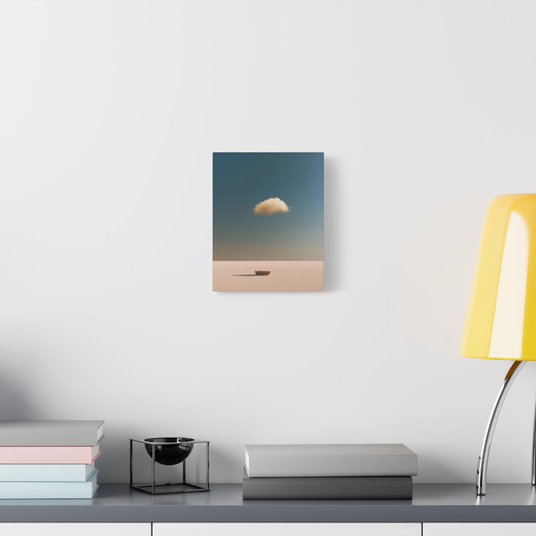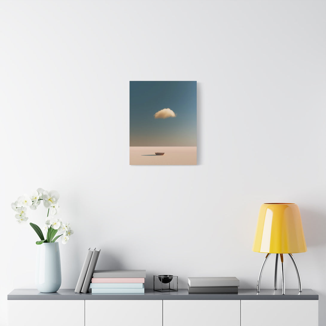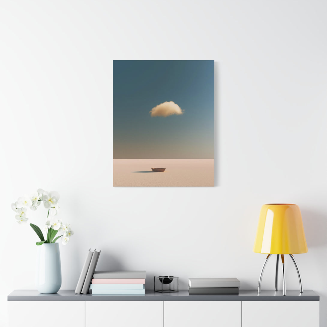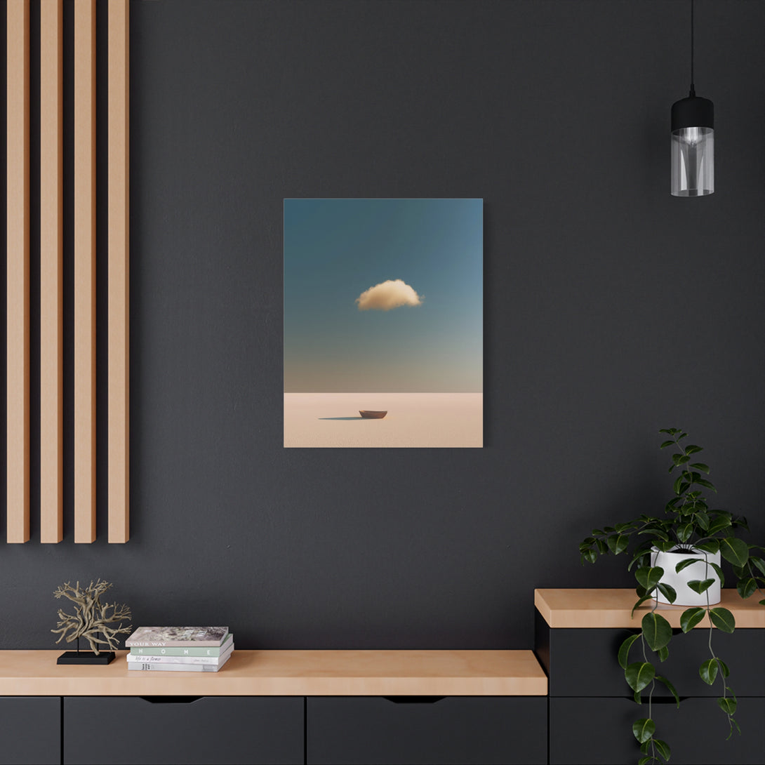 A small wooden boat gets lost in a quiet desert, but it isn’t alone. One friendly cloud floats above like a travel buddy, keeping the scene soft and hopeful. Minimal, surreal, introvert-safe calm.