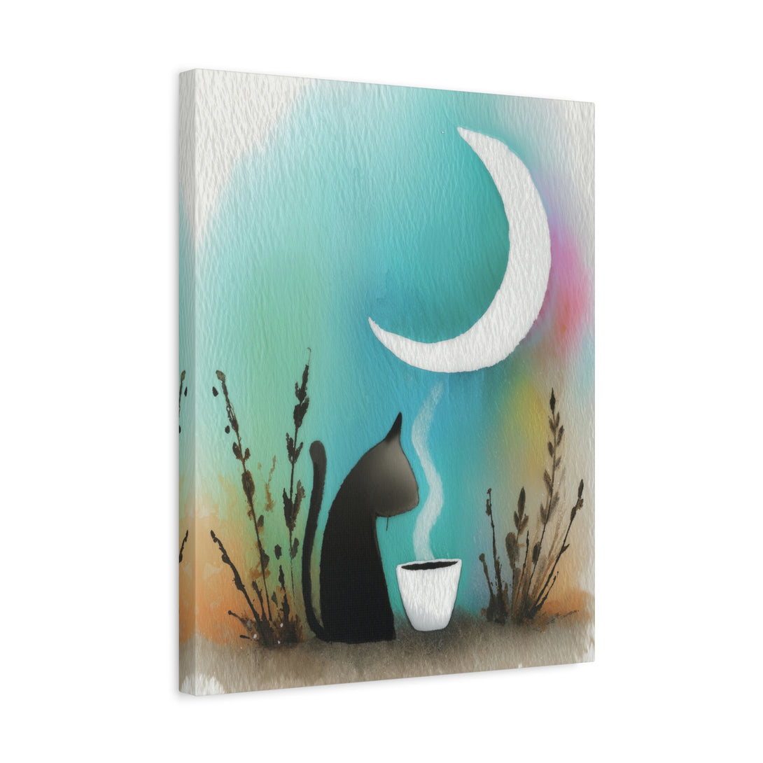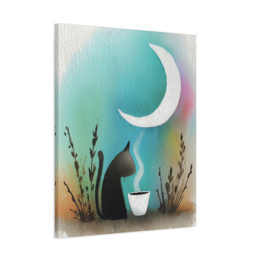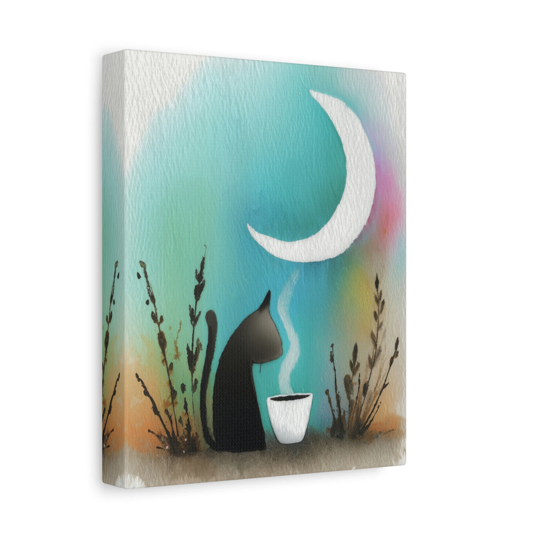 A quiet black cat, a steaming cup, and a crescent moon on a watercolor night, soft teal, warm edges, zero chatter. It’s the after-hours café for introverts: cozy, calm, and politely mysterious.