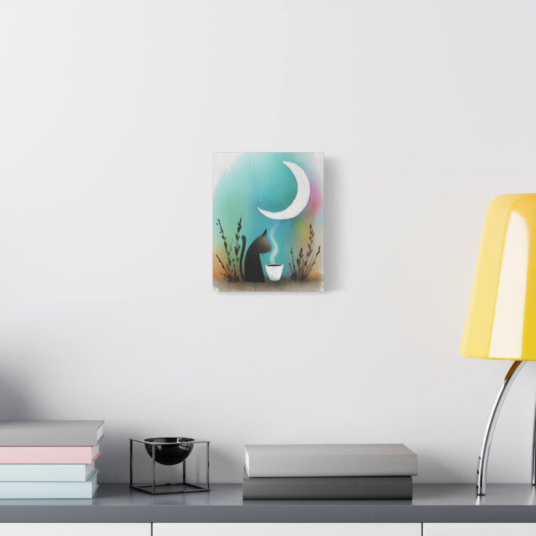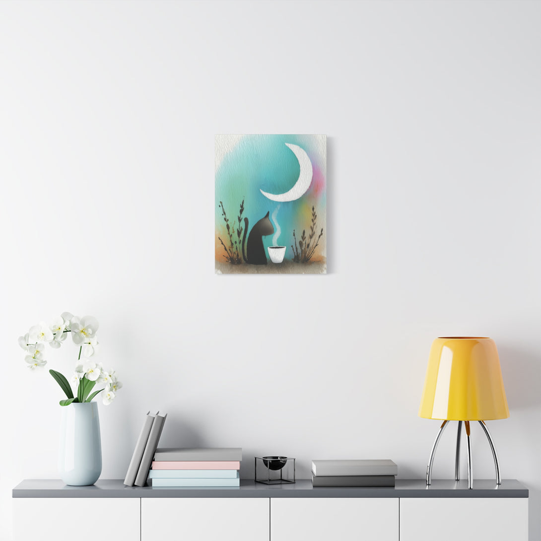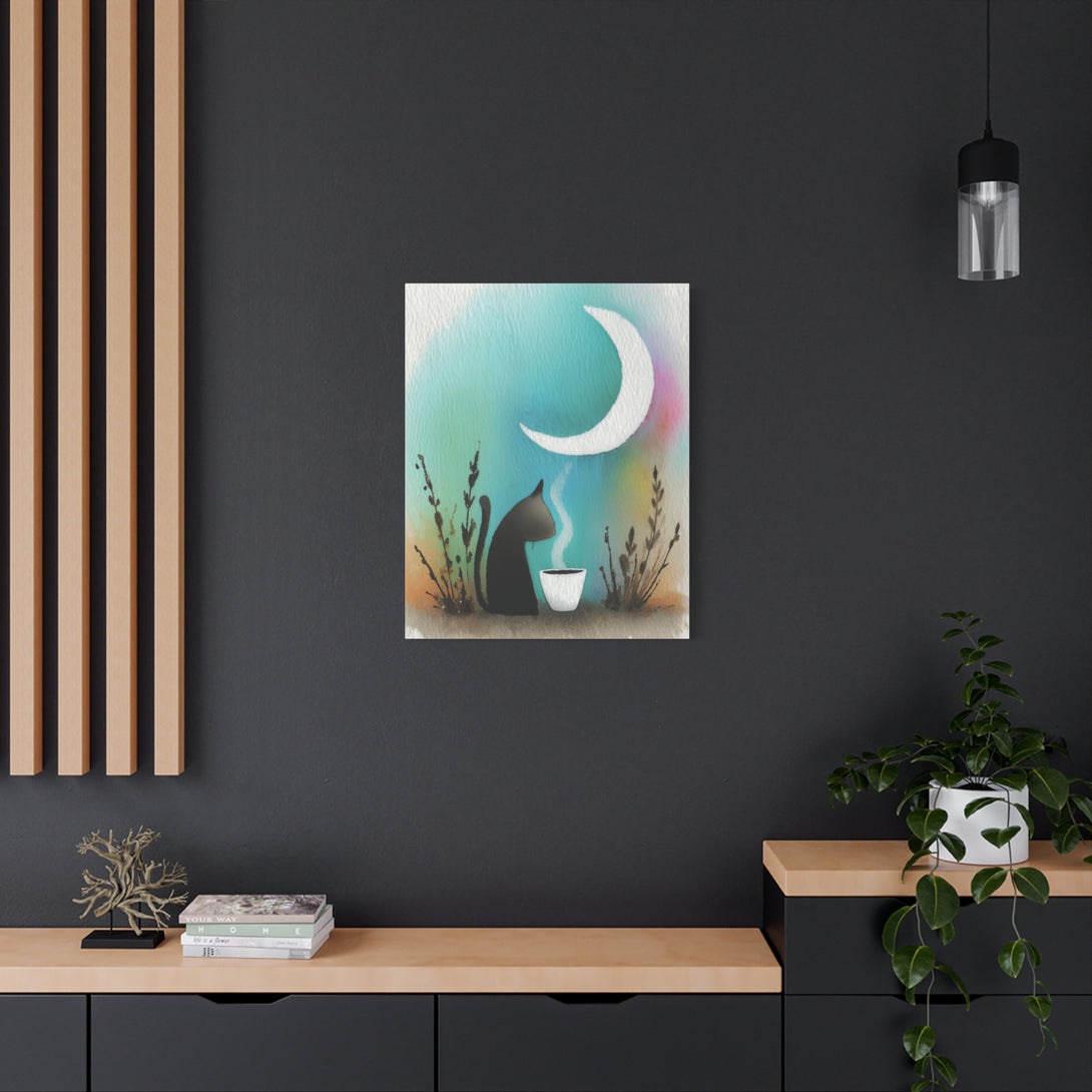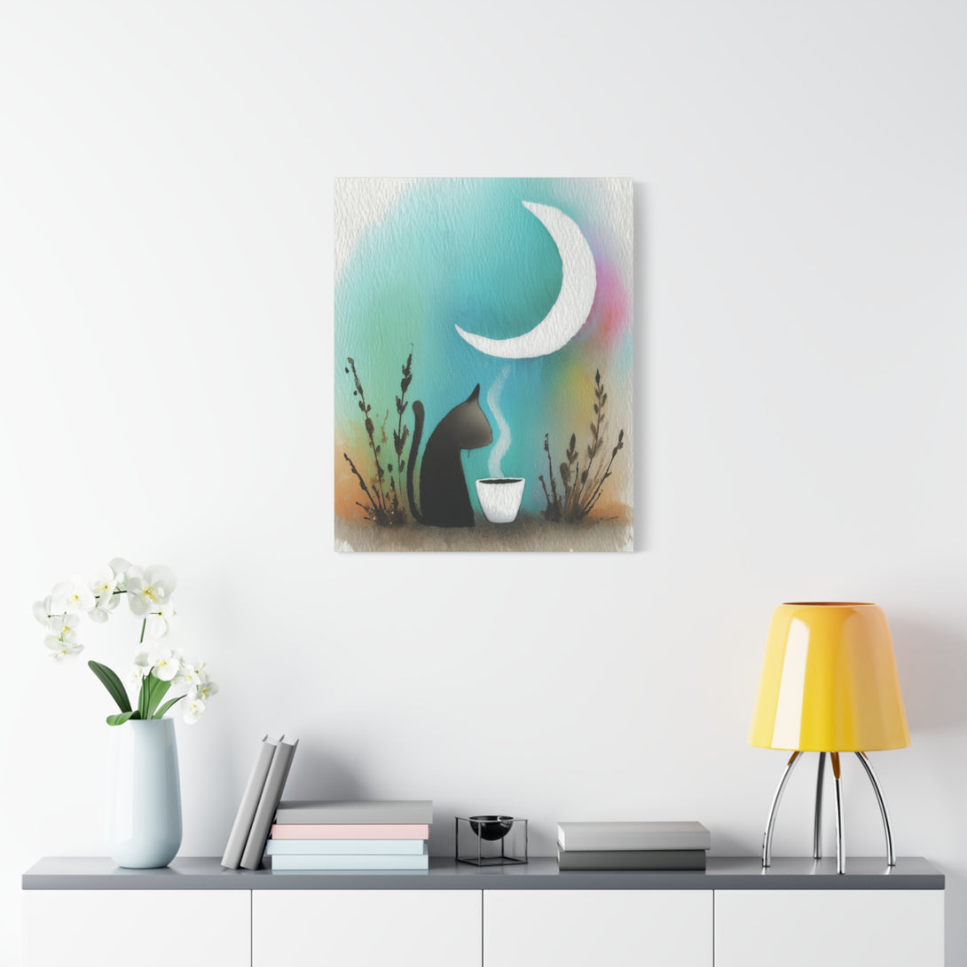 A quiet black cat, a steaming cup, and a crescent moon on a watercolor night, soft teal, warm edges, zero chatter. It’s the after-hours café for introverts: cozy, calm, and politely mysterious.