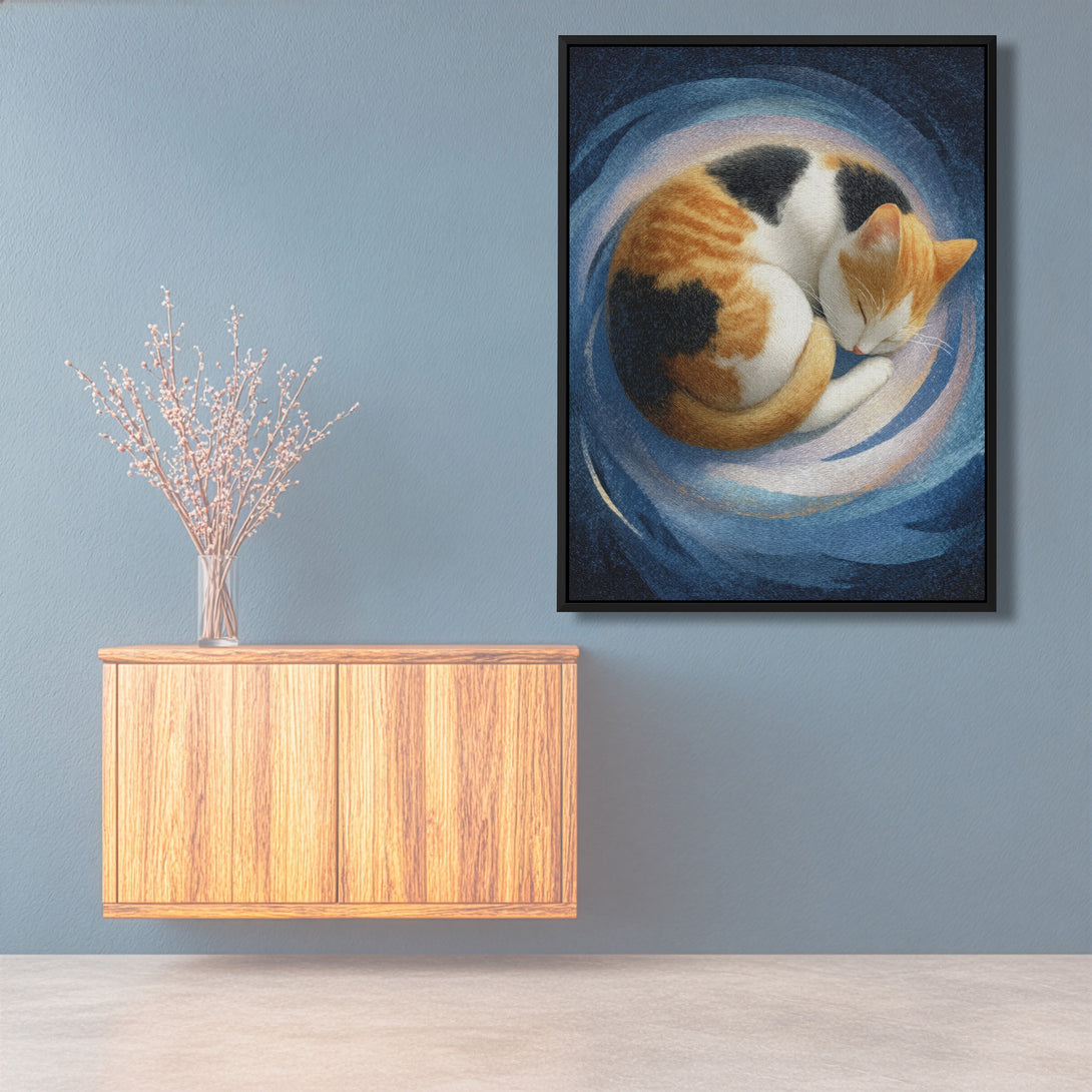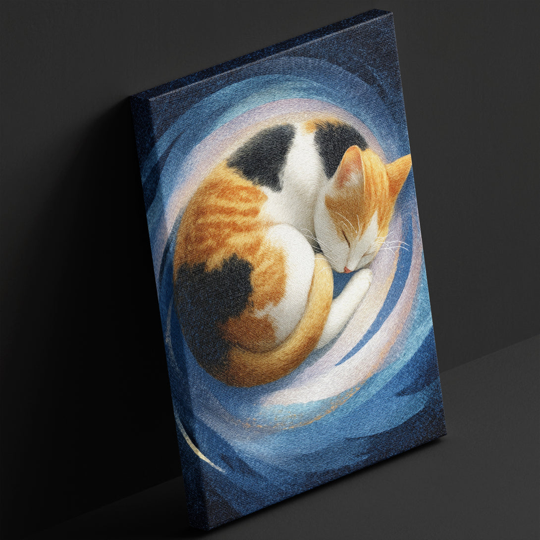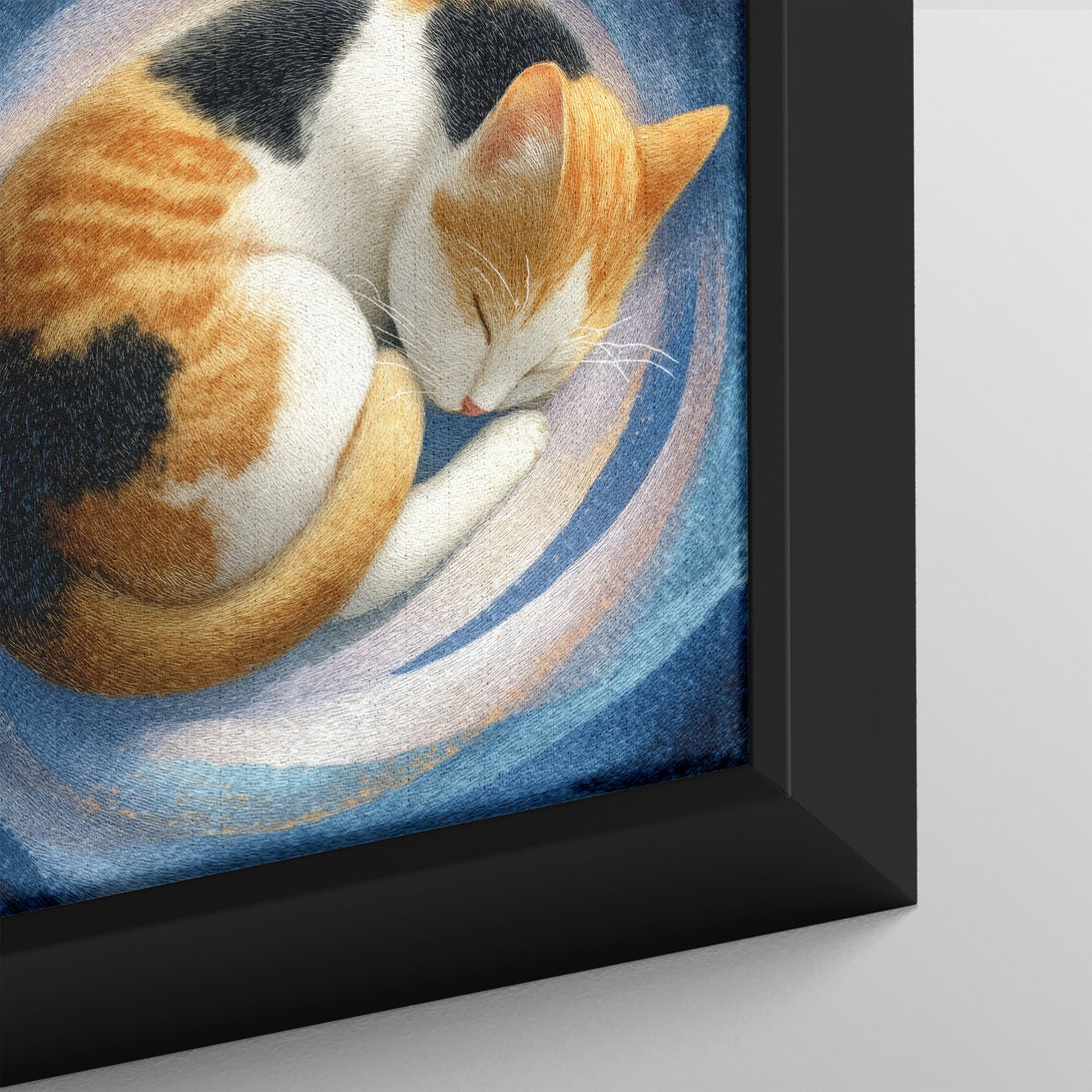Deep night blues curl around a sleeping calico, bringing a protective, restful hush to the room. Limited Release.