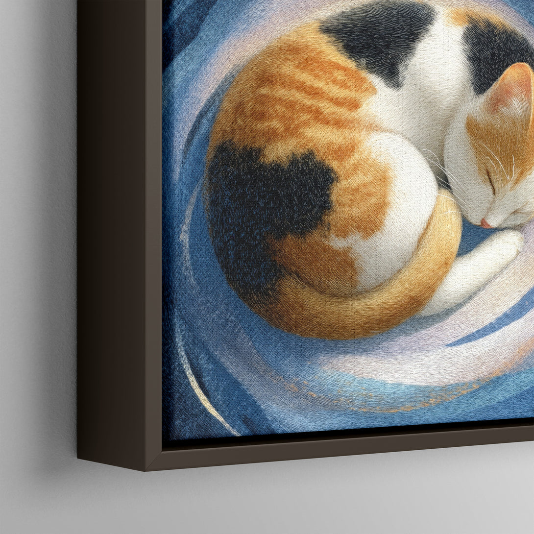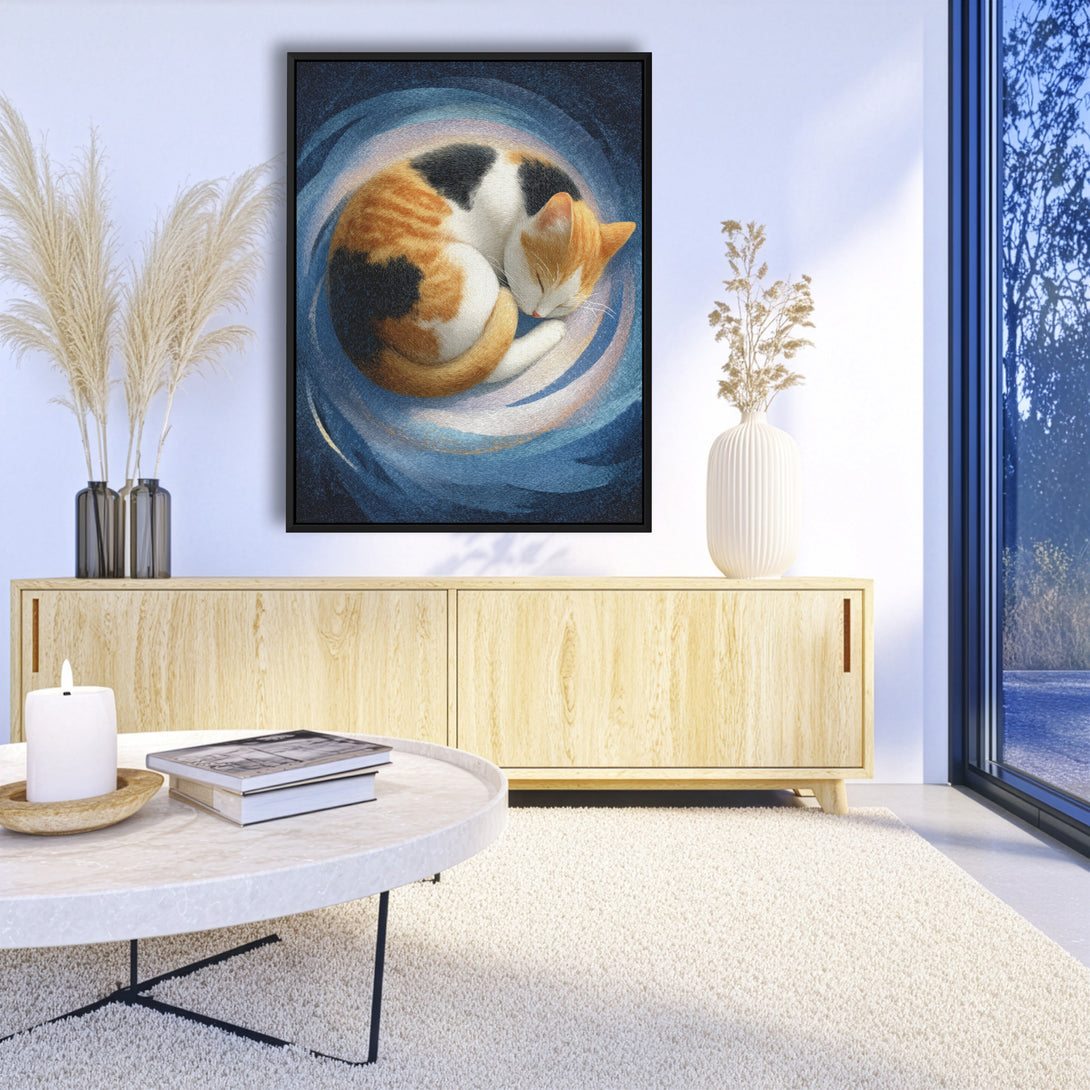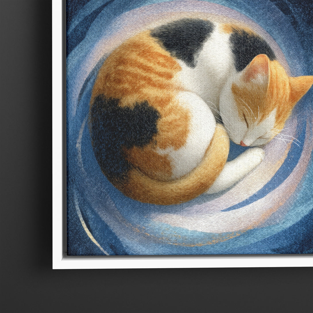 Deep night blues curl around a sleeping calico, bringing a protective, restful hush to the room. Limited Release.
