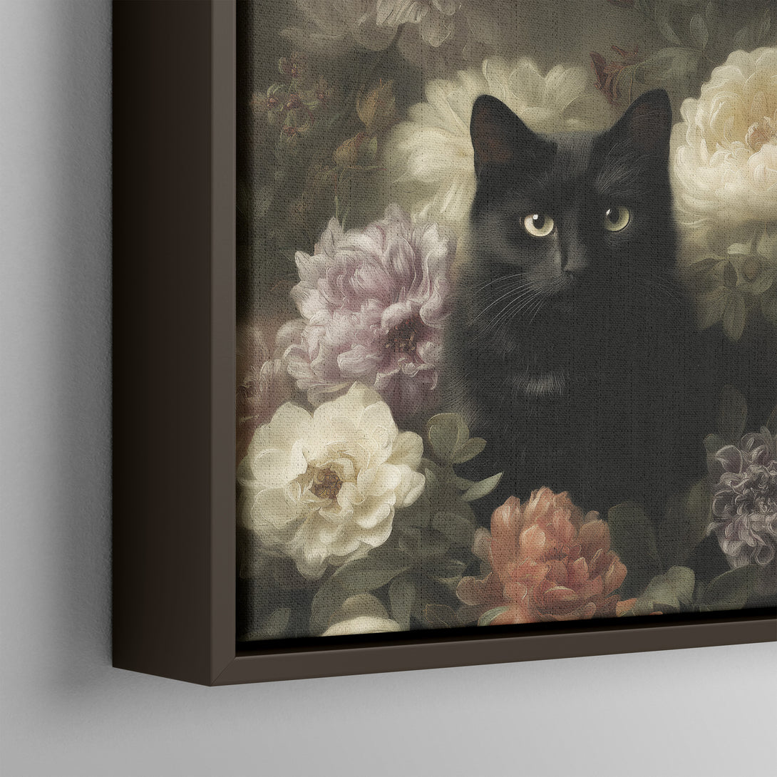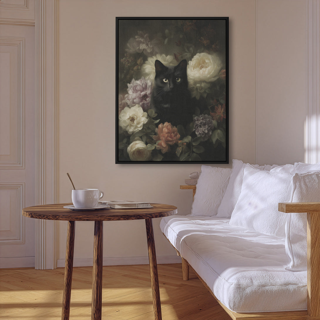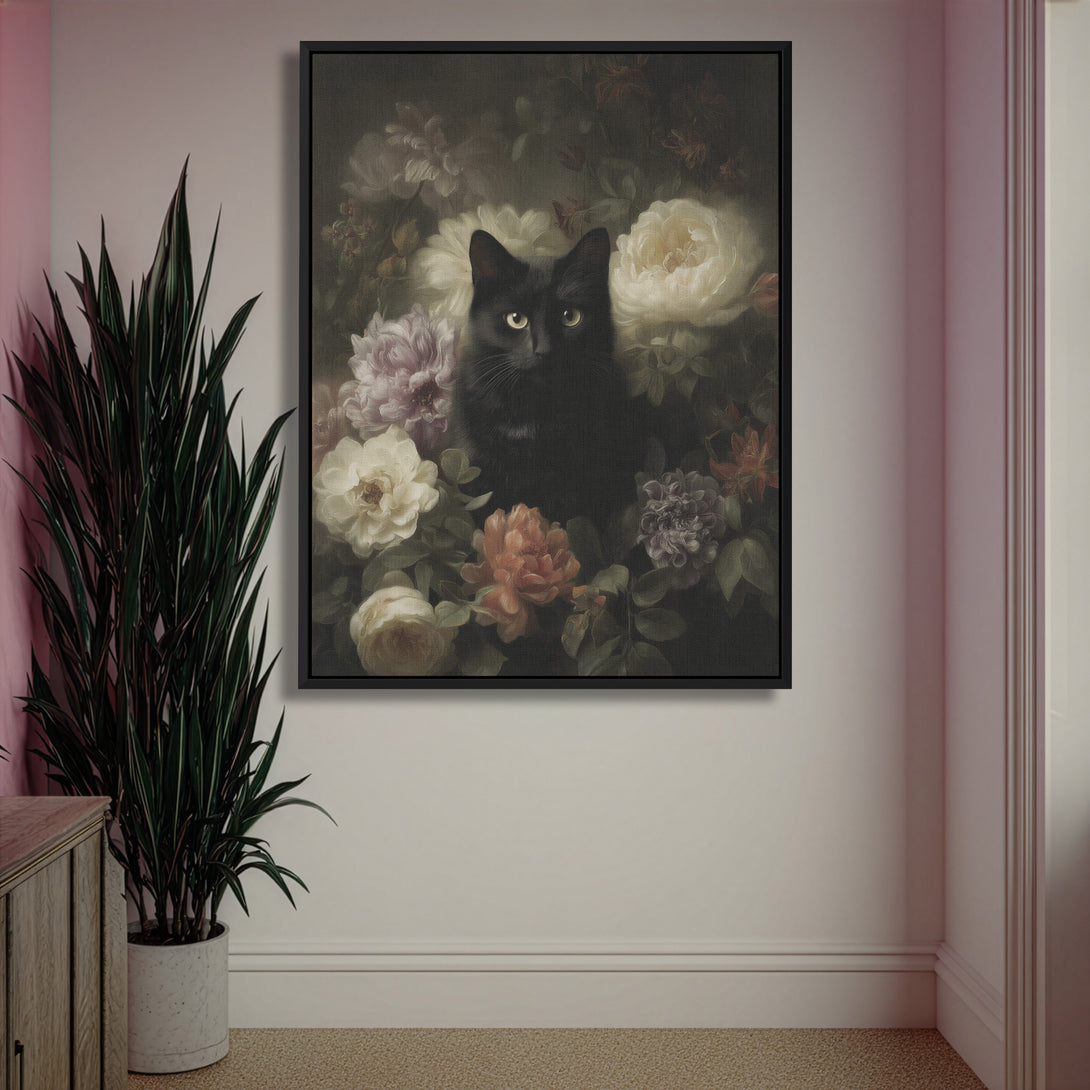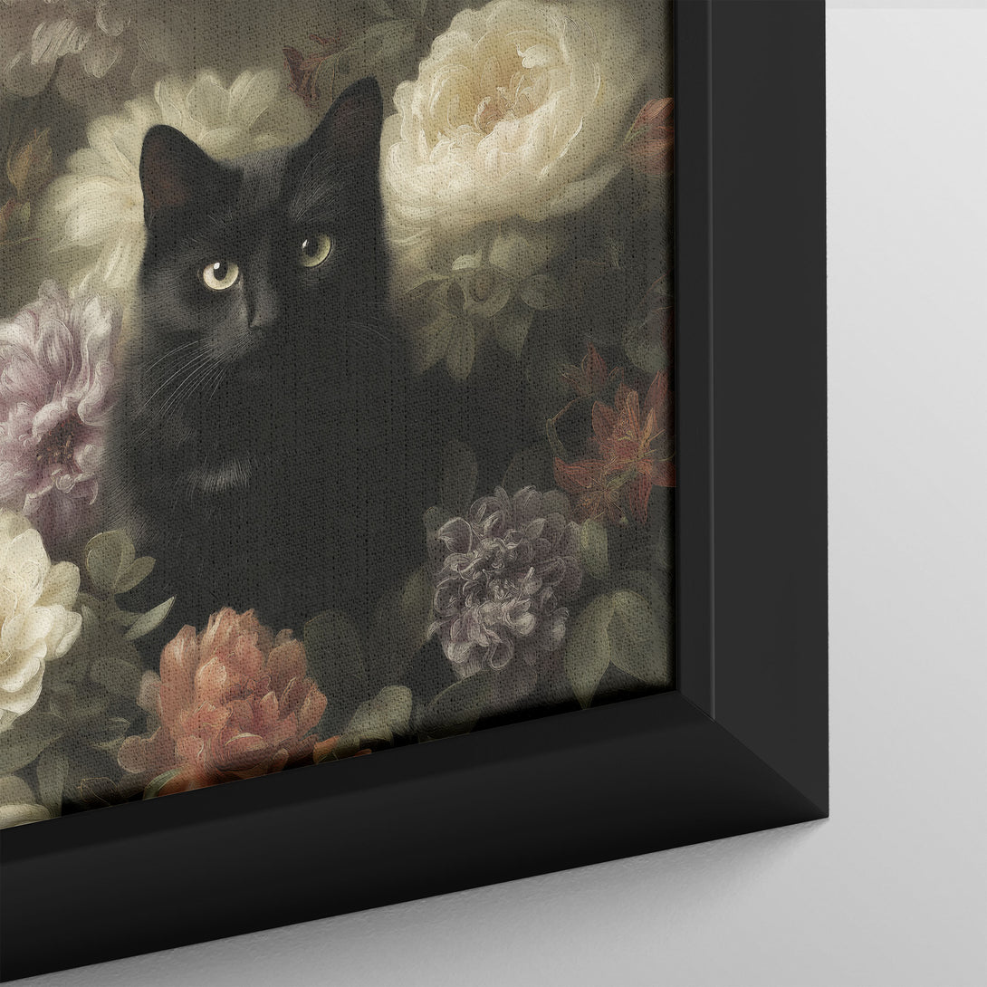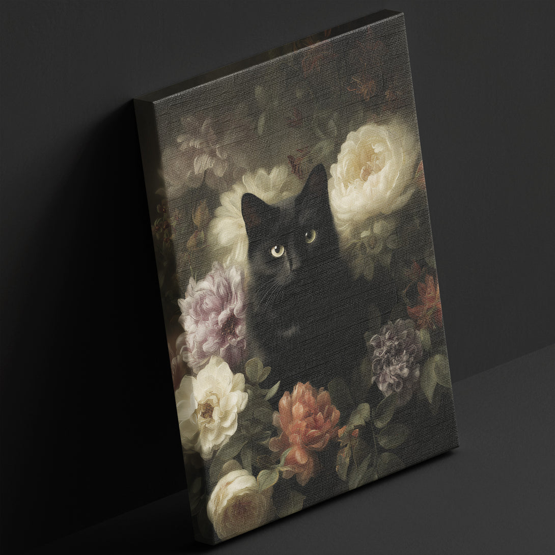 A calm black cat set among soft, old-paper blooms, vintage glow that warms a room without noise. Limited Release.