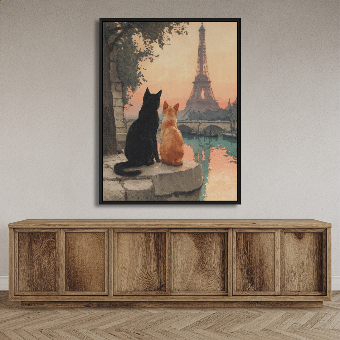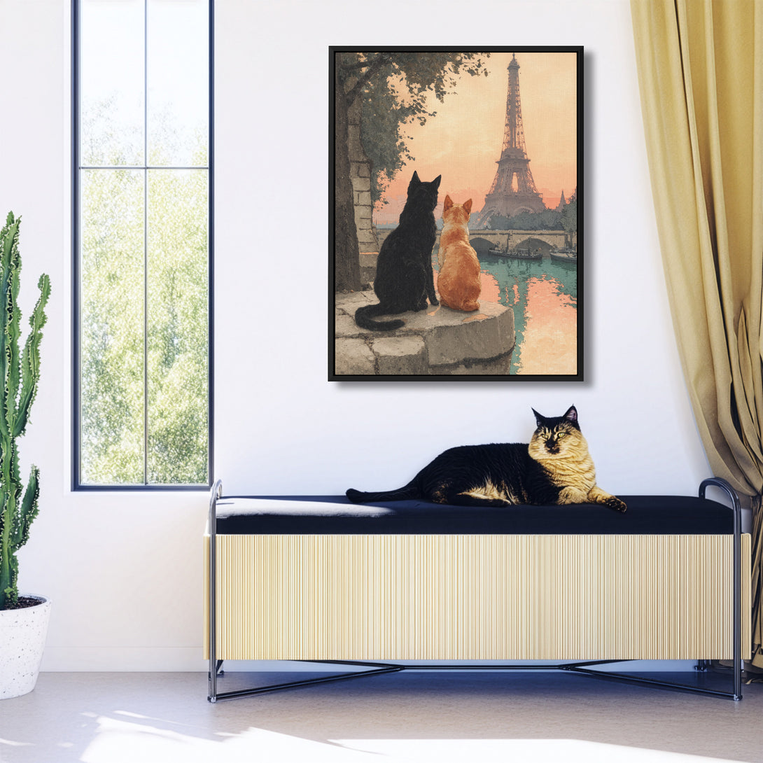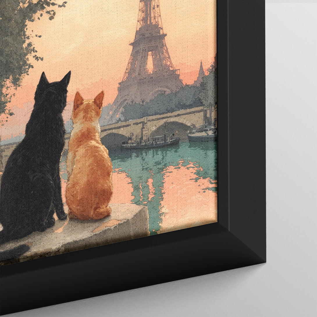 Soft sunset over the Seine, two quiet cats sharing a calm view, nostalgic color that settles a room in one glance. Limited Release.
