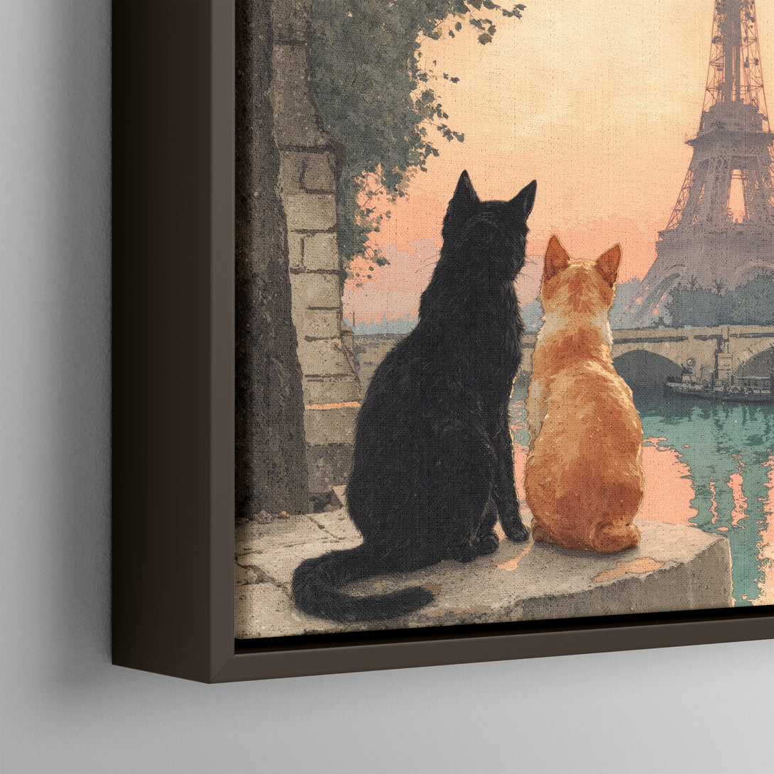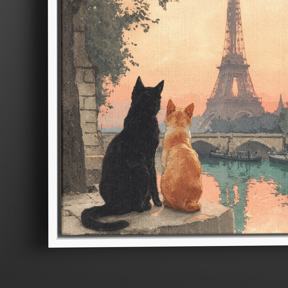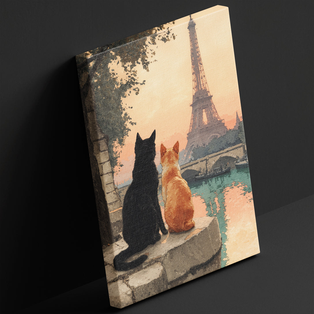 Soft sunset over the Seine, two quiet cats sharing a calm view, nostalgic color that settles a room in one glance. Limited Release.