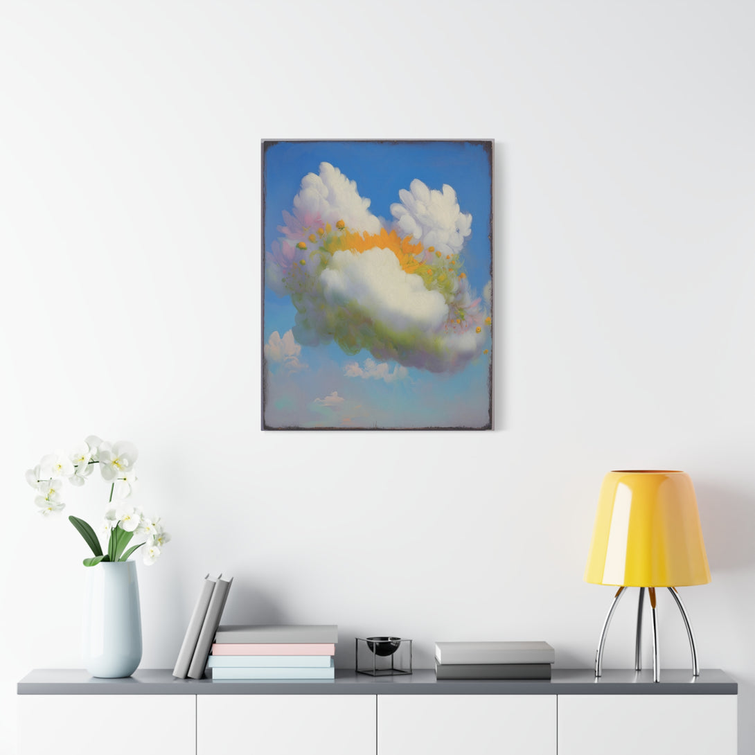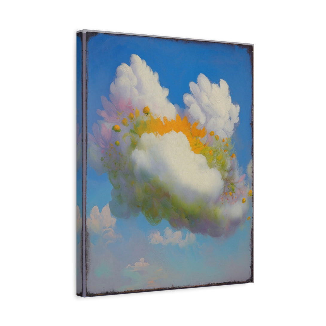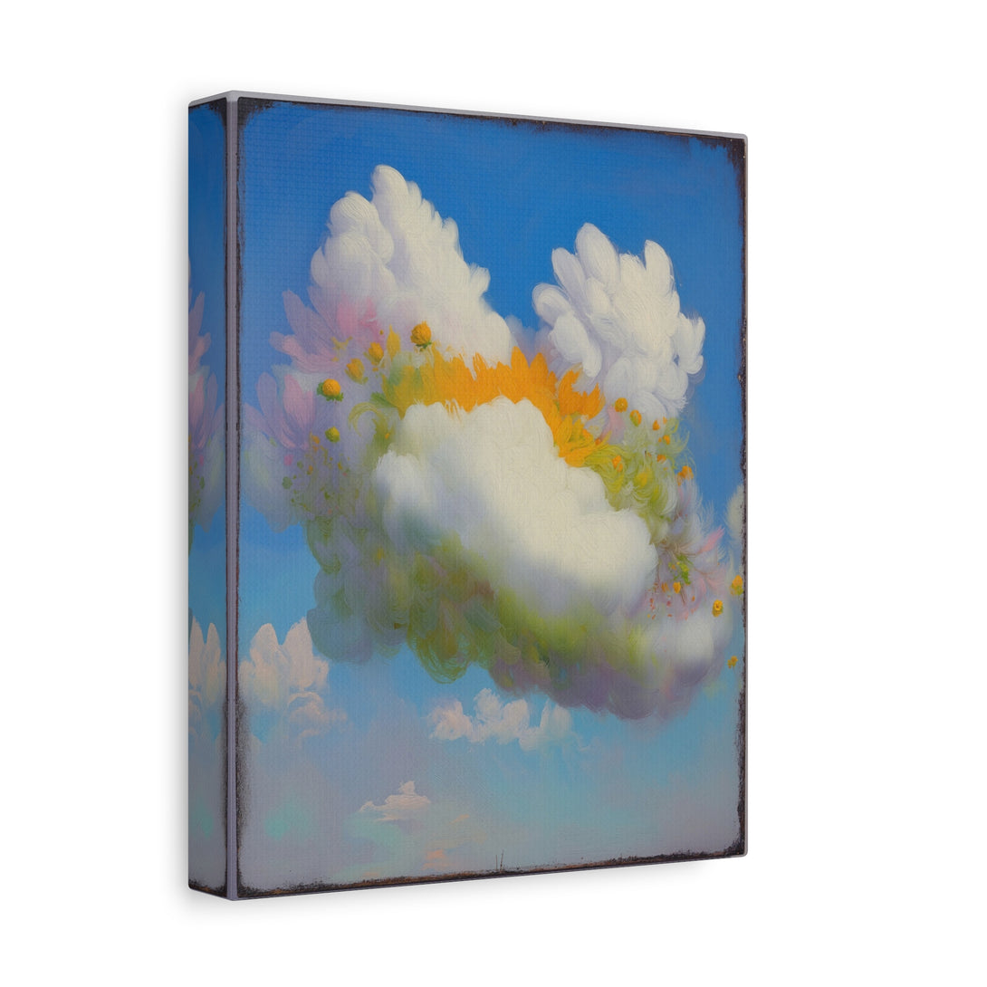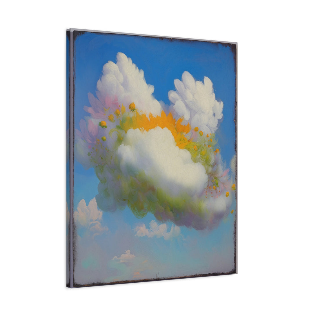 A fluffy oil-paint cloud stuffed with sunny petals drifts across a clear blue sky, weather report for introverts: calm, warm, zero small talk. Soft brush swirls, dreamy color, quietly happy on any wall.