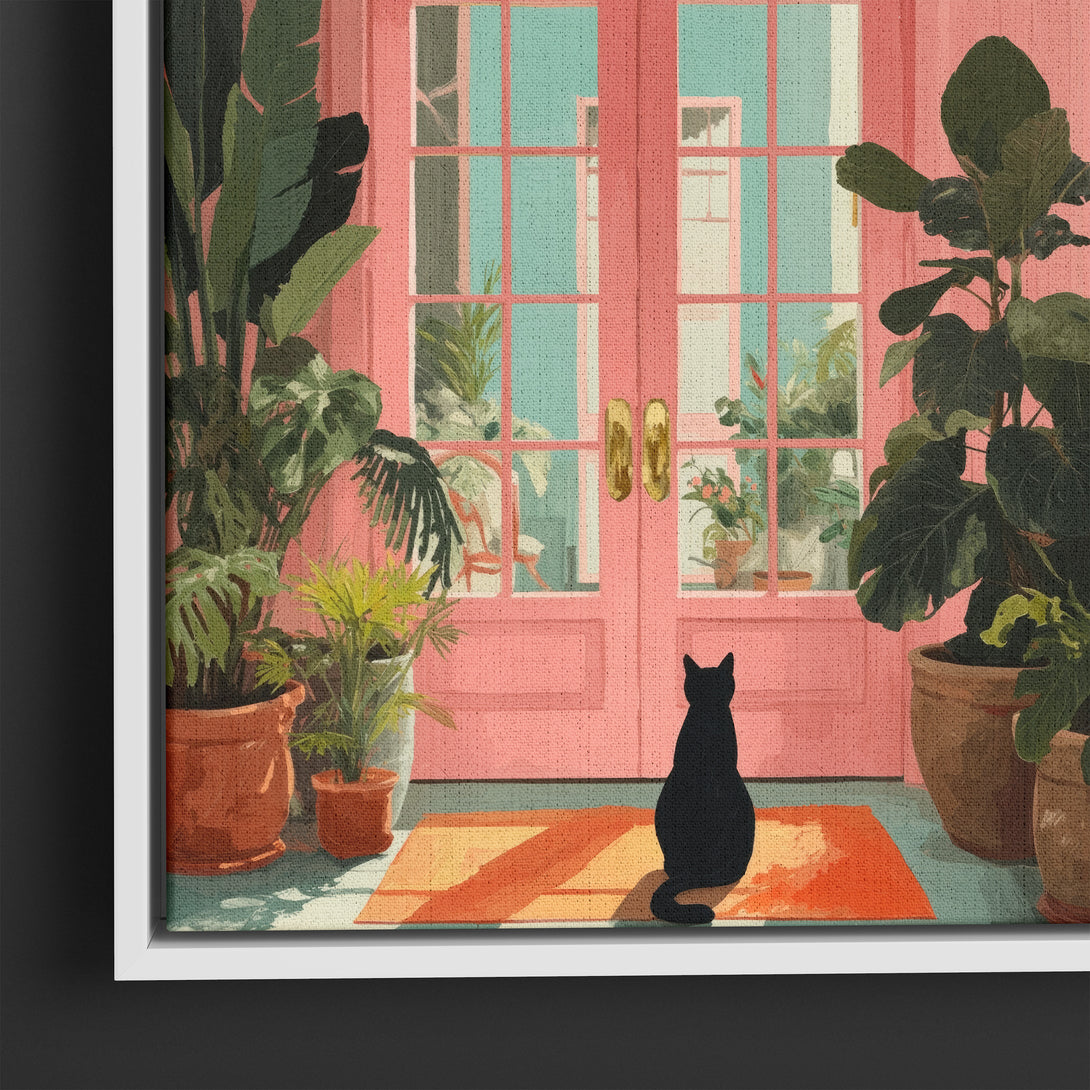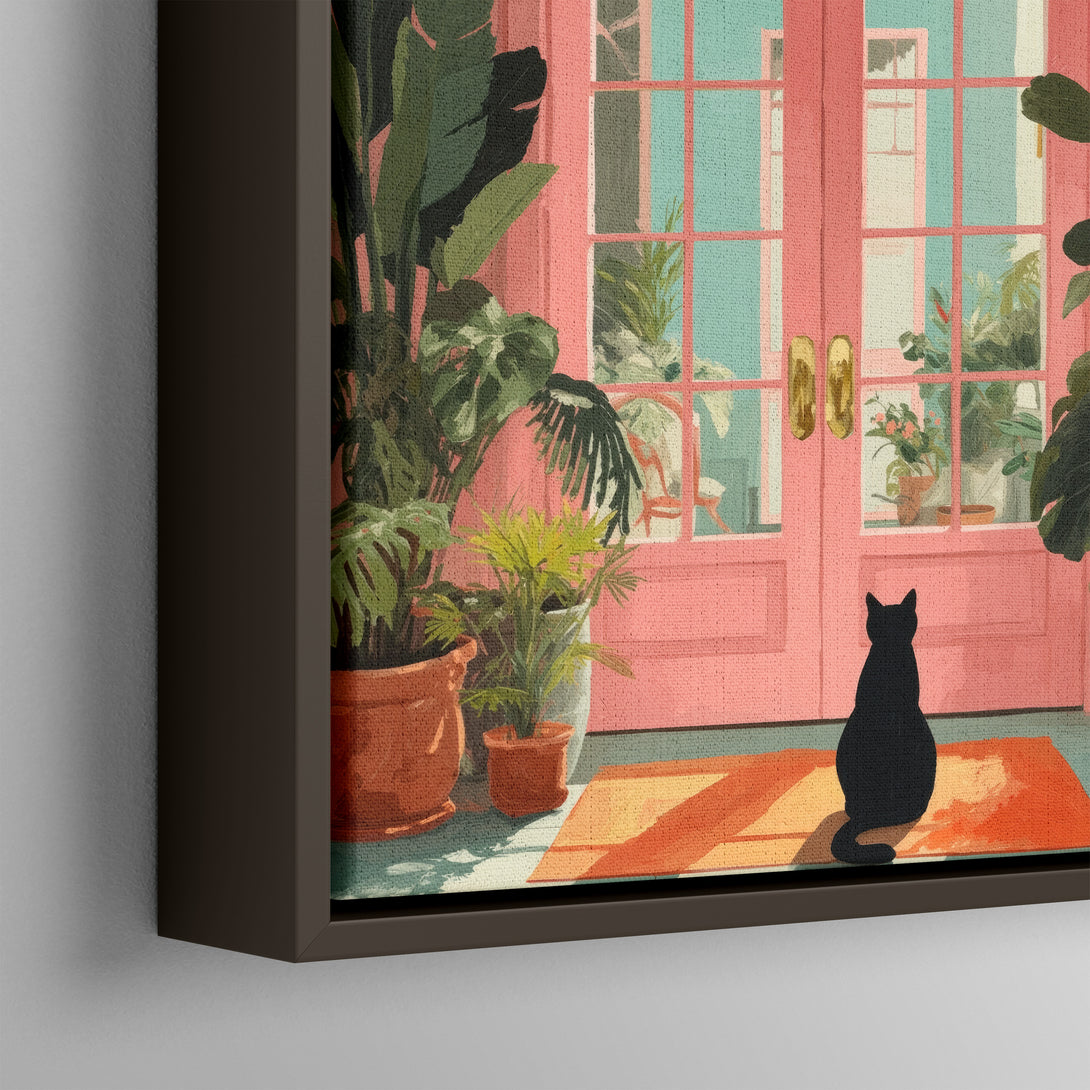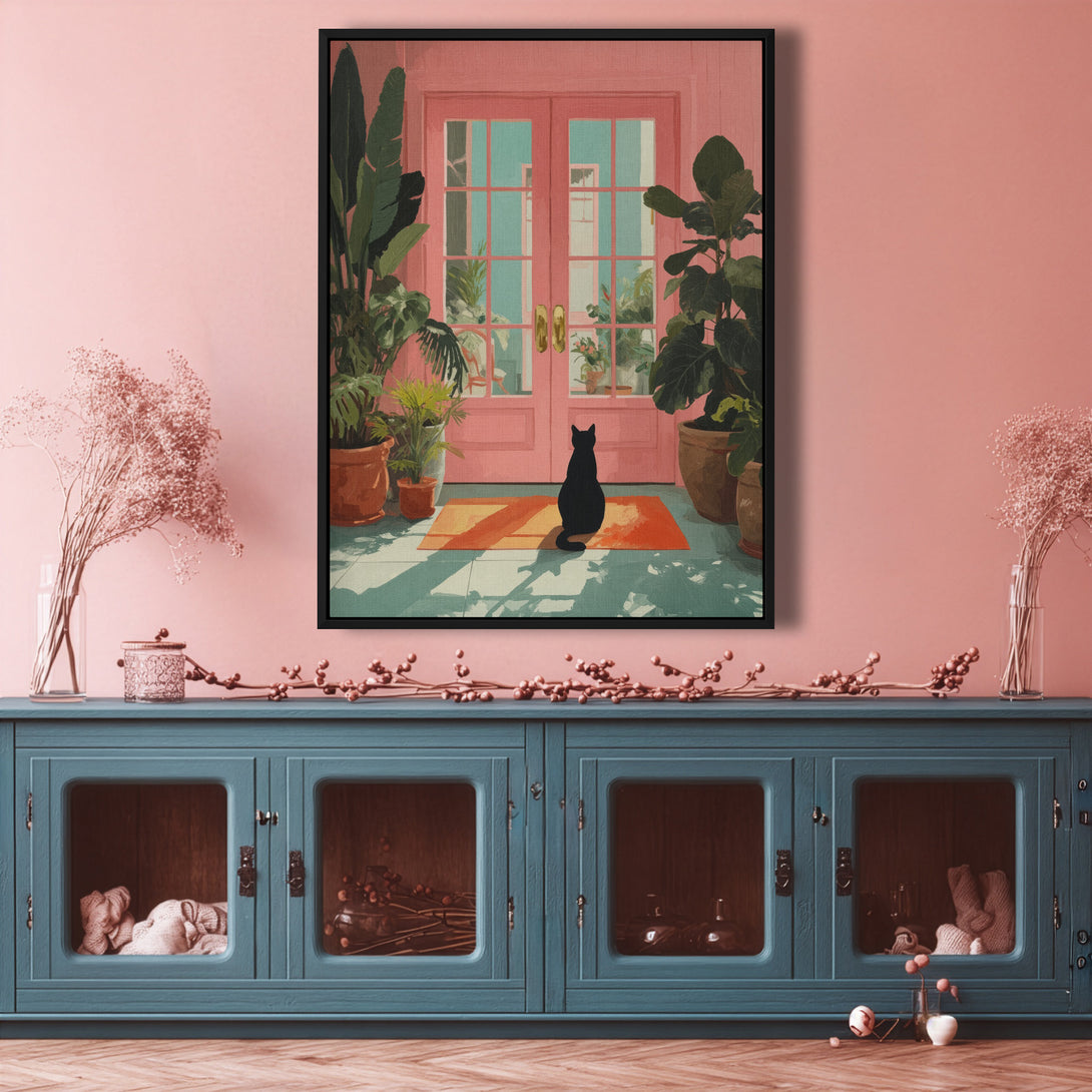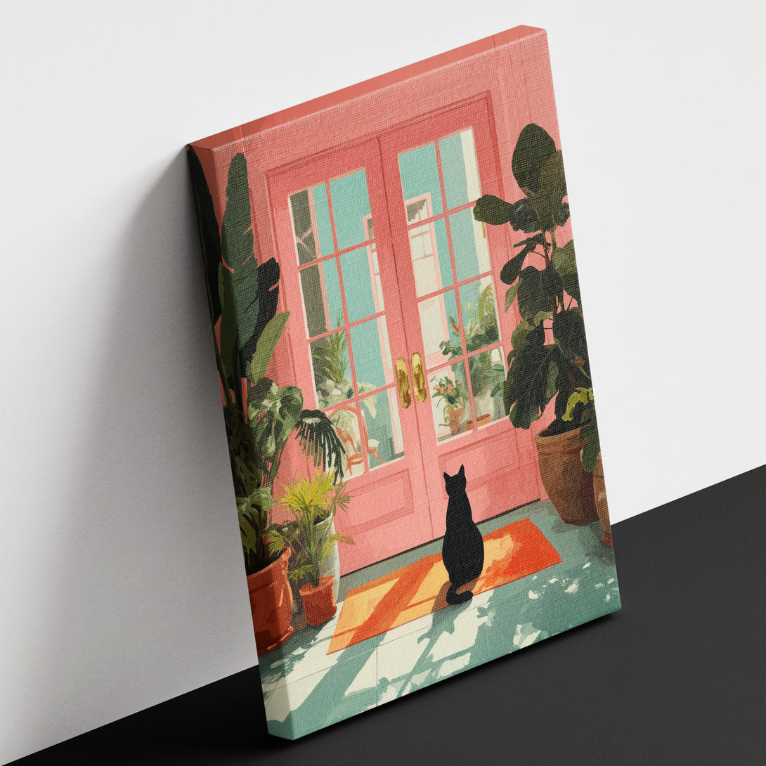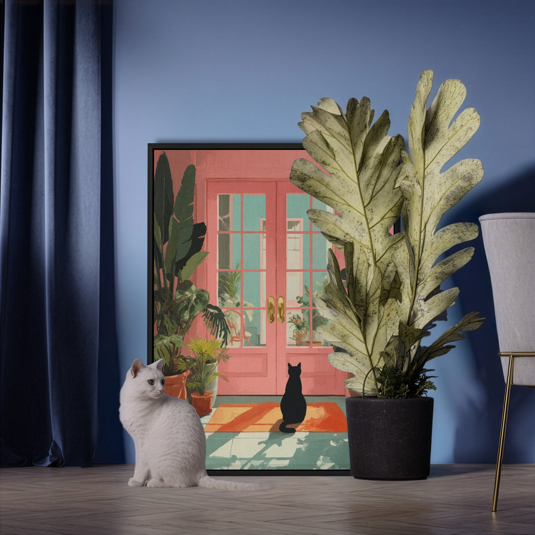 Pastel light through a pink door, one quiet cat, many green leaves, the room softens on sight. Airy calm for bright corners. Limited Release.