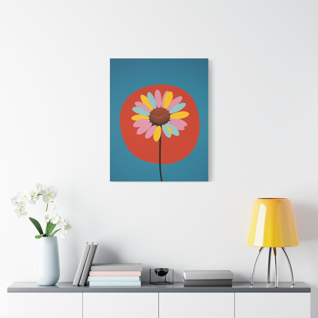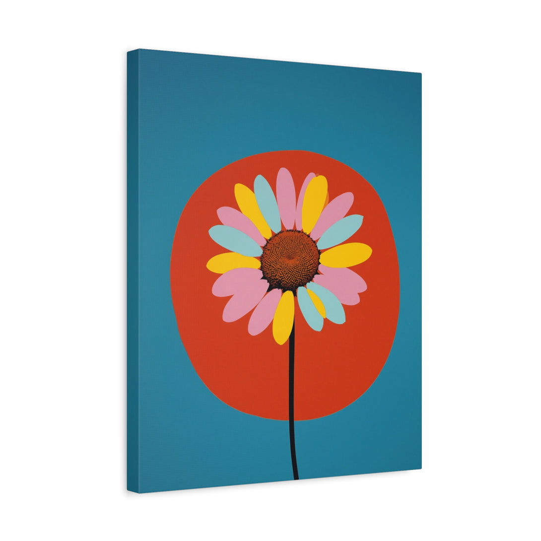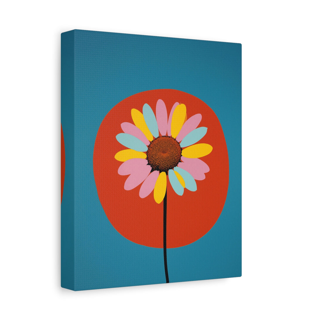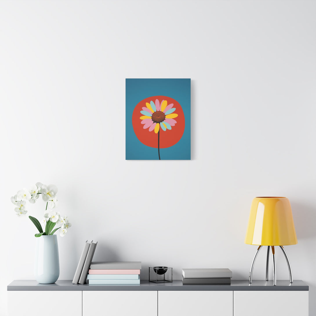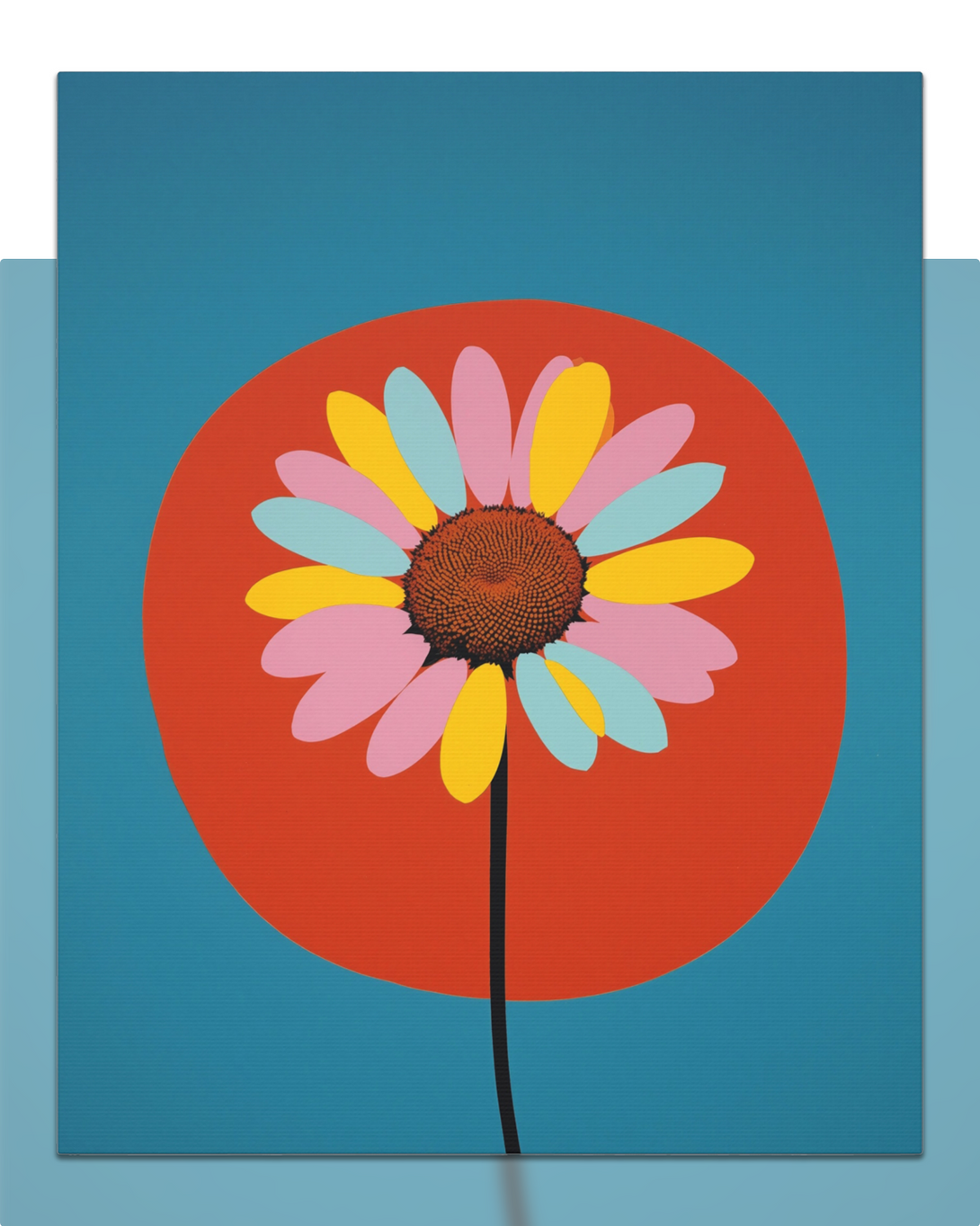 A minimal daisy doing the most, multicolor petals pop against a bold orange halo and calm teal sky. It’s cheerful without yelling, perfect for introverts who like their décor to wave hello from across the room.
