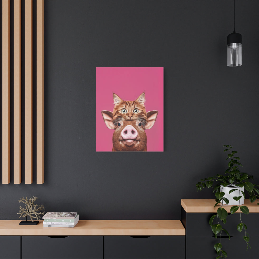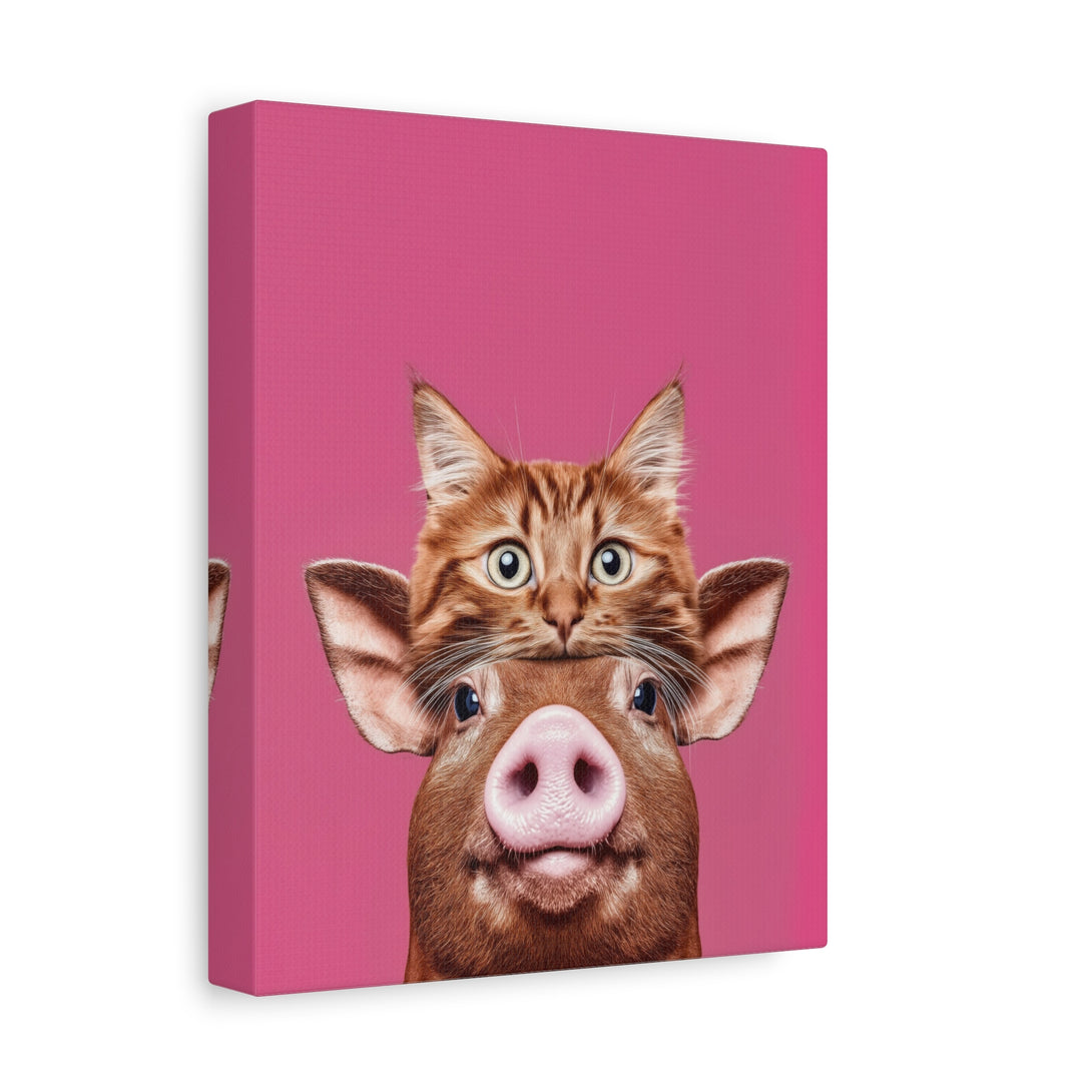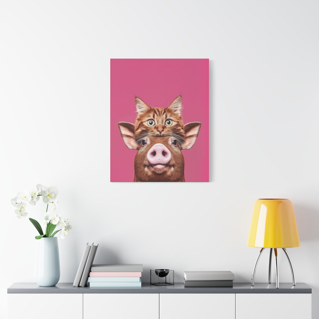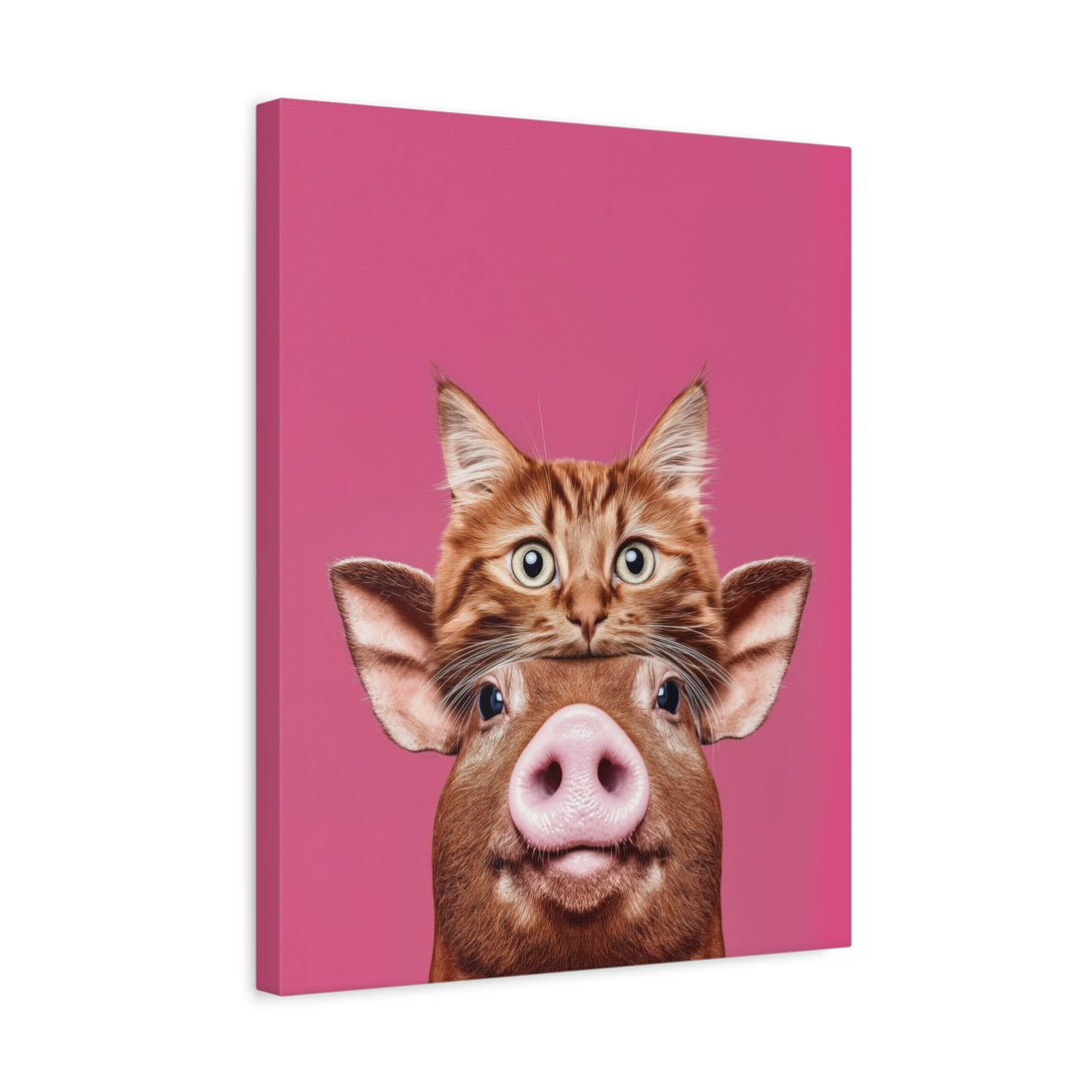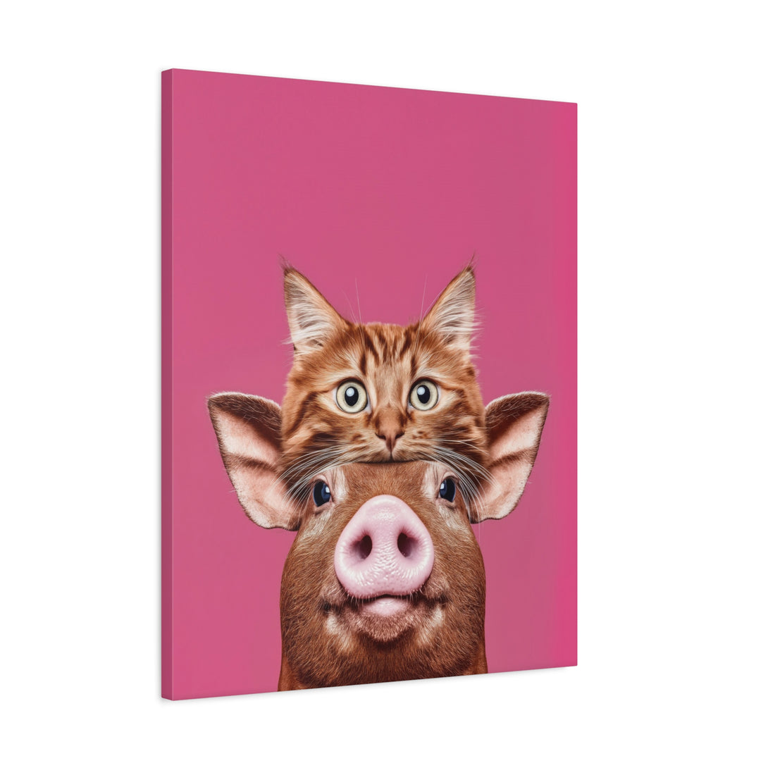 Two besties, one braincell. A cat calmly riding a pig on a pink backdrop, playful, quietly chaotic, and weirdly soothing.