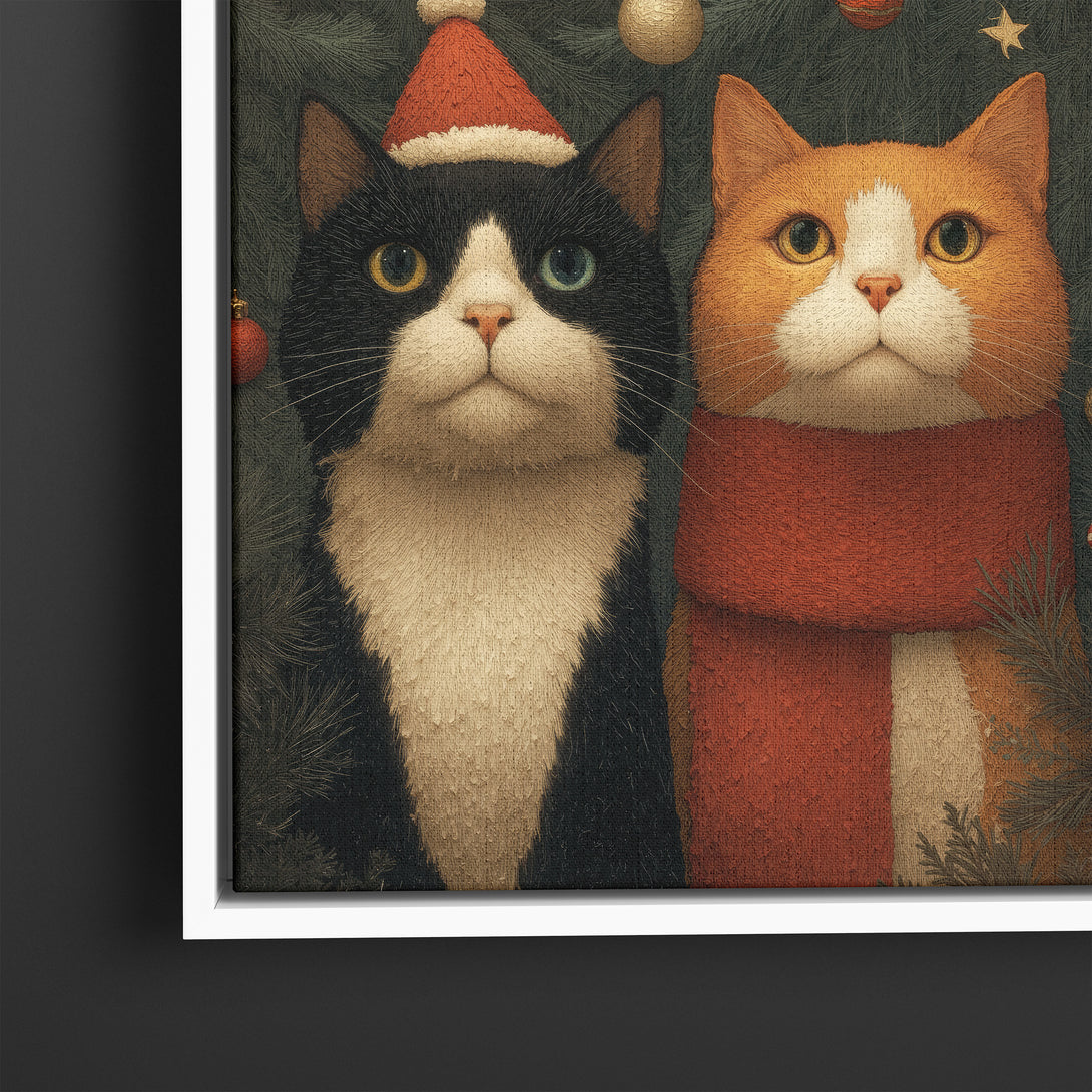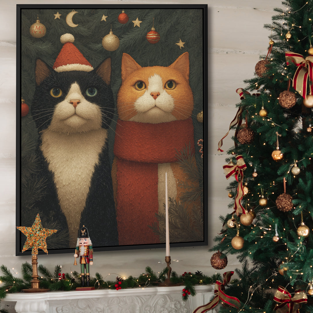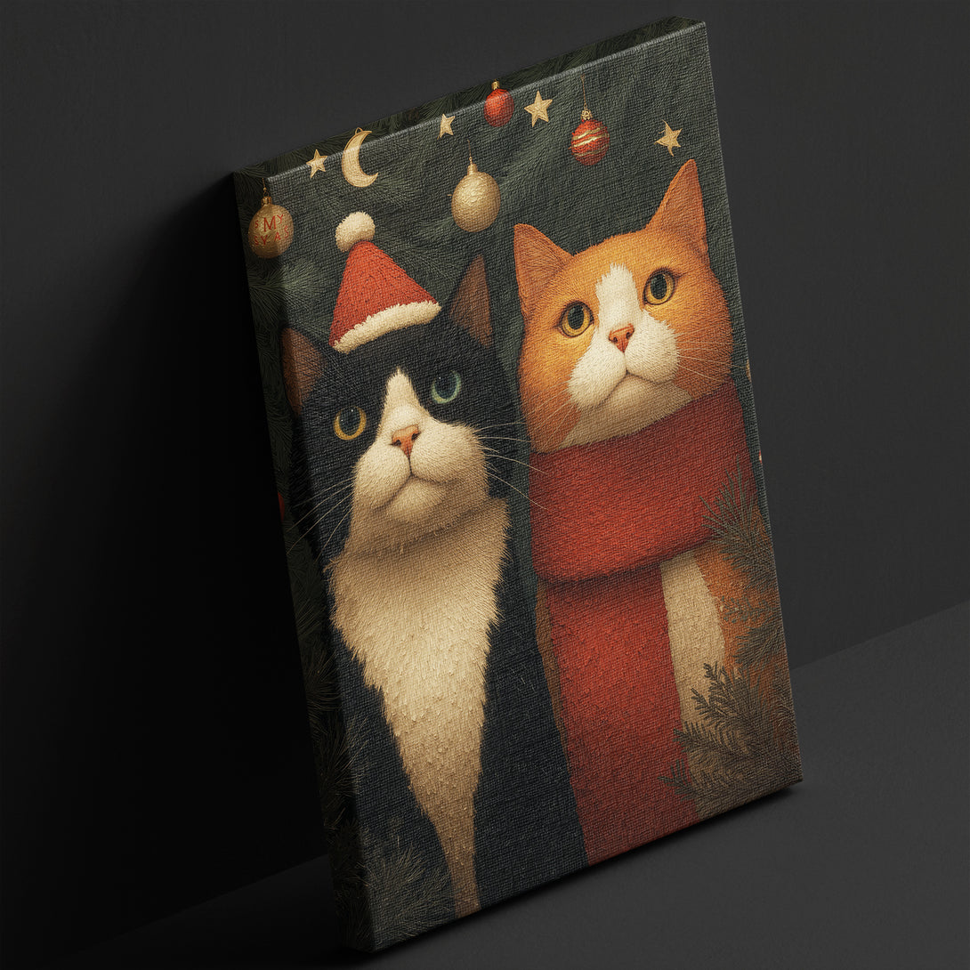 Warm holiday hush, two calm cats among evergreen and soft lights bring a gentle festive mood to your space. Limited Release.