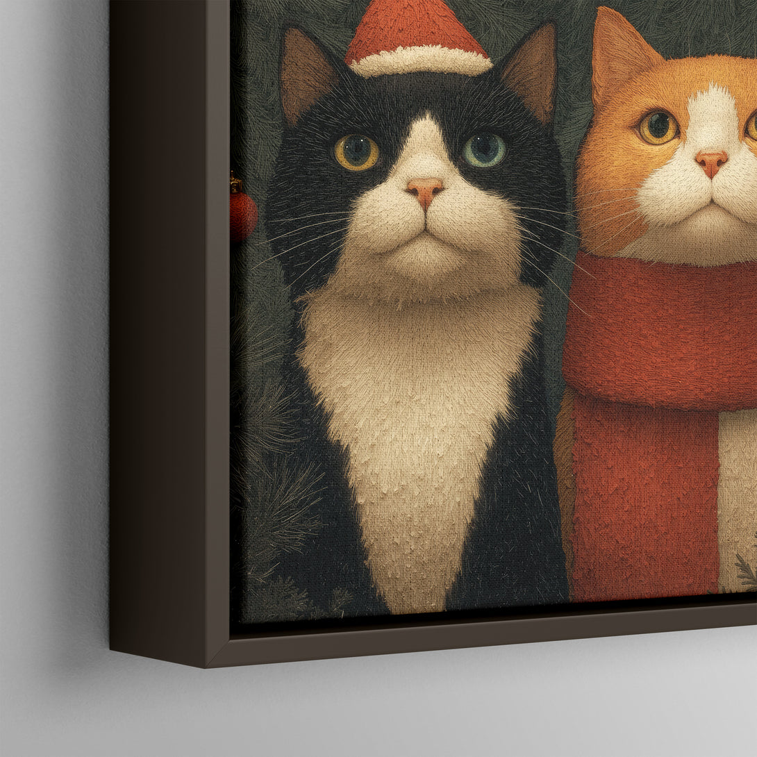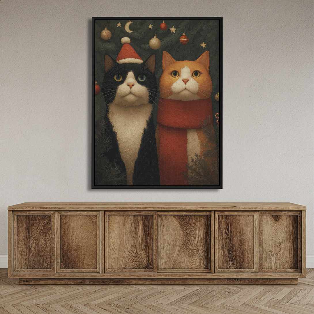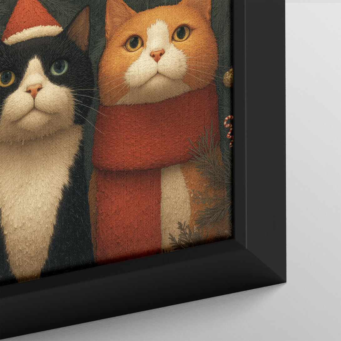 Warm holiday hush, two calm cats among evergreen and soft lights bring a gentle festive mood to your space. Limited Release.