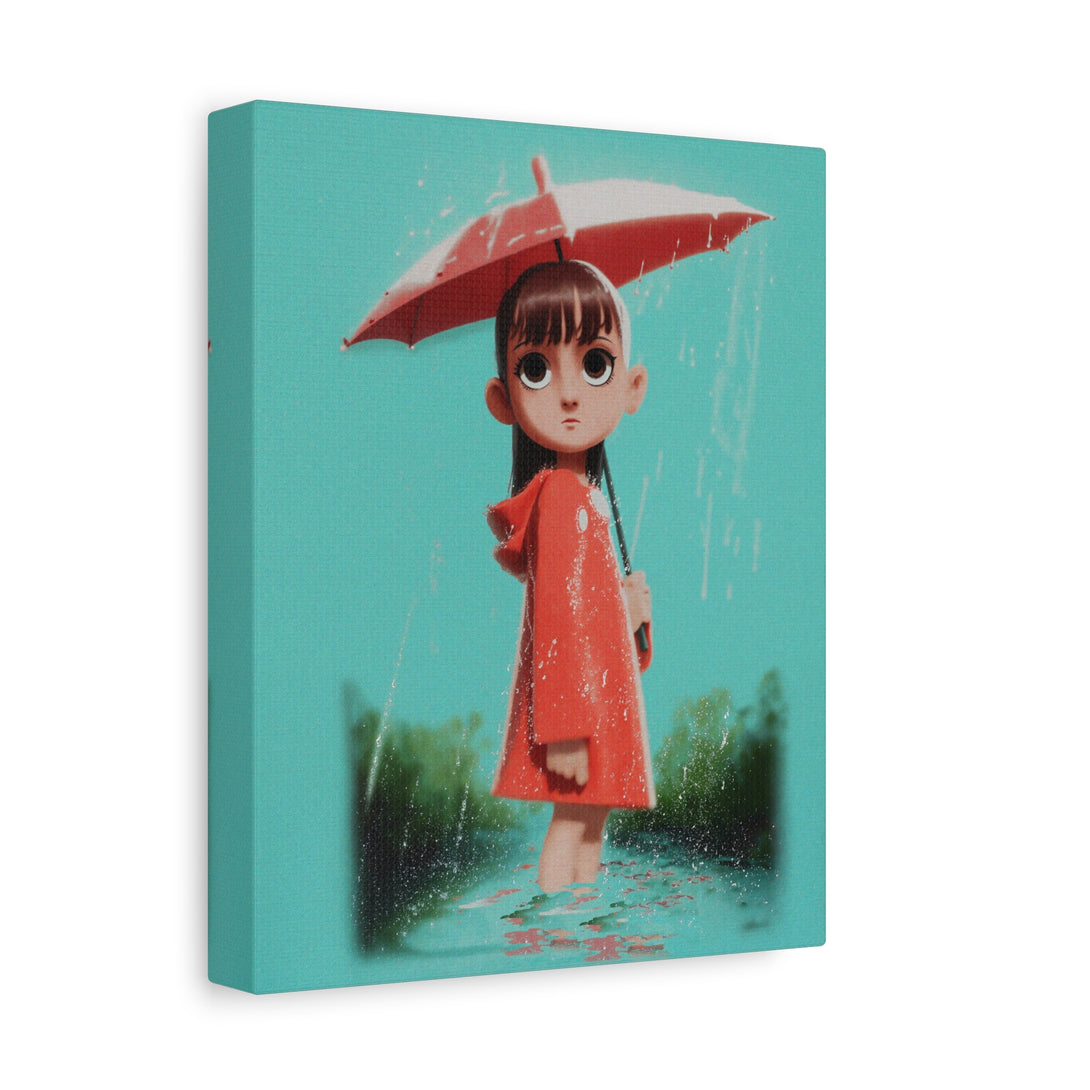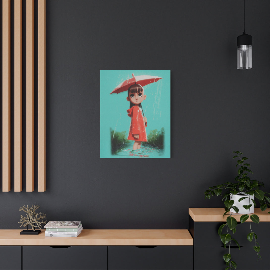 Some days it rains outside and inside. A big-eyed girl in a red raincoat stands ankle-deep with an umbrella, giving quiet “I RSVP’d maybe” energy. Aqua sky, soft grain, little splash details-calm, cozy, gently dramatic for introverts.