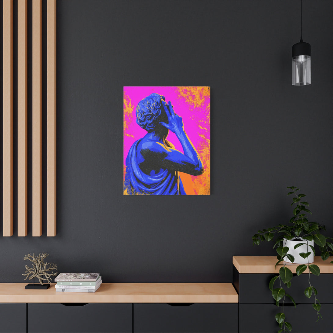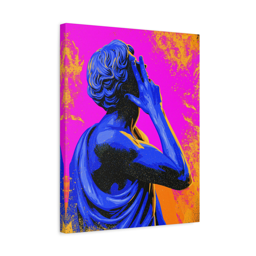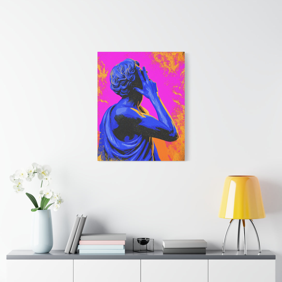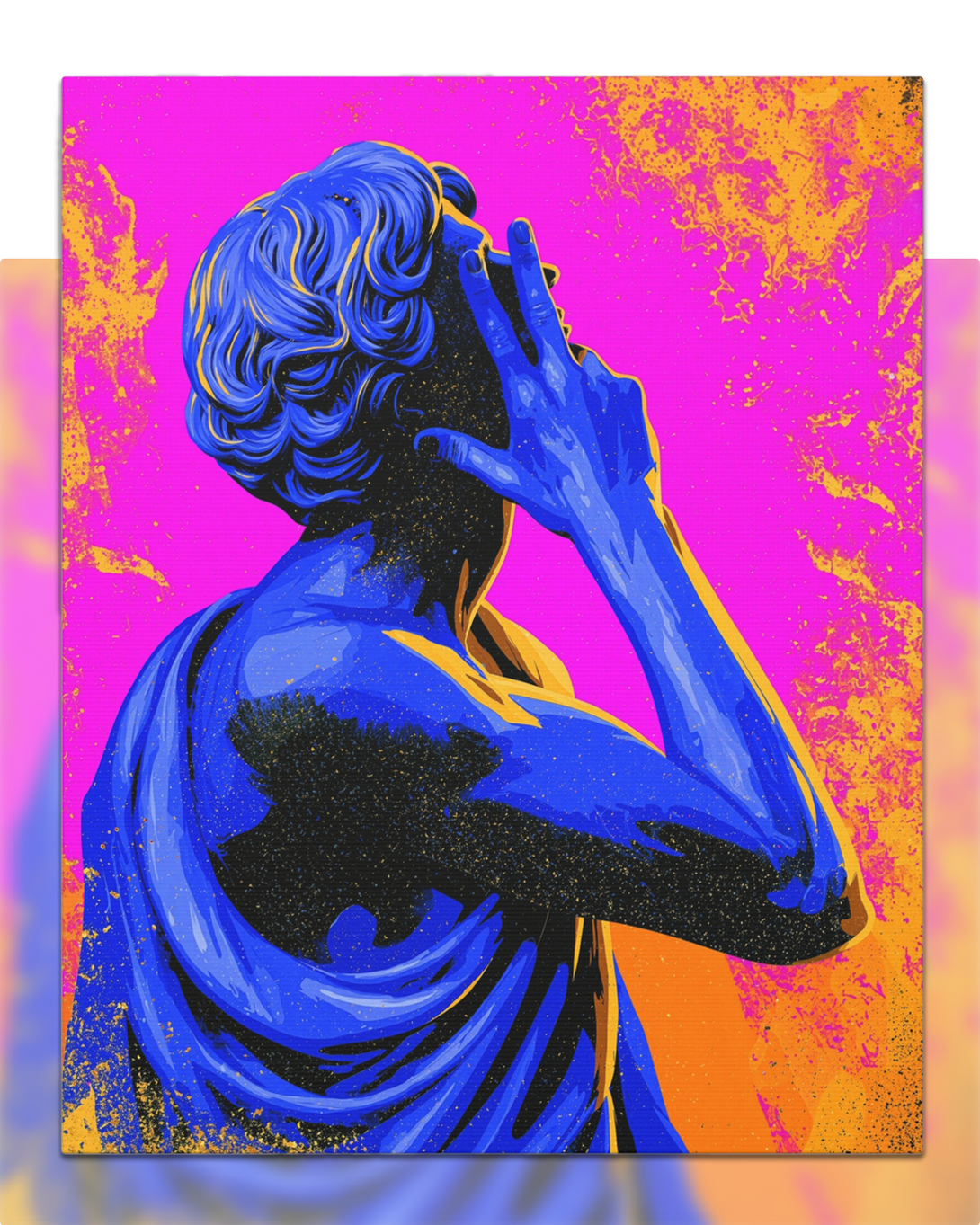 Nonverbal status update from 2,000 years ago. A cobalt-blue Roman statue throws a hand sign across hot pink and citrus orange, sprinkled with pop-grit. Museum piece meets meme energy, perfect for introverts who prefer gestures over paragraphs.