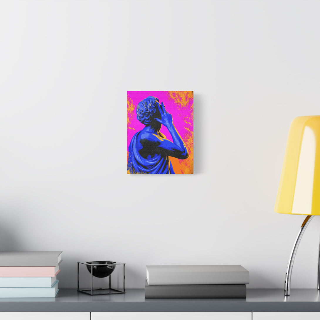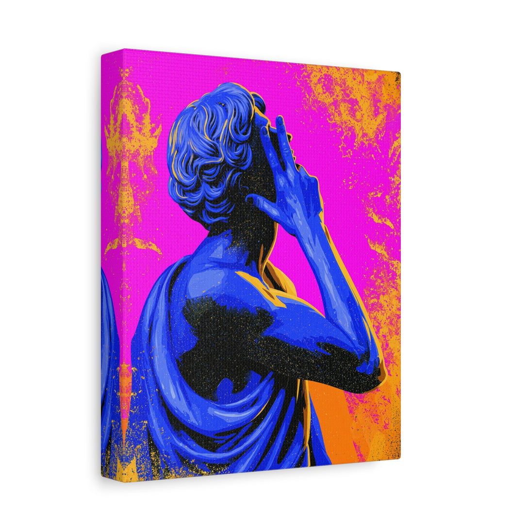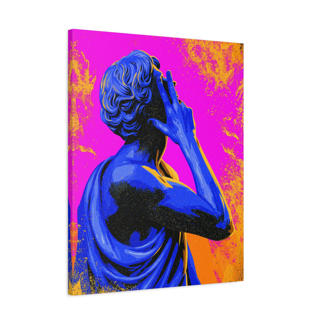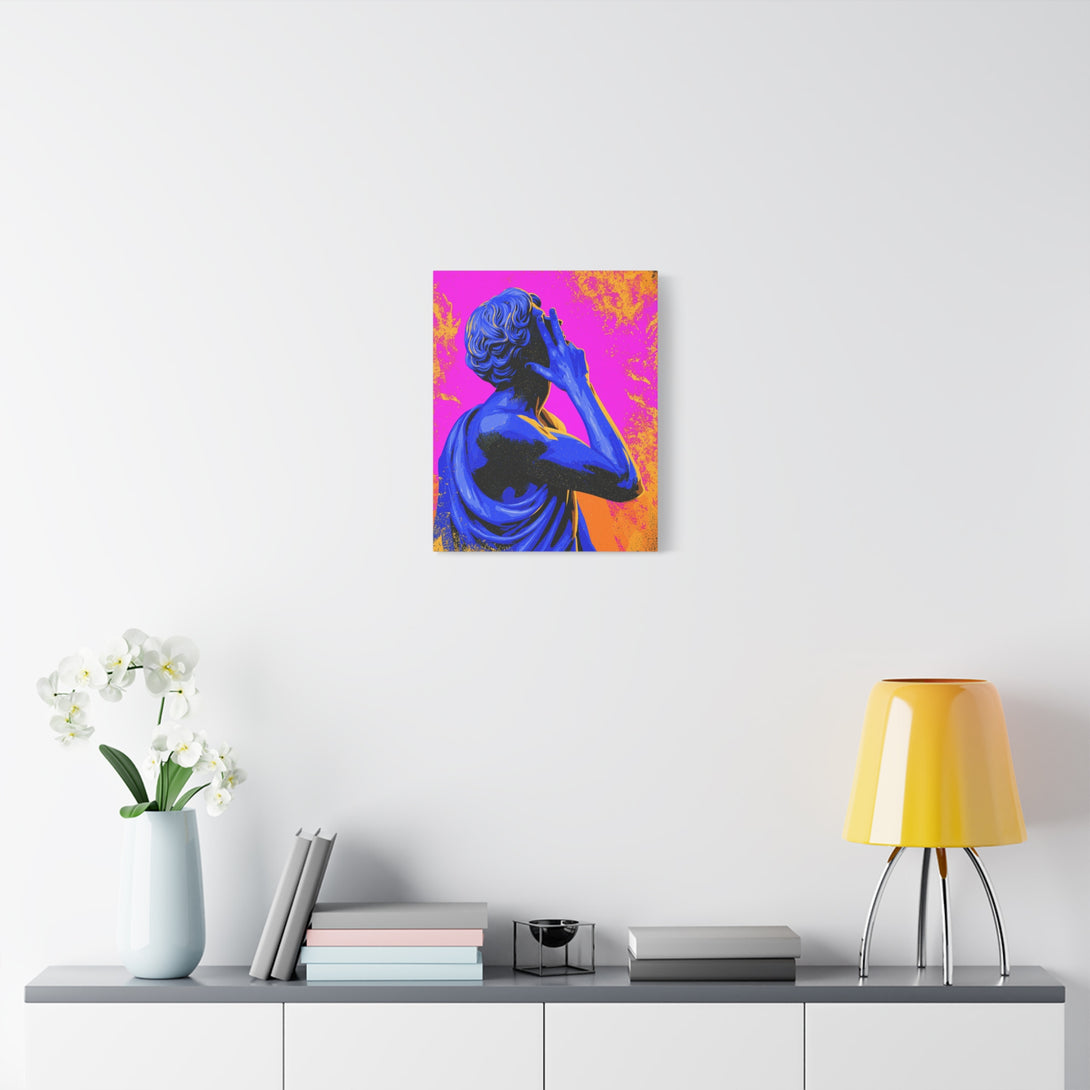 Nonverbal status update from 2,000 years ago. A cobalt-blue Roman statue throws a hand sign across hot pink and citrus orange, sprinkled with pop-grit. Museum piece meets meme energy, perfect for introverts who prefer gestures over paragraphs.