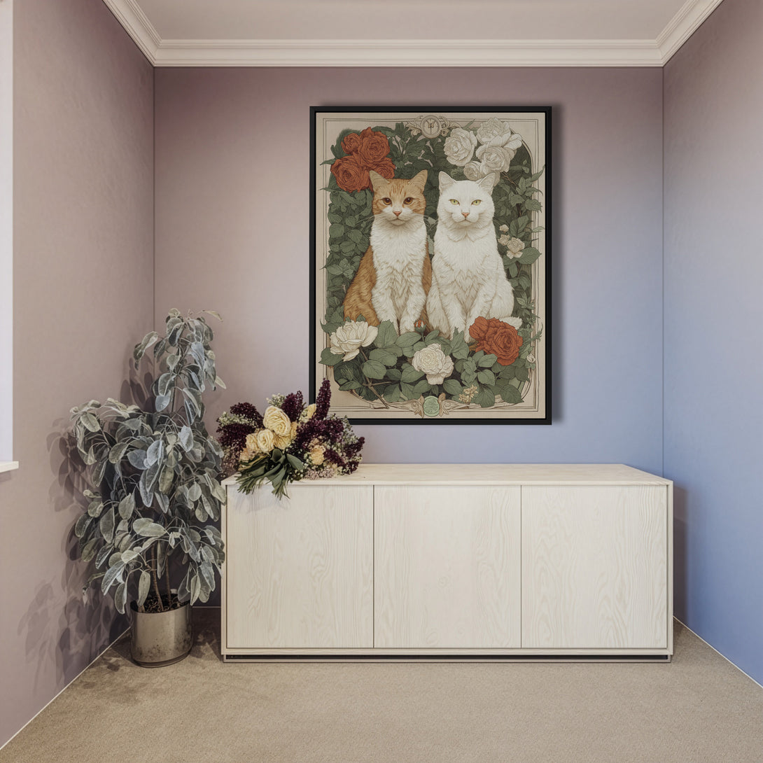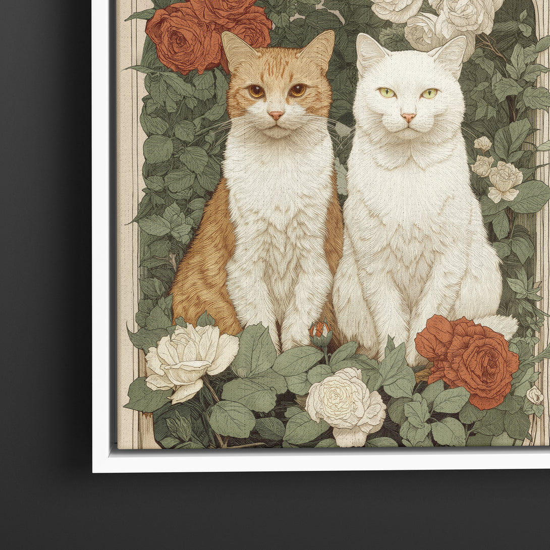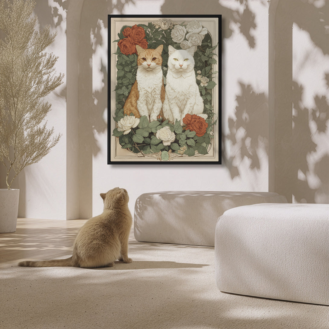 Storybook calm, two quiet cats framed by lush roses on soft old-paper tones, adding lived-in warmth without noise. Limited Release.