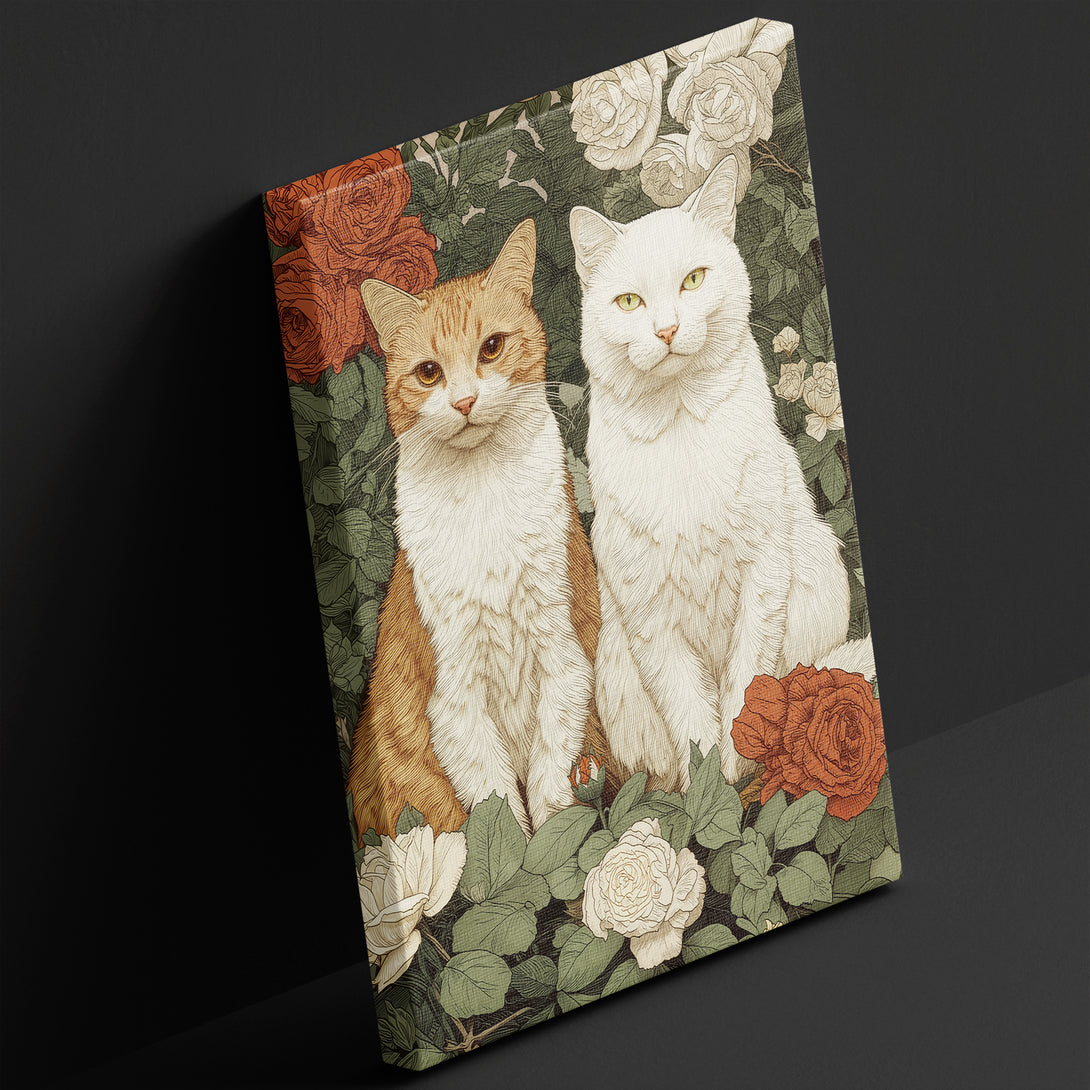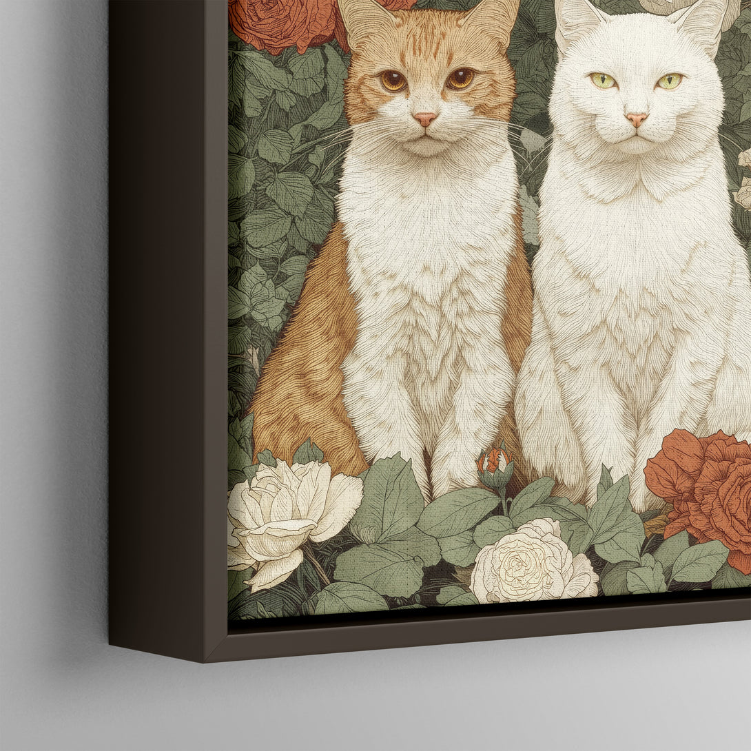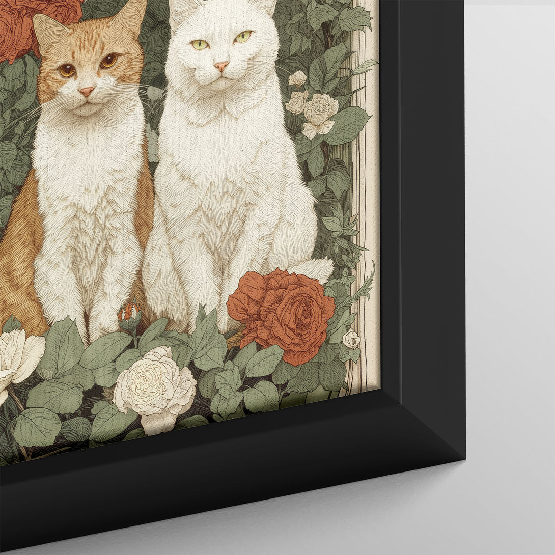 Storybook calm, two quiet cats framed by lush roses on soft old-paper tones, adding lived-in warmth without noise. Limited Release.