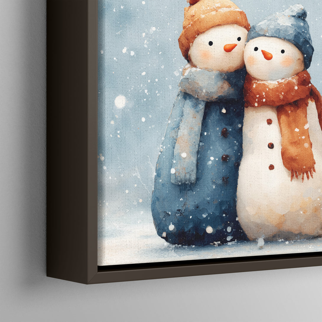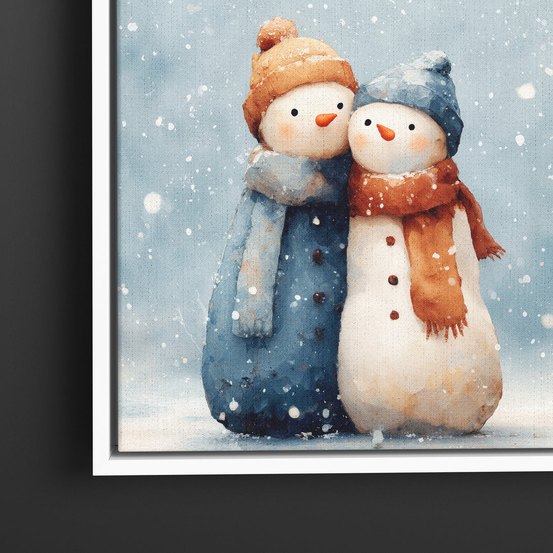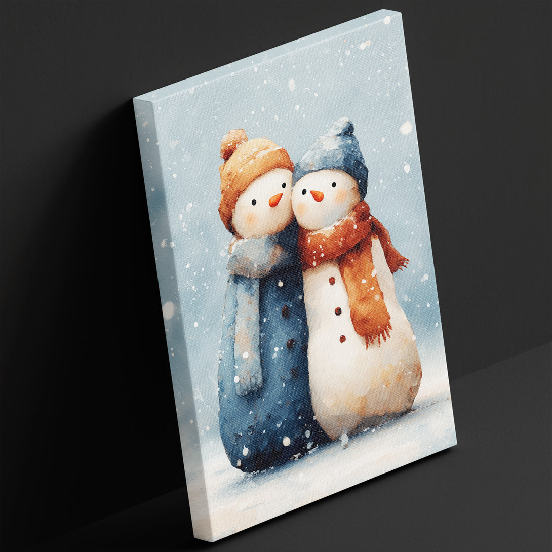 Gentle winter cheer, two cozy snowmen in blue and rust scarves lean in under falling snow, bringing warm holiday calm to the room. Limited Release.