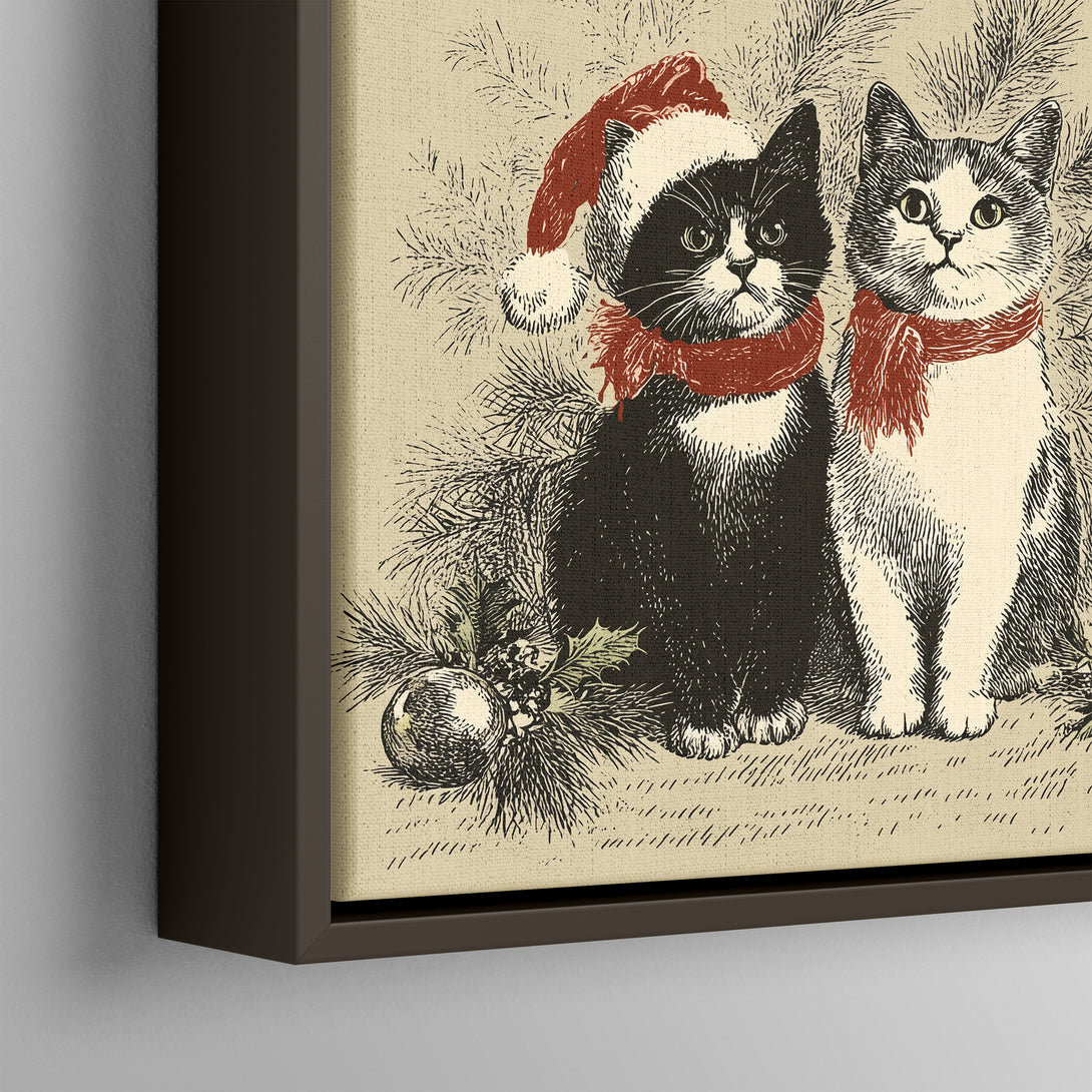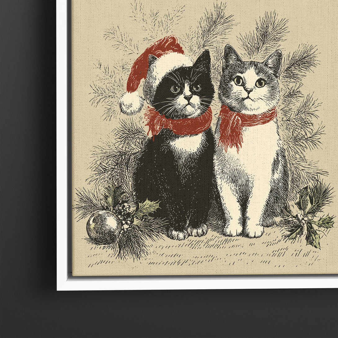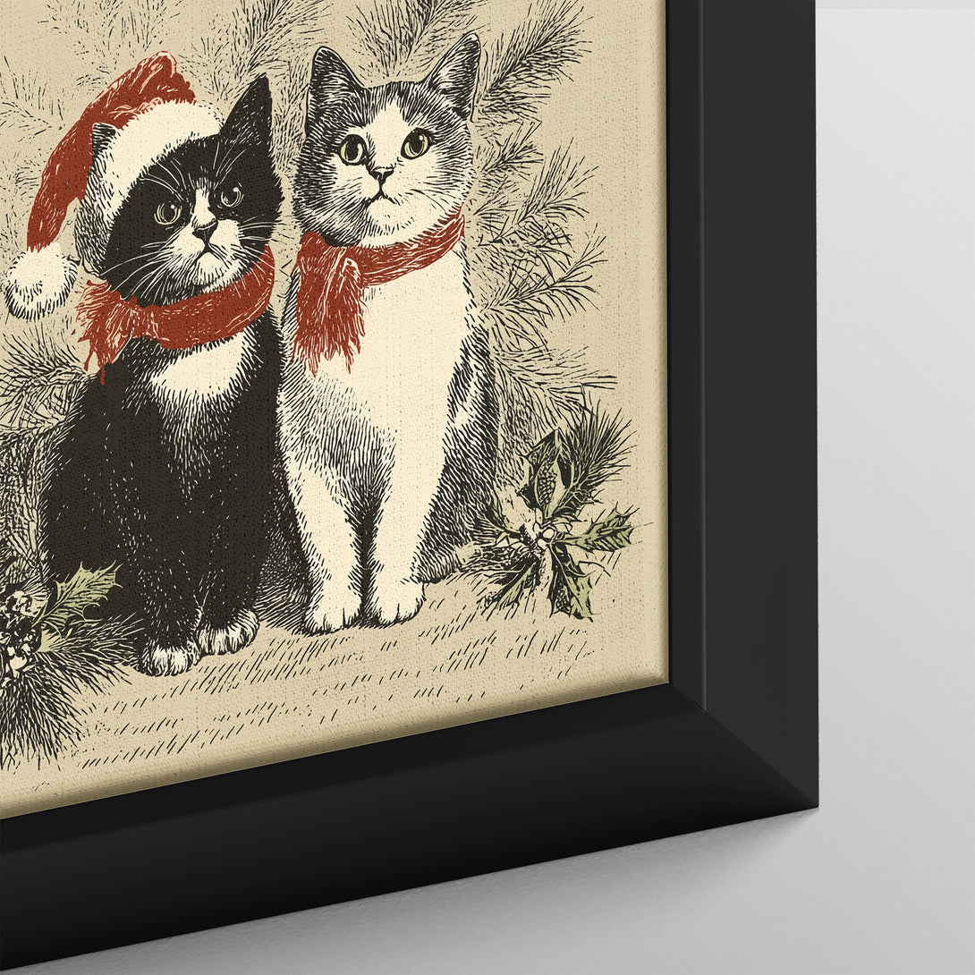 Quiet festive charm, two winter-ready cats framed by evergreen and warm neutrals, bringing a gentle holiday mood to calm rooms. Limited Release.