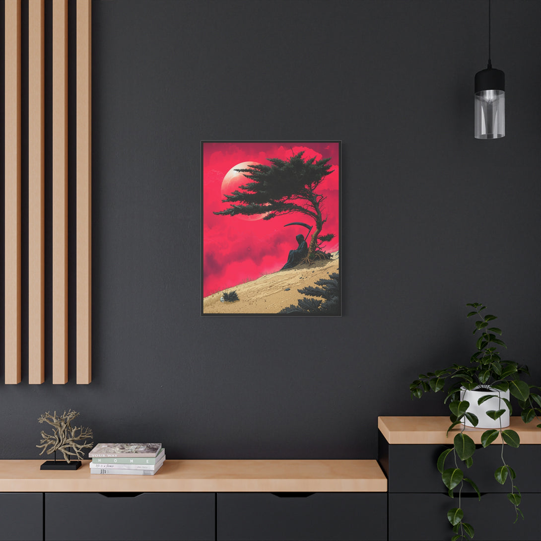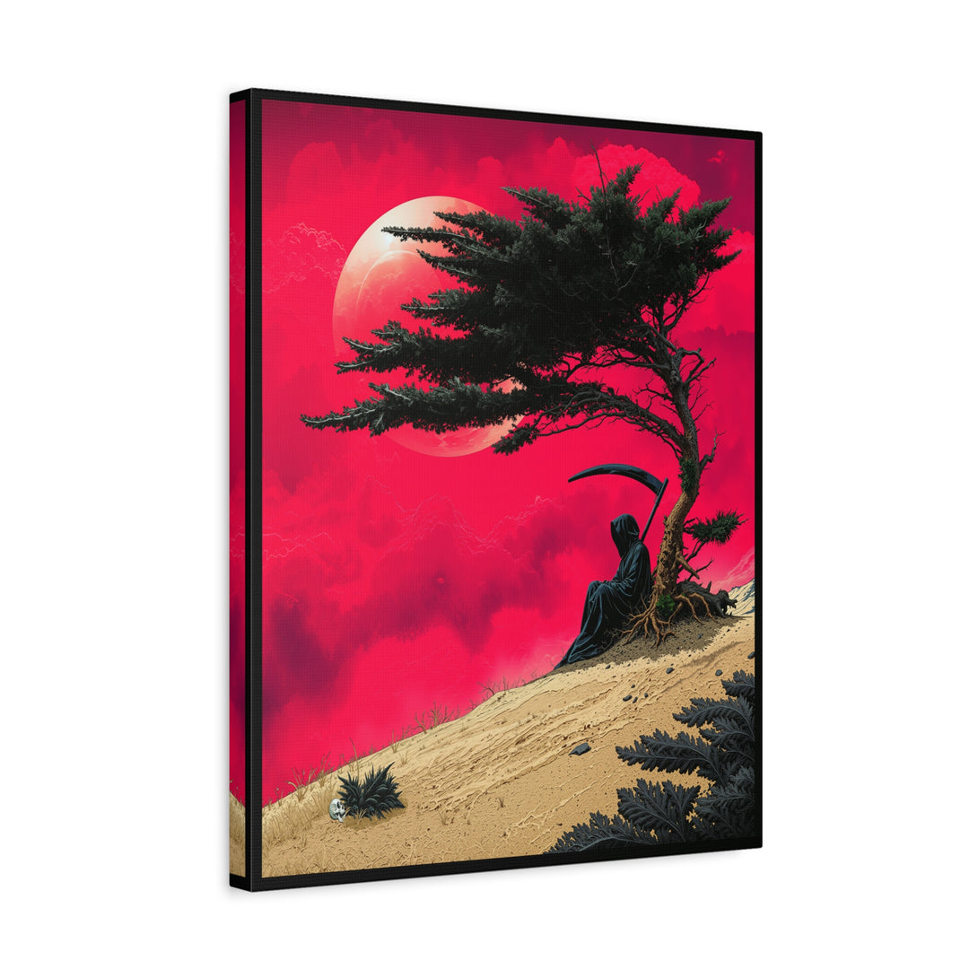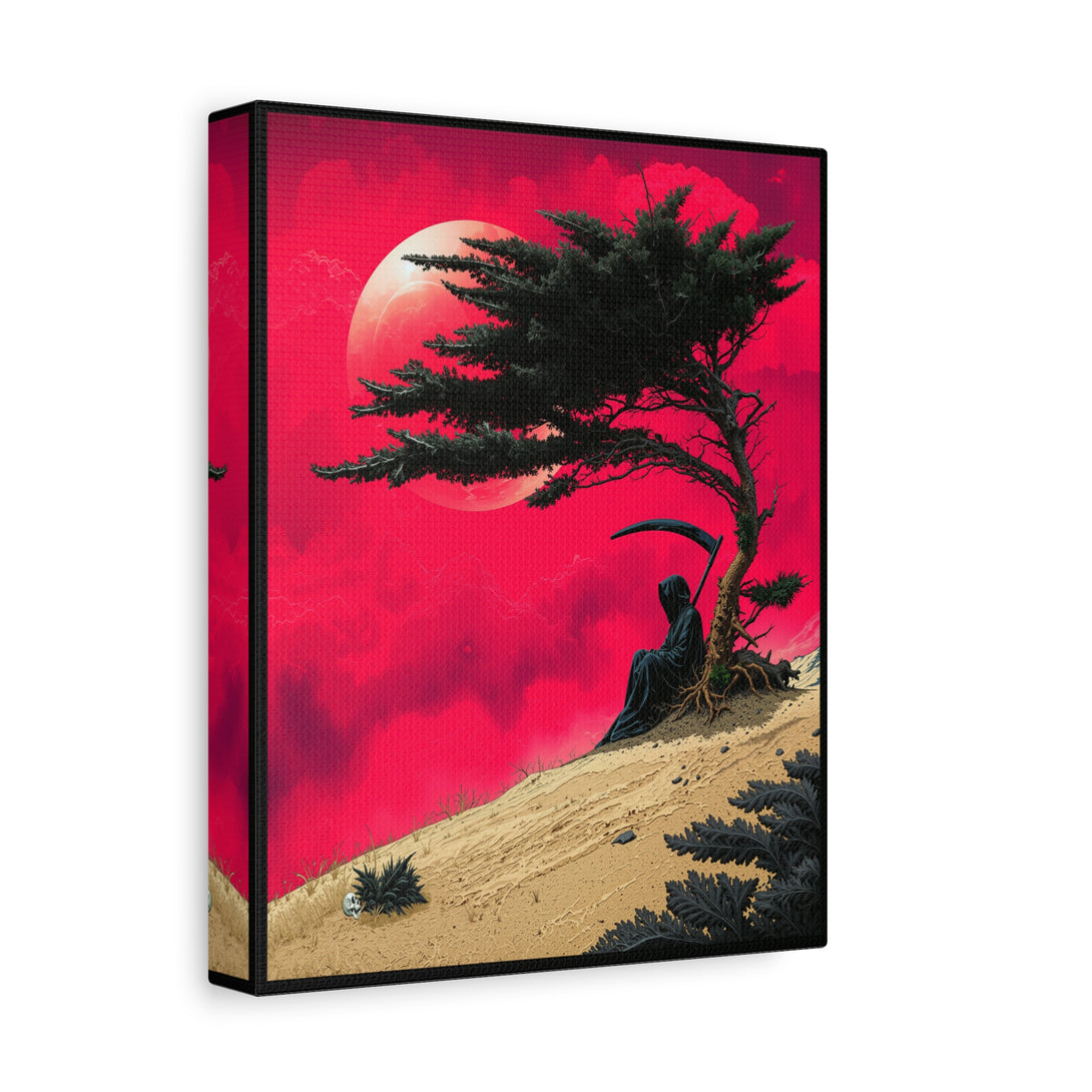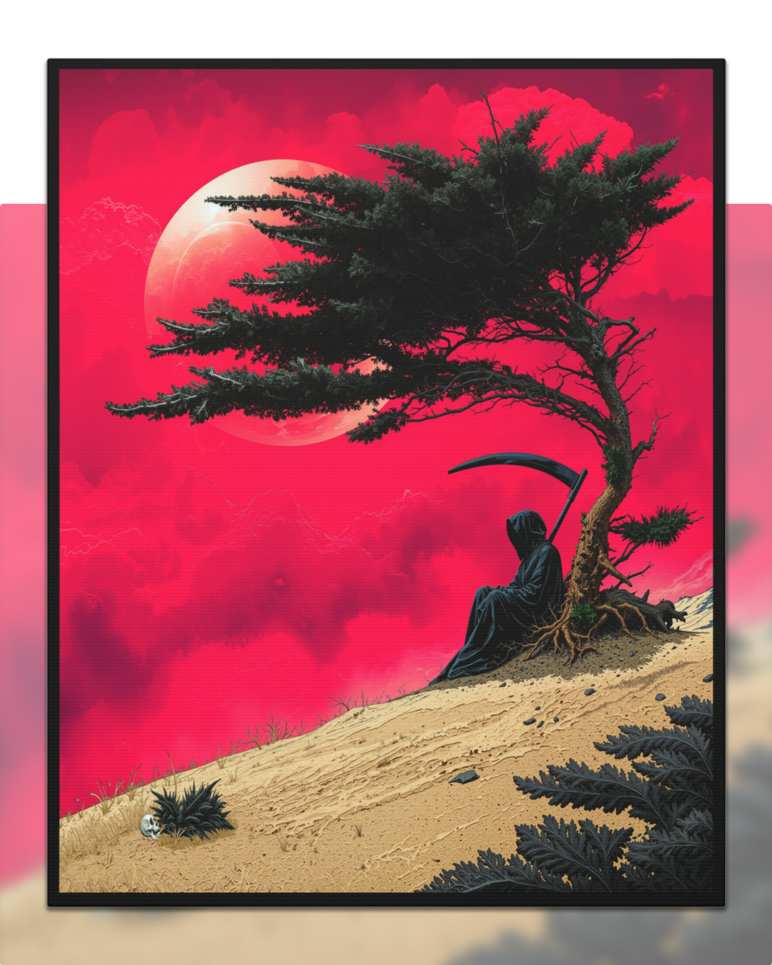 When Death is a introvert: one patch of shade under a wind-bent tree is enough temptation to cancel the whole workday. A death with a scythe sits quietly against a lone trunk, crimson sky, pale moon, sand ridge, calm, moody, and extremely “do not disturb.”