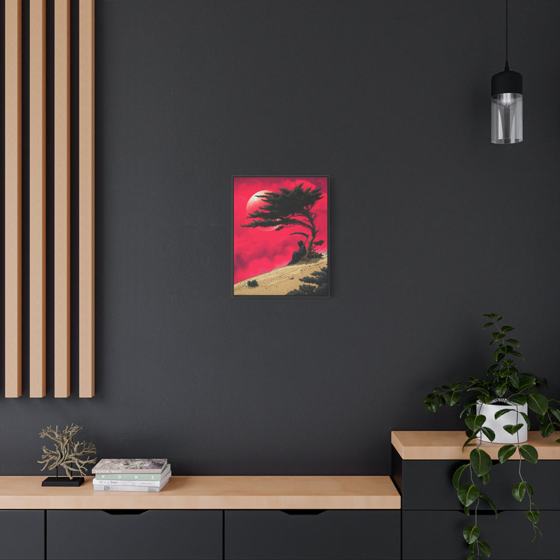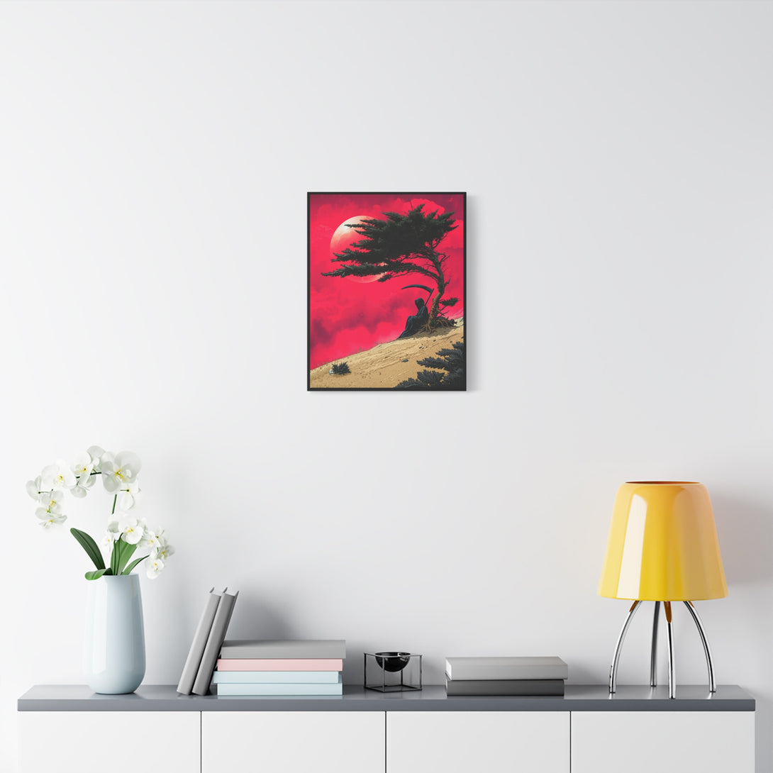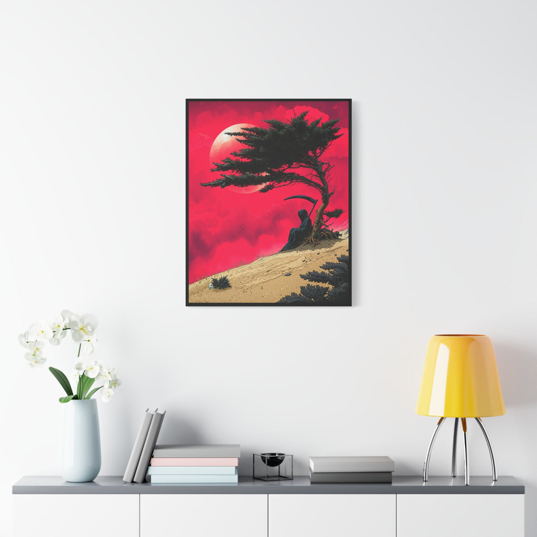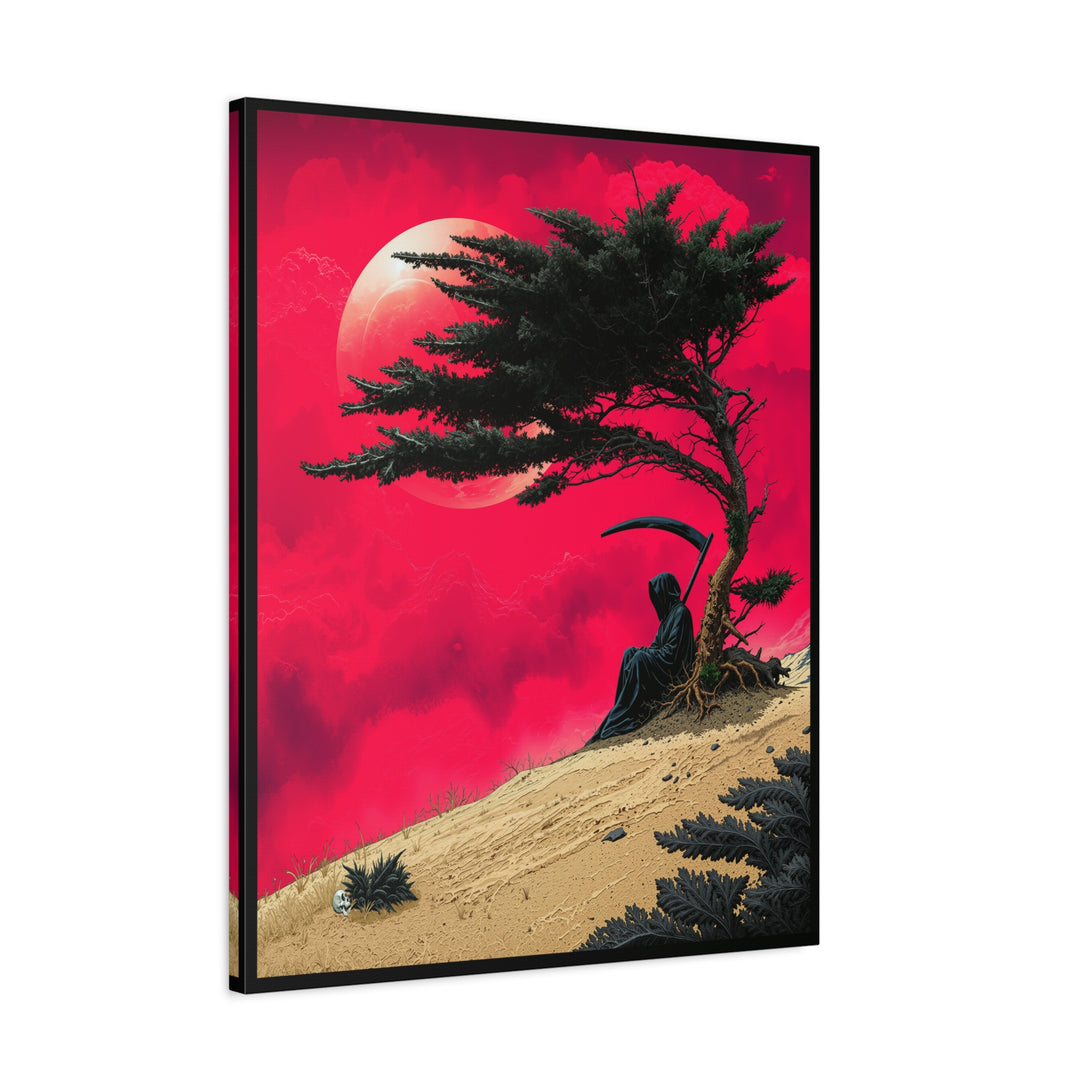 When Death is a introvert: one patch of shade under a wind-bent tree is enough temptation to cancel the whole workday. A death with a scythe sits quietly against a lone trunk, crimson sky, pale moon, sand ridge, calm, moody, and extremely “do not disturb.”