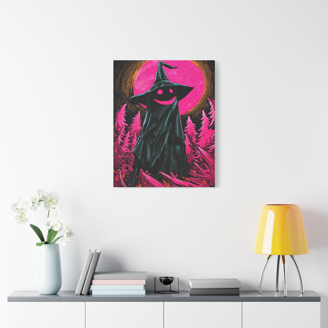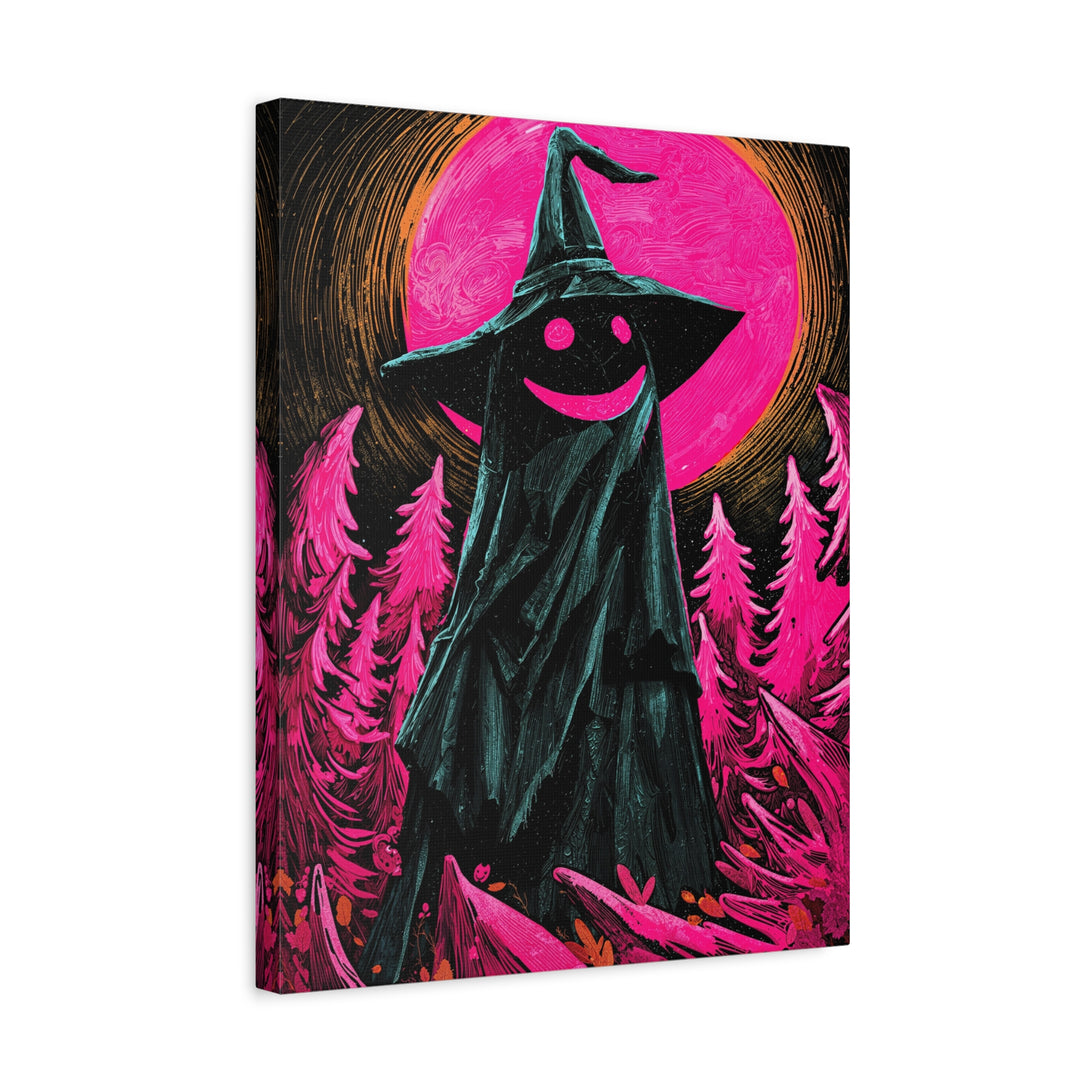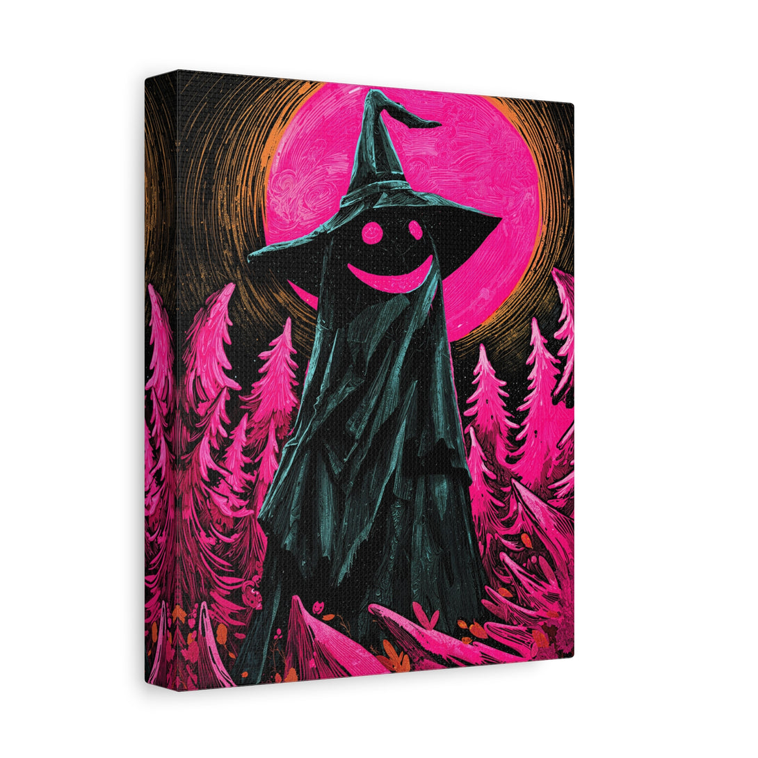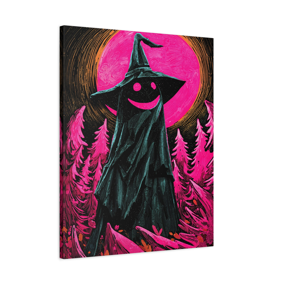 A tall witch in inky teal under a neon-pink moon, wearing the Emotitag smiley for a face, spooky-cute, low-pressure, very “Halloween but socially safe.” Forest silhouettes stay quiet while the grin does the talking.