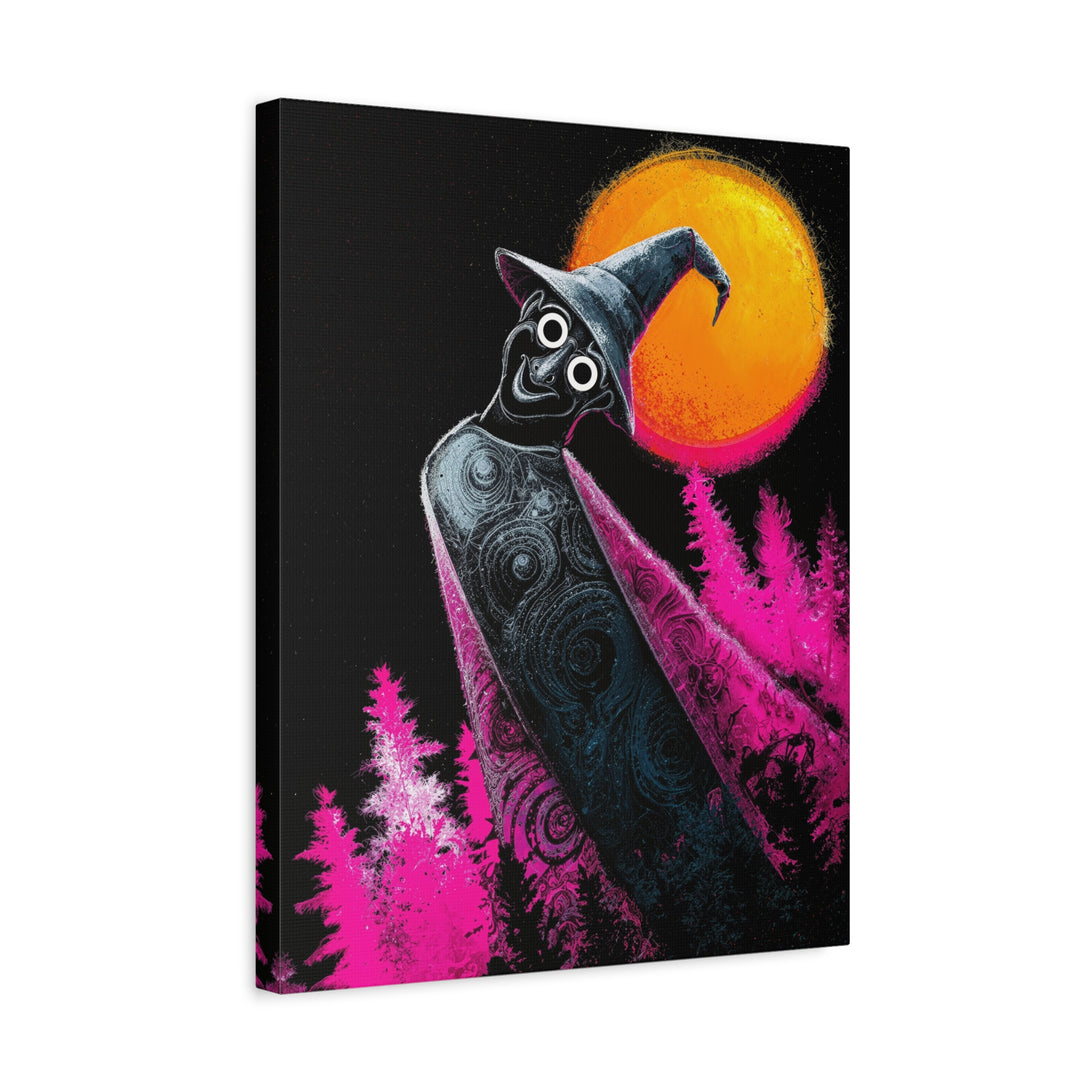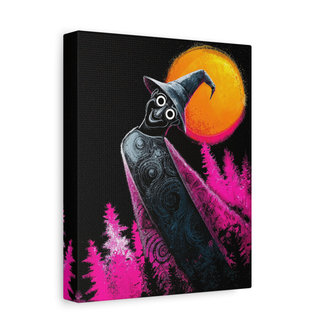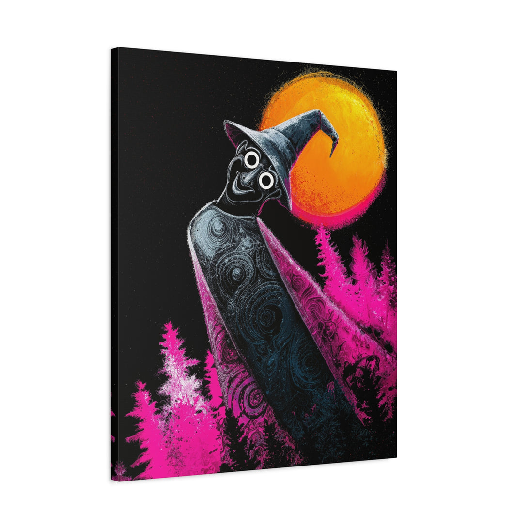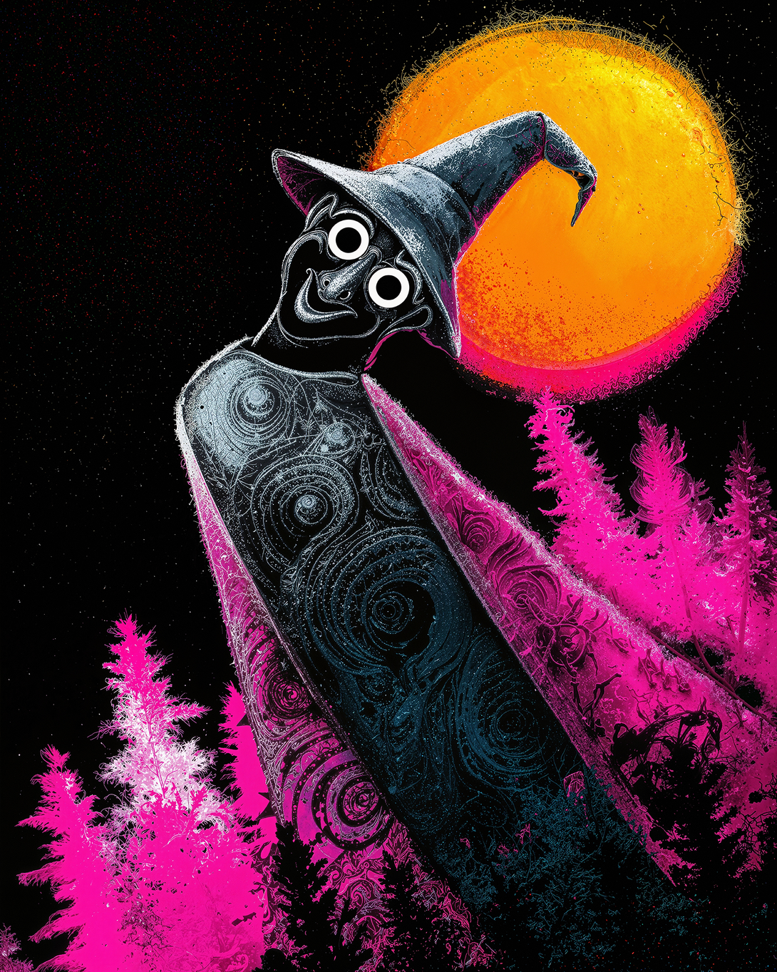 Neon moon, pink woods, one tall witch doing polite eye contact. Swirly etched cloak, midnight backdrop, spooky-cute and socially safe, like Halloween at volume 2.