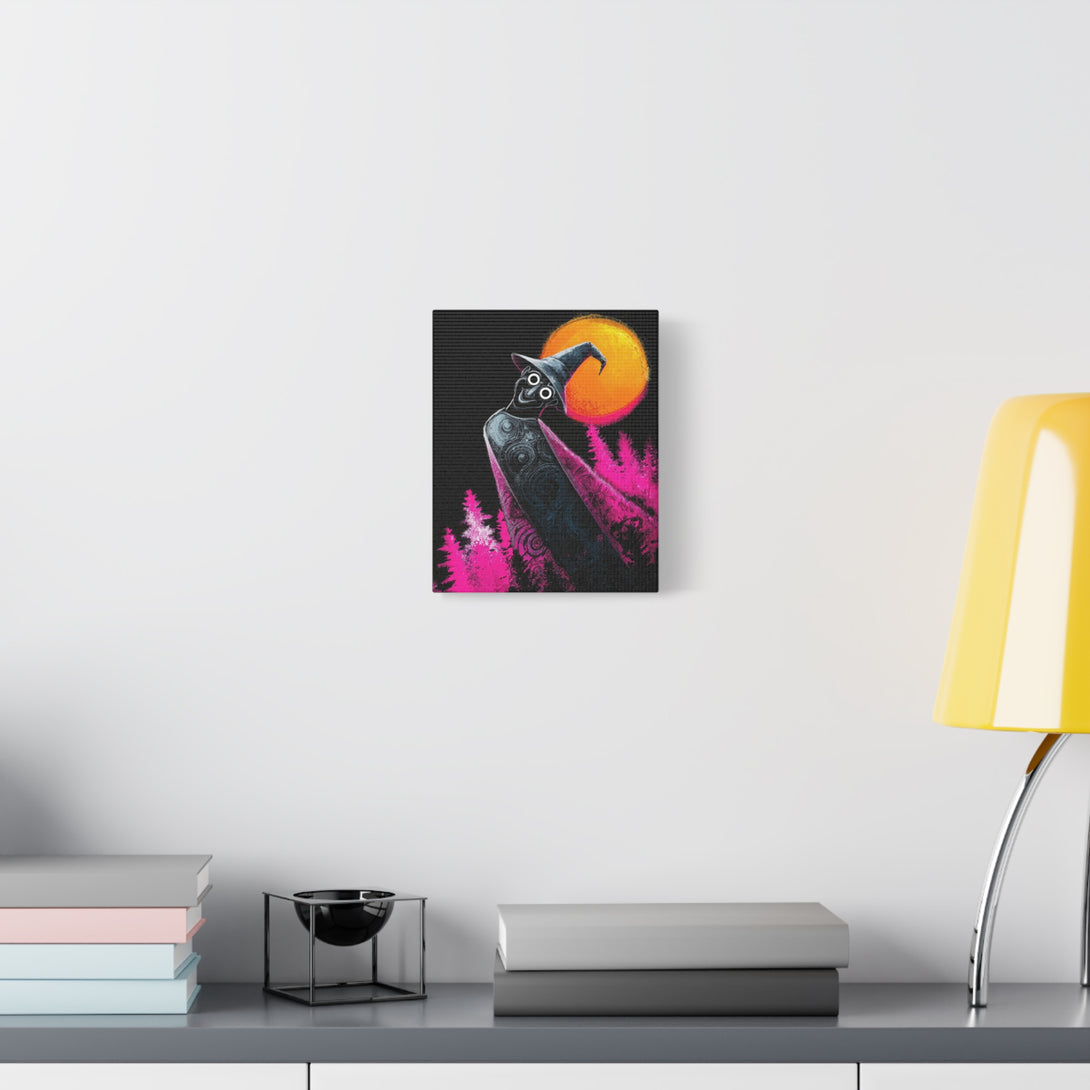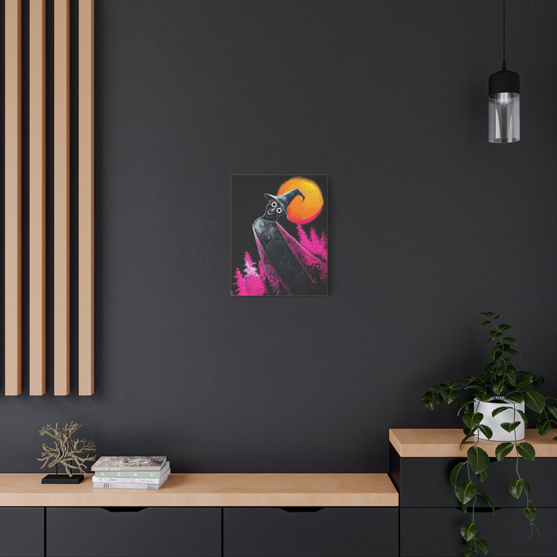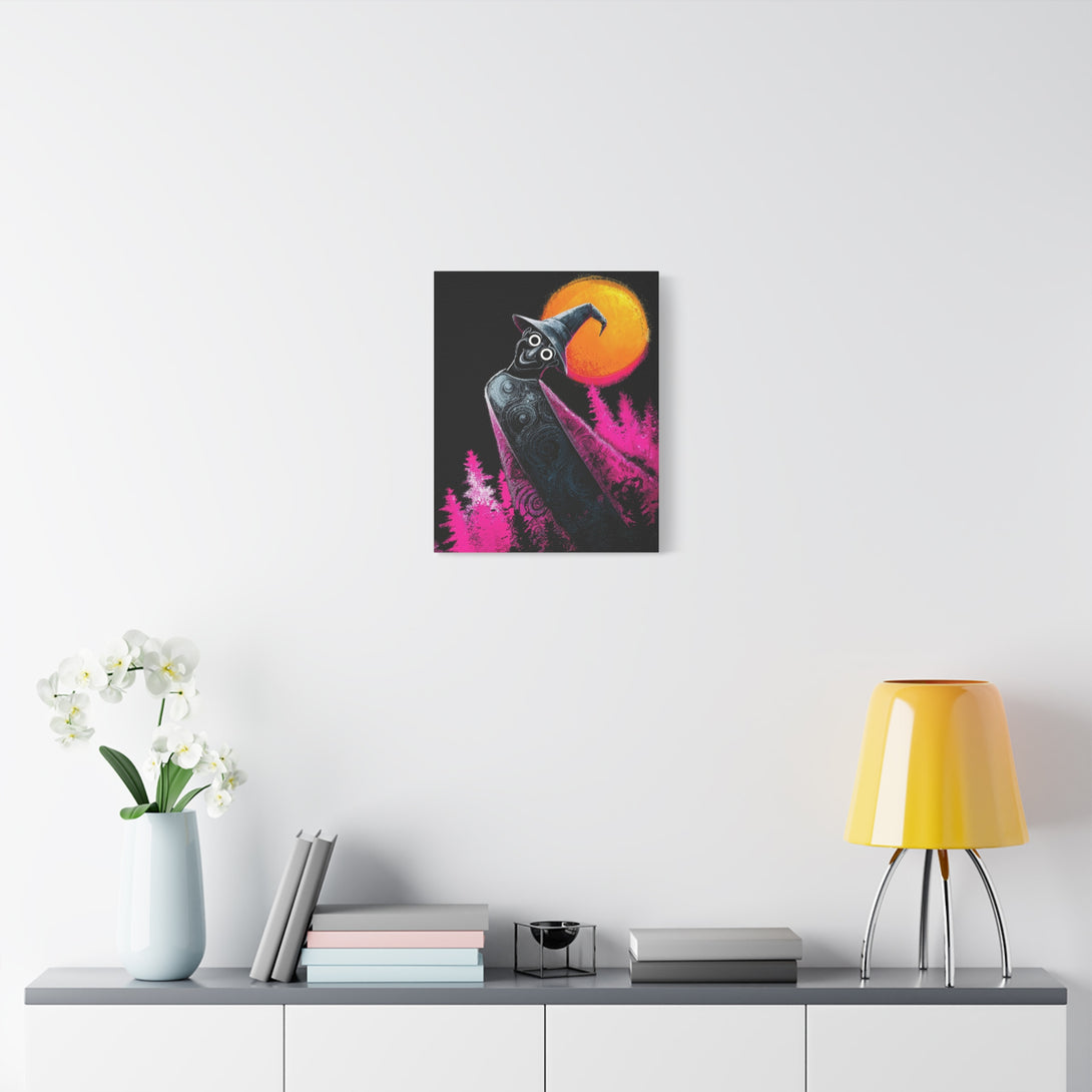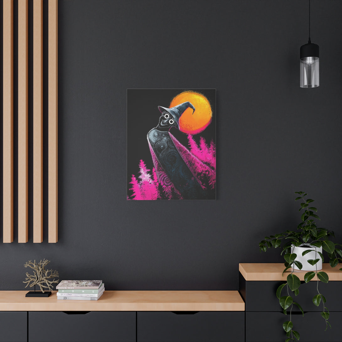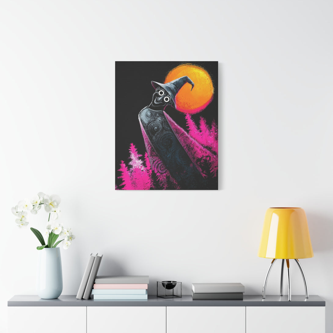 Neon moon, pink woods, one tall witch doing polite eye contact. Swirly etched cloak, midnight backdrop, spooky-cute and socially safe, like Halloween at volume 2.